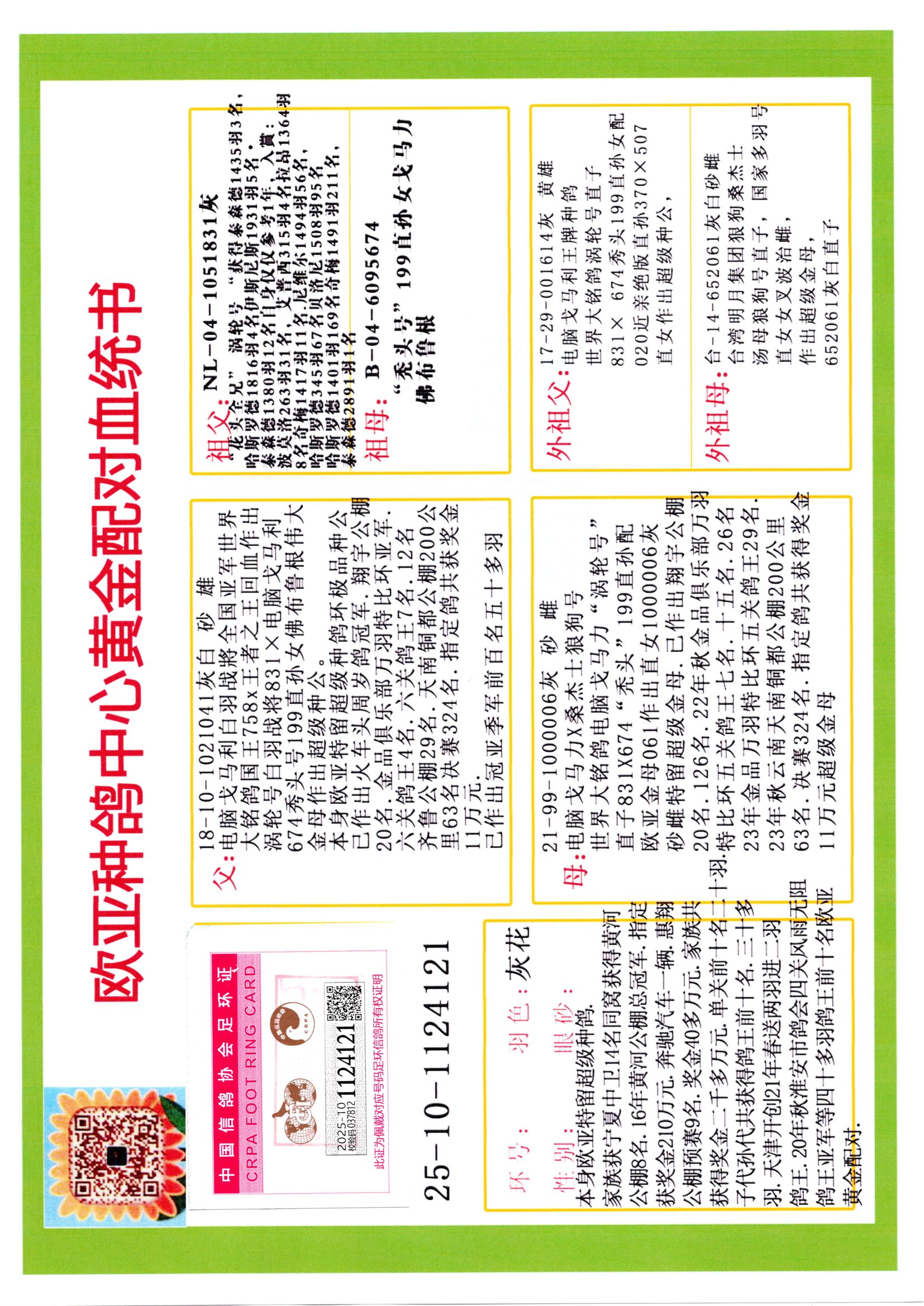24年秋南京特比環(huán)歐亞榮獲大團(tuán)體冠軍.小團(tuán)體冠軍551公里大特比13名.14名.16名.19名.20名.21名.24名.26名.27名.28名.42名.52名.54名.57名.65名.66名.68名.70名.71名.72名.74名.76名.80名.82名.83名.84名.85名.86名.90名.92名.110名.116名.121名.122名.128名.131名.158名.161名.164名.165名.166名.172名.174名.177名.182名.195名.196名.201名.205名.208名.210名.216名.253名.269名.275名.276名.294名.296名.299名,,24年秋云南天南銅都公棚決賽415名.天南銅都小棚決賽409名.云南玉活公棚決賽102名.490名.團(tuán)體32名上籠二羽進(jìn)二羽,天南銅都大棚506公里決賽445名。熱烈祝賀河北省巨鹿縣李蘭生老師用歐亞泰山號血系連續(xù)十一年奪冠軍,河北省國家賽冠軍.全國季軍等多次前十名高位,揚(yáng)州王軍王總用歐亞利奧24年春季獲山東翔宇公棚決賽33名蓋比53名。南京劉正龍劉總用歐亞蓋比獲得24年秋山東濰坊國際公棚決賽42名.精英賽30名.三關(guān)鴿王71名.決賽86名.加站賽16名.南京市特比環(huán)A組鴿王9名.B組鴿王5名.6名.C組鴿王5名.精英賽冠軍4名.技能賽A組冠軍4名.5名.秦淮區(qū)特比環(huán)榮獲15名.46名.48名.87名。四川西昌徐亮徐總用歐亞利奧獲得涼山州聚友決賽177名.第二關(guān)亞軍雙關(guān)鴿王19名.三關(guān)鴿王105名.云南豪庭公棚決賽603名。熱烈祝賀24年四川重慶翔園鴿舍用歐亞泰山號榮獲春季400公里冠軍.秋季500公里冠軍,河北王總用詹森X利奧獲得千羽千翔公棚400公里冠軍,廣東蔡楷煥榮獲24年秋愛好者 賽鴿俱樂部三關(guān)鴿王季軍.一關(guān)420公里99名.二關(guān)450公里11名.三關(guān)520公里32名.單關(guān)季軍.7名.12名,江西李衛(wèi)興榮獲貴州紅楓公棚8名.共翔俱樂部寄養(yǎng)棚四關(guān)綜合鴿王30名.一關(guān)400公里78名.二關(guān)500公里55名.三關(guān)520公里37名.四關(guān)500公里57名.同父母獲公棚18名.雷鳴獲得武漢黃浦育翔中心冠軍,四川陳文獲得四川明鴻俱樂部300公里夢幻2名.3名.4名.9名.10名.13名.14名.15名.31名.34名.40名.41名.42名.43名.69名.71名.72名.73名.74名.94名.95名.97名.98名.99名.419公里決賽榮獲總冠軍7名.總共歸巢9羽,四川徐亮獲豪庭決賽603名,山西鄭勇獲得山西泰鑫公棚決賽255名詹森紅狐,熱烈祝賀馬總獲得開爾(飛躍隊(duì))決賽9名獲獎(jiǎng)金1310000萬元.第一關(guān)52名,天津津福資賽180公里96名.獲獎(jiǎng)金429543萬元,歐亞支持全國鴿友24年秋多人報(bào)喜 祝大家取得更好成績,給歐亞報(bào)喜鴿友歐亞決定給每人贈(zèng)送一羽超級種鴿。歐亞俱樂部特比環(huán)多關(guān)鴿王成績:15年秋淮安特比環(huán)黑色星期一全會(huì)上籠9700多羽,當(dāng)天無鴿歸巢,第二天全會(huì)歸巢357羽,本舍歸巢158羽.前十名八羽.前一百名歸巢57羽,16年春季獲五關(guān)鴿王總冠軍,總亞軍四名.六名.七名.九名.十名.晶藝俱樂部520公里冠亞季軍5名.6名.7名.9名.11名等,火車頭冠軍.季軍6名.8名.9名.10名,16年秋晶藝俱樂部特比環(huán)520公里亞軍.季軍4名.6名.7名.9名,15年春南京白下特比環(huán)冠軍.亞軍5名.6名.8名前三百名獲獎(jiǎng)53羽,團(tuán)體冠軍.亞軍.16年春南京江北三區(qū)特比環(huán)上籠58羽前二百名進(jìn)獎(jiǎng)46羽亞軍.季軍6名.7名.8名.9名.10名.指定鴿A B組獲得冠軍.亞軍.季軍4名.5名.,17年淮安特比環(huán)亞軍.4名.5名.7名.8名.10名.六關(guān)鴿王總冠軍.4名.6名.9名.10名,寄養(yǎng)棚宿遷劉總20羽特比環(huán)獲冠軍.季軍.4名.7名.