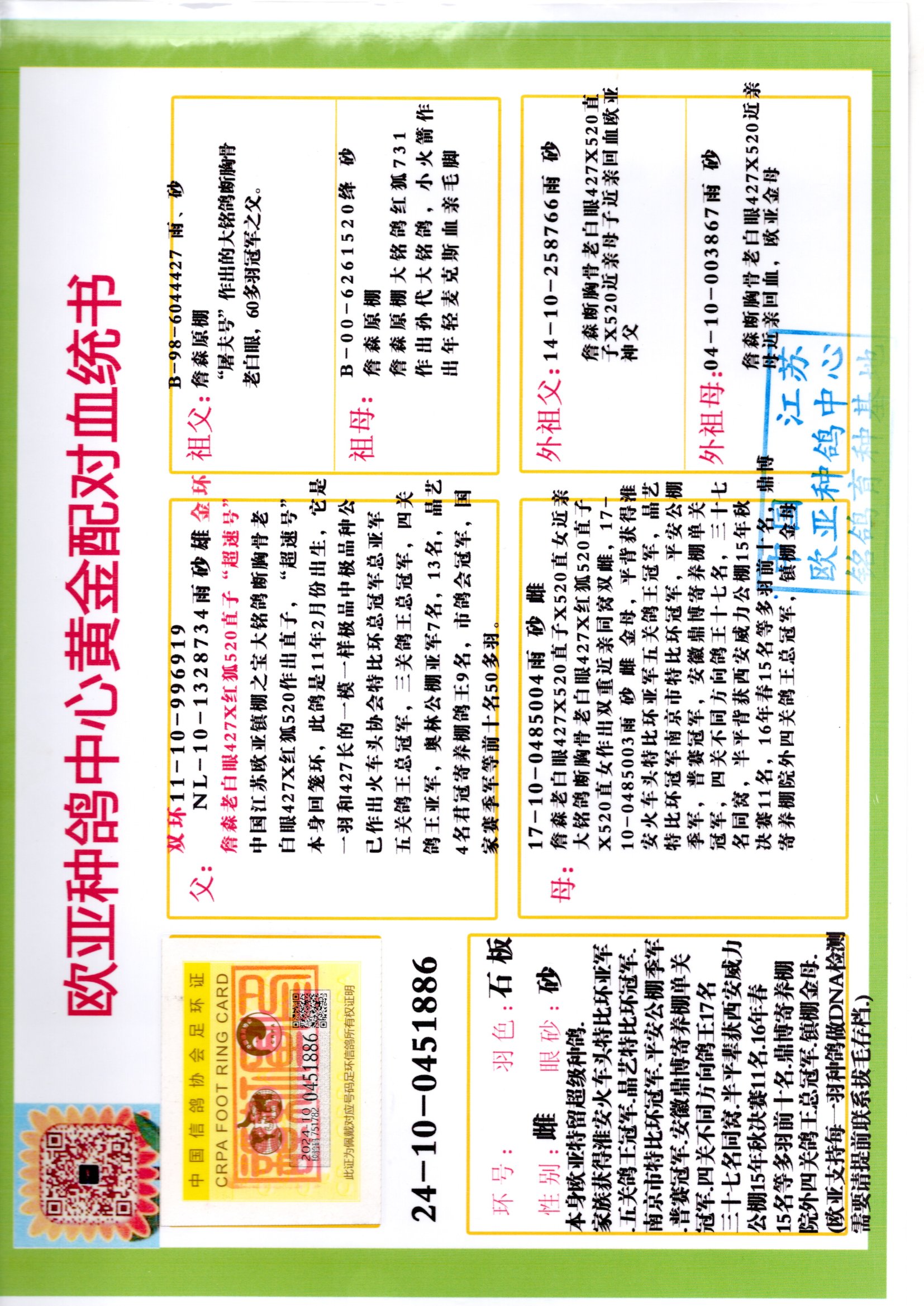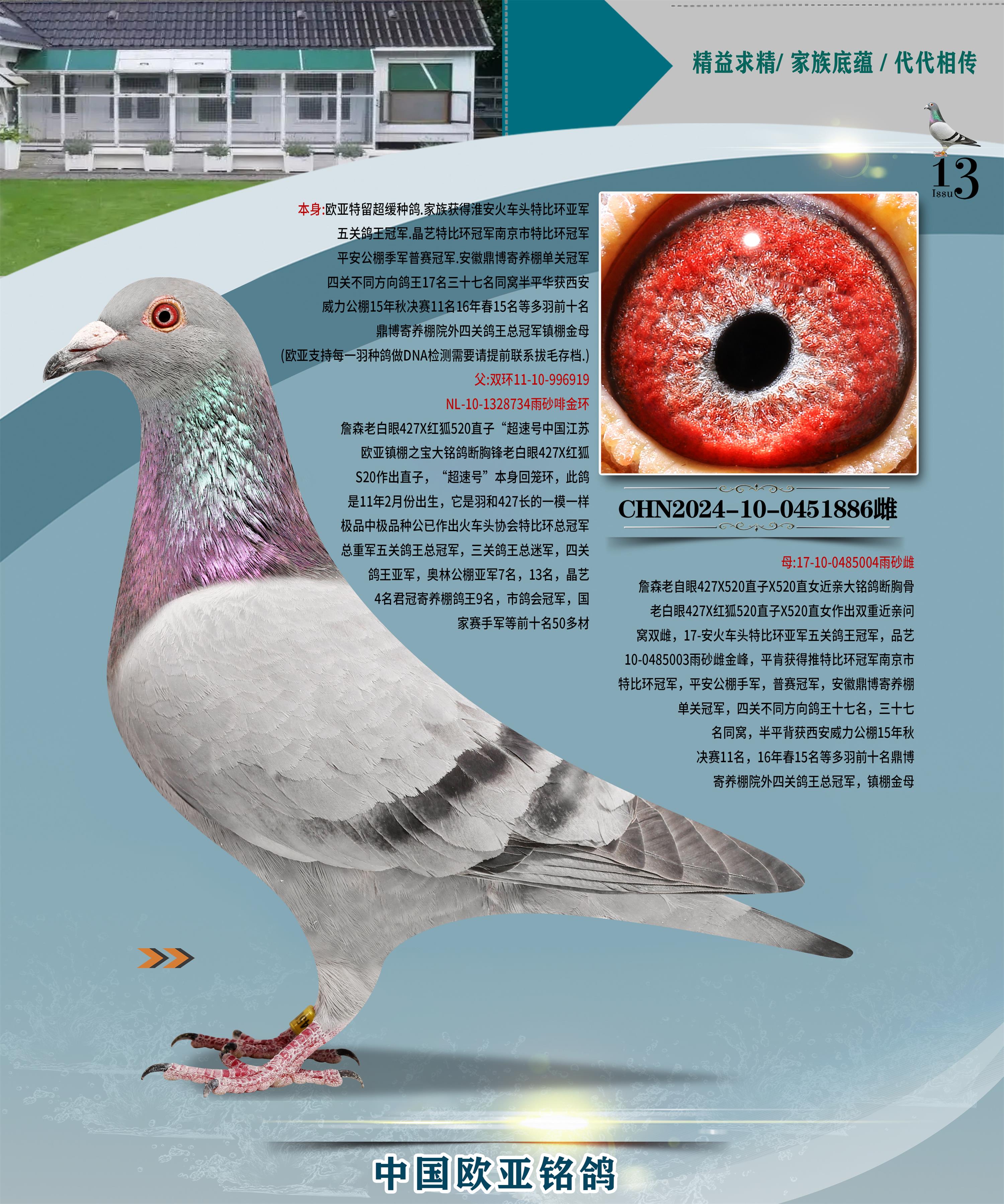 24年秋南京特比環(huán)歐亞榮獲大團(tuán)體冠軍.小團(tuán)體冠軍551公里大特比13名.14名.16名.19名.20名.21名.24名.26名.27名.28名.42名.52名.54名.57名.65名.66名.68名.70名.71名.72名.74名.76名.80名.82名.83名.84名.85名.86名.90名.92名.110名.116名.121名.122名.128名.131名.158名.161名.164名.165名.166名.172名.174名.177名.182名.195名.196名.201名.205名.208名.210名.216名.253名.269名.275名.276名.294名.296名.299名,,24年秋云南天南銅都公棚決賽415名.天南銅都小棚決賽409名.云南玉活公棚決賽102名.490名.團(tuán)體32名上籠二羽進(jìn)二羽,天南銅都大棚506公里決賽445名。熱烈祝賀河北省巨鹿縣李蘭生老師用歐亞泰山號血系連續(xù)十一年奪冠軍,河北省國家賽冠軍.全國季軍等多次前十名高位,揚(yáng)州王軍王總用歐亞利奧24年春季獲山東翔宇公棚決賽33名蓋比53名。南京劉正龍劉總用歐亞蓋比獲得24年秋山東濰坊國際公棚決賽42名.精英賽30名.三關(guān)鴿王71名.決賽86名.加站賽16名.南京市特比環(huán)A組鴿王9名.B組鴿王5名.6名.C組鴿王5名.精英賽冠軍4名.技能賽A組冠軍4名.5名.秦淮區(qū)特比環(huán)榮獲15名.46名.48名.87名。四川西昌徐亮徐總用歐亞利奧獲得涼山州聚友決賽177名.第二關(guān)亞軍雙關(guān)鴿王19名.三關(guān)鴿王105名.云南豪庭公棚決賽603名。熱烈祝賀24年四川重慶翔園鴿舍用歐亞泰山號榮獲春季400公里冠軍.秋季500公里冠軍,河北王總用詹森X利奧獲得千羽千翔公棚400公里冠軍,廣東蔡楷煥榮獲24年秋愛好者 賽鴿俱樂部三關(guān)鴿王季軍.一關(guān)420公里99名.二關(guān)450公里11名.三關(guān)520公里32名.單關(guān)季軍.7名.12名,江西李衛(wèi)興榮獲貴州紅楓公棚8名.共翔俱樂部寄養(yǎng)棚四關(guān)綜合鴿王30名.一關(guān)400公里78名.二關(guān)500公里55名.三關(guān)520公里37名.四關(guān)500公里57名.同父母獲公棚18名.雷鳴獲得武漢黃浦育翔中心冠軍,四川陳文獲得四川明鴻俱樂部300公里夢幻2名.3名.4名.9名.10名.13名.14名.15名.31名.34名.40名.41名.42名.43名.69名.71名.72名.73名.74名.94名.95名.97名.98名.99名.419公里決賽榮獲總冠軍7名.總共歸巢9羽,四川徐亮獲豪庭決賽603名,山西鄭勇獲得山西泰鑫公棚決賽255名詹森紅狐,熱烈祝賀馬總獲得開爾(飛躍隊)決賽9名獲獎金1310000萬元.第一關(guān)52名,天津津福資賽180公里96名.獲獎金429543萬元,歐亞支持全國鴿友24年秋多人報喜 祝大家取得更好成績,給歐亞報喜鴿友歐亞決定給每人贈送一羽超級種鴿。歐亞俱樂部特比環(huán)多關(guān)鴿王成績:15年秋淮安特比環(huán)黑色星期一全會上籠9700多羽,當(dāng)天無鴿歸巢,第二天全會歸巢357羽,本舍歸巢158羽.前十名八羽.前一百名歸巢57羽,16年春季獲五關(guān)鴿王總冠軍,總亞軍四名.六名.七名.九名.十名.晶藝俱樂部520公里冠亞季軍5名.6名.7名.9名.11名等,火車頭冠軍.季軍6名.8名.9名.10名,16年秋晶藝俱樂部特比環(huán)520公里亞軍.季軍4名.6名.7名.9名,15年春南京白下特比環(huán)冠軍.亞軍.季軍6名.7名.8名.9名.10名.指定鴿A B組獲得冠軍.亞軍.季軍4名.5名.,17年淮安特比環(huán)亞軍.4名.5名.7名.8名.10名.六關(guān)鴿王總冠軍.4名.6名.9名.10名,寄養(yǎng)棚宿遷劉總20羽特比環(huán)獲冠軍.季軍.4名.7名.8名.9名等。18年榮獲萬羽特比環(huán)六關(guān)鴿王總冠軍.總亞軍.總季軍.6名.8名.十名.單關(guān)四羽冠軍.二羽亞軍.四羽季軍.前十名27羽。19年秋萬羽特比環(huán)六關(guān)鴿王總亞軍.總季軍.5名.8名等,單關(guān)二羽冠軍.三羽亞軍.一羽季軍前十名31羽。20年秋淮安市鴿會四關(guān)特比環(huán)大賽風(fēng)雨無阻鴿王亞軍.鴿王六名,金品俱樂部萬羽特比環(huán)六關(guān)鴿王總冠軍,總亞軍.四名.五名.六名.七名.八名.十名.前二百名鴿王35羽,單關(guān)冠亞季軍前十名四十多羽,火車頭五關(guān)鴿王季軍.六名.八名.前二百名鴿王十七羽。20年春榮獲淮安五區(qū)一市四關(guān)鴿王總冠軍.亞軍.四名.八名.九名。21年秋榮獲金品萬羽特比環(huán)大賽六關(guān)鴿王總亞軍.總季軍.四名.七名.九名.十名.單關(guān)冠亞軍季軍前十名三十多羽。火車頭協(xié)會鴿王六名.七名.十名.單關(guān)前十名十七羽。22年秋榮獲鴿王總冠軍.總亞軍.5名.7名.8名.9名.11名.單關(guān)冠亞季軍前十名三十多羽,第一關(guān)單關(guān)前二百名四十多羽,第二關(guān)前二百名三十多羽,第三關(guān)前二百名四十多羽,第四關(guān)前二百名四十多羽,第五關(guān)前一百名53羽。23年秋榮獲鴿王季軍.五名.八名.十名.13名.17名.20名.27名等多羽鴿王.單關(guān)前十名二十多羽。公棚.寄養(yǎng)棚部分成績:16年秋寧夏黃河公棚總冠軍電腦戈馬力指定通炮冠軍,17年送八羽參賽獲得鴿王八名進(jìn)獎四名,支持韓總榮獲八名。支持鴿友榮獲寧夏中衛(wèi)公棚決賽總冠軍.精英賽冠軍,支持18年寧夏黃河公棚決賽冠軍詹森X泰山。安徽鼎博寄養(yǎng)棚院內(nèi)外四關(guān)鴿王總冠軍.鴿王十七名.三十七名同窩,鴿王39名.42名.58名.67名。18年山東公棚預(yù)賽冠軍.決賽65名.送八羽進(jìn)獎五羽.指定獲奔馳汽車一輛。支持鴿友獲得云南藍(lán)云公棚冠軍.蓋比X佛卡門。支持鴿友榮獲云南銀集公棚決賽冠軍 詹森427X520血系 速度賽6700羽冠軍。17年榮獲金馬俱樂部寄養(yǎng)棚四關(guān)鴿王總冠軍.季軍.六名.八名.第一關(guān)冠軍.亞軍.季軍四名.七名.十一名.金牌教練獎。支