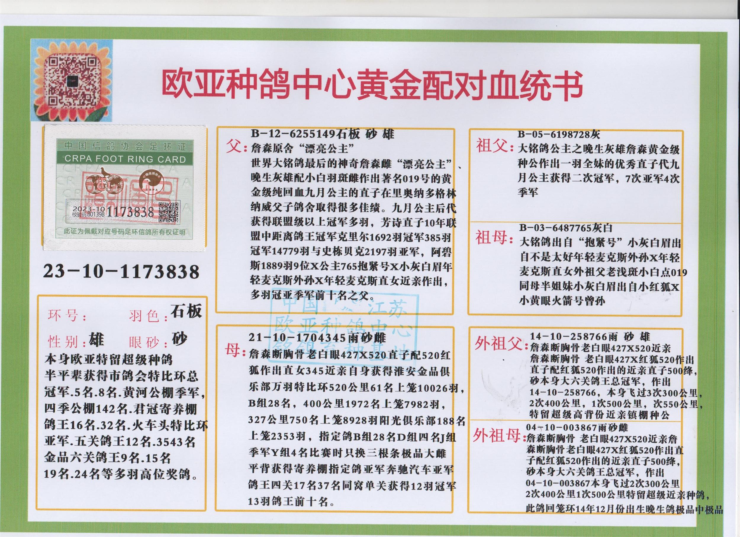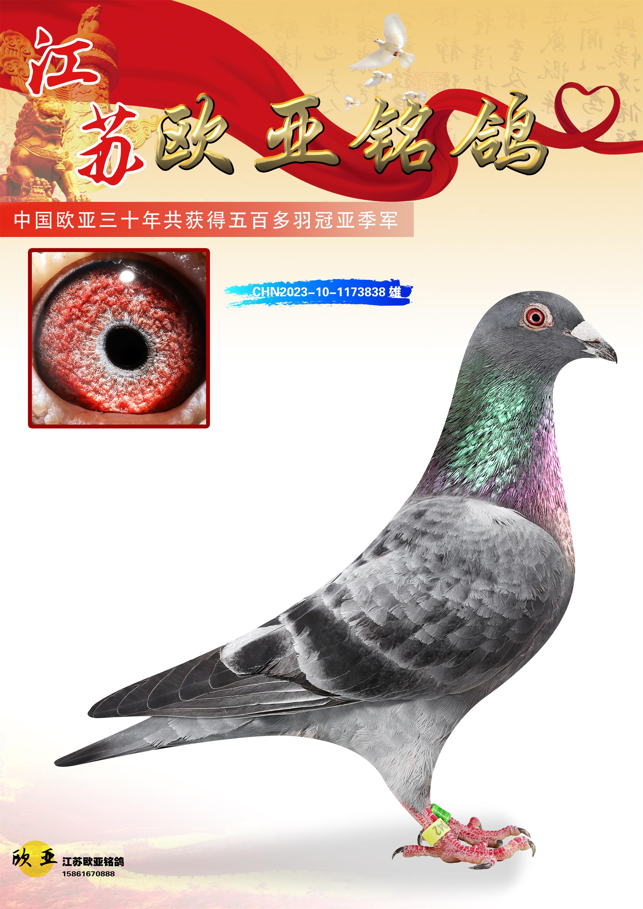 24年秋南京特比環(huán)歐亞榮獲大團體冠軍.小團體冠軍551公里大特比13名.14名.16名.19名.20名.21名.24名.26名.27名.28名.42名.52名.54名.57名.65名.66名.68名.70名.71名.72名.74名.76名.80名.82名.83名.84名.85名.86名.90名.92名.110名.116名.121名.122名.128名.131名.158名.161名.164名.165名.166名.172名.174名.177名.182名.195名.196名.201名.205名.208名.210名.216名.253名.269名.275名.276名.294名.296名.299名,,24年秋云南天南銅都公棚決賽415名.天南銅都小棚決賽409名.云南玉活公棚決賽102名.490名.團體32名上籠二羽進(jìn)二羽,天南銅都大棚506公里決賽445名。熱烈祝賀河北省巨鹿縣李蘭生老師用歐亞泰山號血系連續(xù)十一年奪冠軍,河北省國家賽冠軍.全國季軍等多次前十名高位,揚州王軍王總用歐亞利奧24年春季獲山東翔宇公棚決賽33名蓋比53名。南京劉正龍劉總用歐亞蓋比獲得24年秋山東濰坊國際公棚決賽42名.精英賽30名.三關(guān)鴿王71名.決賽86名.加站賽16名.南京市特比環(huán)A組鴿王9名.B組鴿王5名.6名.C組鴿王5名.精英賽冠軍4名.技能賽A組冠軍4名.5名.秦淮區(qū)特比環(huán)榮獲15名.46名.48名.87名。四川西昌徐亮徐總用歐亞利奧獲得涼山州聚友決賽177名.第二關(guān)亞軍雙關(guān)鴿王19名.三關(guān)鴿王105名.云南豪庭公棚決賽603名。熱烈祝賀24年四川重慶翔園鴿舍用歐亞泰山號榮獲春季400公里冠軍.秋季500公里冠軍,河北王總用詹森X利奧獲得千羽千翔公棚400公里冠軍,廣東蔡楷煥榮獲24年秋愛好者 賽鴿俱樂部三關(guān)鴿王季軍.一關(guān)420公里99名.二關(guān)450公里11名.三關(guān)520公里32名.單關(guān)季軍.7名.12名,江西李衛(wèi)興榮獲貴州紅楓公棚8名.共翔俱樂部寄養(yǎng)棚四關(guān)綜合鴿王30名.一關(guān)400公里78名.二關(guān)500公里55名.三關(guān)520公里37名.四關(guān)500公里57名.同父母獲公棚18名.雷鳴獲得武漢黃浦育翔中心冠軍,四川陳文獲得四川明鴻俱樂部300公里夢幻2名.3名.4名.9名.10名.13名.14名.15名.31名.34名.40名.41名.42名.43名.69名.71名.72名.73名.74名.94名.95名.97名.98名.99名.419公里決賽榮獲總冠軍7名.總共歸巢9羽,四川徐亮獲豪庭決賽603名,山西鄭勇獲得山西泰鑫公棚決賽255名詹森紅狐,熱烈祝賀馬總獲得開爾(飛躍隊)決賽9名獲獎金1310000萬元.第一關(guān)52名,天津津福資賽180公里96名.獲獎金429543萬元,歐亞支持全國鴿友24年秋多人報喜 祝大家取得更好成績,給歐亞報喜鴿友歐亞決定給每人贈送一羽超級種鴿。歐亞俱樂部特比環(huán)多關(guān)鴿王成績:15年秋淮安特比環(huán)黑色星期一全會上籠9700多羽,當(dāng)天無鴿歸巢,第二天全會歸巢357羽,本舍歸巢158羽.前十名八羽.前一百名歸巢57羽,16年春季獲五關(guān)鴿王總冠軍,總亞軍四名.六名.七名.九名.十名.晶藝俱樂部520公里冠亞季軍5名.6名.7名.9名.11名等,火車頭冠軍.季軍6名.8名.9名.10名,16年秋晶藝俱樂部特比環(huán)520公里亞軍.季軍4名.6名.7名.9名,15年春南京白下特比環(huán)冠軍.亞軍.季軍6名.7名.8名.9名.10名.指定鴿A B組獲得冠軍.亞軍.季軍4名.5名.,17年淮安特比環(huán)亞軍.4名.5名.7名.8名.10名.六關(guān)鴿王總冠軍.4名.6名.9名.10名,寄養(yǎng)棚宿遷劉總20羽特比環(huán)獲冠軍.季軍.4名.7名.8名.9名等。18年榮獲萬羽特比環(huán)六關(guān)鴿王總冠軍.總亞軍.總季軍.6名.8名.十名.單關(guān)四羽冠軍.二羽亞軍.四羽季軍.前十名27羽。19年秋萬羽特比環(huán)六關(guān)鴿王總亞軍.總季軍.5名.8名等,單關(guān)二羽冠軍.三羽亞軍.一羽季軍前十名31羽。20年秋淮安市鴿會四關(guān)特比環(huán)大賽風(fēng)雨無阻鴿王亞軍.鴿王六名,金品俱樂部萬羽特比環(huán)六關(guān)鴿王總冠軍,總亞軍.四名.五名.六名.七名.八名.十名.前二百名鴿王35羽,單關(guān)冠亞季軍前十名四十多羽,火車頭五關(guān)鴿王季軍.六名.八名.前二百名鴿王十七羽。20年春榮獲淮安五區(qū)一市四關(guān)鴿王總冠軍.亞軍.四名.八名.九名。21年秋榮獲金品萬羽特比環(huán)大賽六關(guān)鴿王總亞軍.總季軍.四名.七名.九名.十名.單關(guān)冠亞軍季軍前十名三十多羽;疖囶^協(xié)會鴿王六名.七名.十名.單關(guān)前十名十七羽。22年秋榮獲鴿王總冠軍.總亞軍.5名.7名.8名.9名.11名.單關(guān)冠亞季軍前十名三十多羽,第一關(guān)單關(guān)前二百名四十多羽,第二關(guān)前二百名三十多羽,第三關(guān)前二百名四十多羽,第四關(guān)前二百名四十多羽,第五關(guān)前一百名53羽。23年秋榮獲鴿王季軍.五名.八名.十名.13名.17名.20名.27名等多羽鴿王.單關(guān)前十名二十多羽。公棚.寄養(yǎng)棚部分成績:16年秋寧夏黃河公棚總冠軍電腦戈馬力指定通炮冠軍,17年送八羽參賽獲得鴿王八名進(jìn)獎四名,支持韓總榮獲八名。支持鴿友榮獲寧夏中衛(wèi)公棚決賽總冠軍.精英賽冠軍,支持18年寧夏黃河公棚決賽冠軍詹森X泰山。安徽鼎博寄養(yǎng)棚院內(nèi)外四關(guān)鴿王總冠軍.鴿王十七名.三十七名同窩,鴿王39名.42名.58名.67名。18年山東公棚預(yù)賽冠軍.決賽65名.送八羽進(jìn)獎五羽.指定獲奔馳汽車一輛。支持鴿友獲得云南藍(lán)云公棚冠軍.蓋比X佛卡門。支持鴿友榮獲云南銀集公棚決賽冠軍 詹森427X520血系 速度賽6700羽冠軍。17年榮獲金馬俱樂部寄養(yǎng)棚四關(guān)鴿王總冠軍.季軍.六名.八名.第一關(guān)冠軍.亞軍.季軍四名.七名.十一名.金牌教練獎。支持鴿友18年北京費翔公棚
