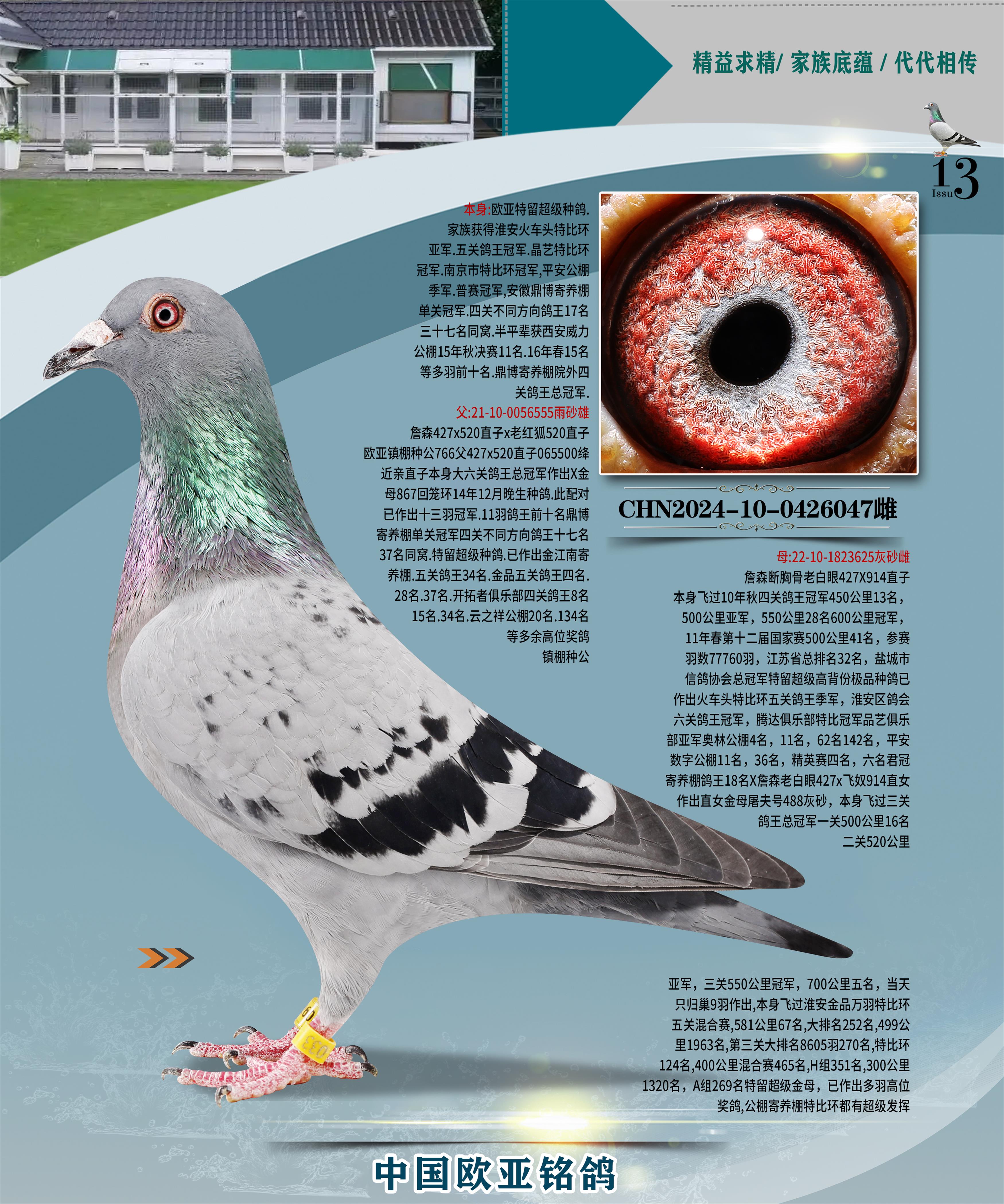 24年秋南京特比環(huán)歐亞榮獲大團體冠軍.小團體冠軍551公里大特比13名.14名.16名.19名.20名.21名.24名.26名.27名.28名.42名.52名.54名.57名.65名.66名.68名.70名.71名.72名.74名.76名.80名.82名.83名.84名.85名.86名.90名.92名.110名.116名.121名.122名.128名.131名.158名.161名.164名.165名.166名.172名.174名.177名.182名.195名.196名.201名.205名.208名.210名.216名.253名.269名.275名.276名.294名.296名.299名,,24年秋云南天南銅都公棚決賽415名.天南銅都小棚決賽409名.云南玉活公棚決賽102名.490名.團體32名上籠二羽進二羽,天南銅都大棚506公里決賽445名。熱烈祝賀河北省巨鹿縣李蘭生老師用歐亞泰山號血系連續(xù)十一年奪冠軍,河北省國家賽冠軍.全國季軍等多次前十名高位,揚州王軍王總用歐亞利奧24年春季獲山東翔宇公棚決賽33名蓋比53名。南京劉正龍劉總用歐亞蓋比獲得24年秋山東濰坊國際公棚決賽42名.精英賽30名.三關鴿王71名.決賽86名.加站賽16名.南京市特比環(huán)A組鴿王9名.B組鴿王5名.6名.C組鴿王5名.精英賽冠軍4名.技能賽A組冠軍4名.5名.秦淮區(qū)特比環(huán)榮獲15名.46名.48名.87名。四川西昌徐亮徐總用歐亞利奧獲得涼山州聚友決賽177名.第二關亞軍雙關鴿王19名.三關鴿王105名.云南豪庭公棚決賽603名。熱烈祝賀24年四川重慶翔園鴿舍用歐亞泰山號榮獲春季400公里冠軍.秋季500公里冠軍,河北王總用詹森X利奧獲得千羽千翔公棚400公里冠軍,廣東蔡楷煥榮獲24年秋愛好者 賽鴿俱樂部三關鴿王季軍.一關420公里99名.二關450公里11名.三關520公里32名.單關季軍.7名.12名,江西李衛(wèi)興榮獲貴州紅楓公棚8名.共翔俱樂部寄養(yǎng)棚四關綜合鴿王30名.一關400公里78名.二關500公里55名.三關520公里37名.四關500公里57名.同父母獲公棚18名.雷鳴獲得武漢黃浦育翔中心冠軍,四川陳文獲得四川明鴻俱樂部300公里夢幻2名.3名.4名.9名.10名.13名.14名.15名.31名.34名.40名.41名.42名.43名.69名.71名.72名.73名.74名.94名.95名.97名.98名.99名.419公里決賽榮獲總冠軍7名.總共歸巢9羽,四川徐亮獲豪庭決賽603名,山西鄭勇獲得山西泰鑫公棚決賽255名詹森紅狐,熱烈祝賀馬總獲得開爾(飛躍隊)決賽9名獲獎金1310000萬元.第一關52名,天津津福資賽180公里96名.獲獎金429543萬元,歐亞支持全國鴿友24年秋多人報喜 祝大家取得更好成績,給歐亞報喜鴿友歐亞決定給每人贈送一羽超級種鴿。歐亞俱樂部特比環(huán)多關鴿王成績:15年秋淮安特比環(huán)黑色星期一全會上籠9700多羽,當天無鴿歸巢,第二天全會歸巢357羽,本舍歸巢158羽.前十名八羽.前一百名歸巢57羽,16年春季獲五關鴿王總冠軍,總亞軍四名.六名.七名.九名.十名.晶藝俱樂部520公里冠亞季軍5名.6名.7名.9名.11名等,火車頭冠軍.季軍6名.8名.9名.10名,16年秋晶藝俱樂部特比環(huán)520公里亞軍.季軍4名.6名.7名.9名,15年春南京白下特比環(huán)冠軍.亞軍.季軍6名.7名.8名.9名.10名.指定鴿A B組獲得冠軍.亞軍.季軍4名.5名.,17年淮安特比環(huán)亞軍.4名.5名.7名.8名.10名.六關鴿王總冠軍.4名.6名.9名.10名,寄養(yǎng)棚宿遷劉總20羽特比環(huán)獲冠軍.季軍.4名.7名.8名.9名等。18年榮獲萬羽特比環(huán)六關鴿王總冠軍.總亞軍.總季軍.6名.8名.十名.單關四羽冠軍.二羽亞軍.四羽季軍.前十名27羽。19年秋萬羽特比環(huán)六關鴿王總亞軍.總季軍.5名.8名等,單關二羽冠軍.三羽亞軍.一羽季軍前十名31羽。20年秋淮安市鴿會四關特比環(huán)大賽風雨無阻鴿王亞軍.鴿王六名,金品俱樂部萬羽特比環(huán)六關鴿王總冠軍,總亞軍.四名.五名.六名.七名.八名.十名.前二百名鴿王35羽,單關冠亞季軍前十名四十多羽,火車頭五關鴿王季軍.六名.八名.前二百名鴿王十七羽。20年春榮獲淮安五區(qū)一市四關鴿王總冠軍.亞軍.四名.八名.九名。21年秋榮獲金品萬羽特比環(huán)大賽六關鴿王總亞軍.總季軍.四名.七名.九名.十名.單關冠亞軍季軍前十名三十多羽;疖囶^協(xié)會鴿王六名.七名.十名.單關前十名十七羽。22年秋榮獲鴿王總冠軍.總亞軍.5名.7名.8名.9名.11名.單關冠亞季軍前十名三十多羽,第一關單關前二百名四十多羽,第二關前二百名三十多羽,第三關前二百名四十多羽,第四關前二百名四十多羽,第五關前一百名53羽。23年秋榮獲鴿王季軍.五名.八名.十名.13名.17名.20名.27名等多羽鴿王.單關前十名二十多羽。公棚.寄養(yǎng)棚部分成績:16年秋寧夏黃河公棚總冠軍電腦戈馬力指定通炮冠軍,17年送八羽參賽獲得鴿王八名進獎四名,支持韓總榮獲八名。支持鴿友榮獲寧夏中衛(wèi)公棚決賽總冠軍.精英賽冠軍,支持18年寧夏黃河公棚決賽冠軍詹森X泰山。安徽鼎博寄養(yǎng)棚院內(nèi)外四關鴿王總冠軍.鴿王十七名.三十七名同窩,鴿王39名.42名.58名.67名。18年山東公棚預賽冠軍.決賽65名.送八羽進獎五羽.指定獲奔馳汽車一輛。支持鴿友獲得云南藍云公棚冠軍.蓋比X佛卡門。支持鴿友榮獲云南銀集公棚決賽冠軍 詹森427X520血系 速度賽6700羽冠軍。17年榮獲金馬俱樂部寄養(yǎng)棚四關鴿王總冠軍.季軍.六名.八名.第一關冠軍.亞軍.季軍四名.七名.十一名.金牌教練獎。支持鴿友18年北京費翔公棚預賽九名電腦X桑杰士,支持鴿友榮獲陜西威力公棚決賽11名.內(nèi)蒙古臨河寄養(yǎng)棚四關鴿王六名.詹森配泰山,支持河北王總用歐亞詹森427配胡本喜獲20年秋開爾青年棚季軍。云南東榮公棚16年預賽冠軍.決賽77名.17年決賽12名.詹森紅狐X泰山,17年平安公