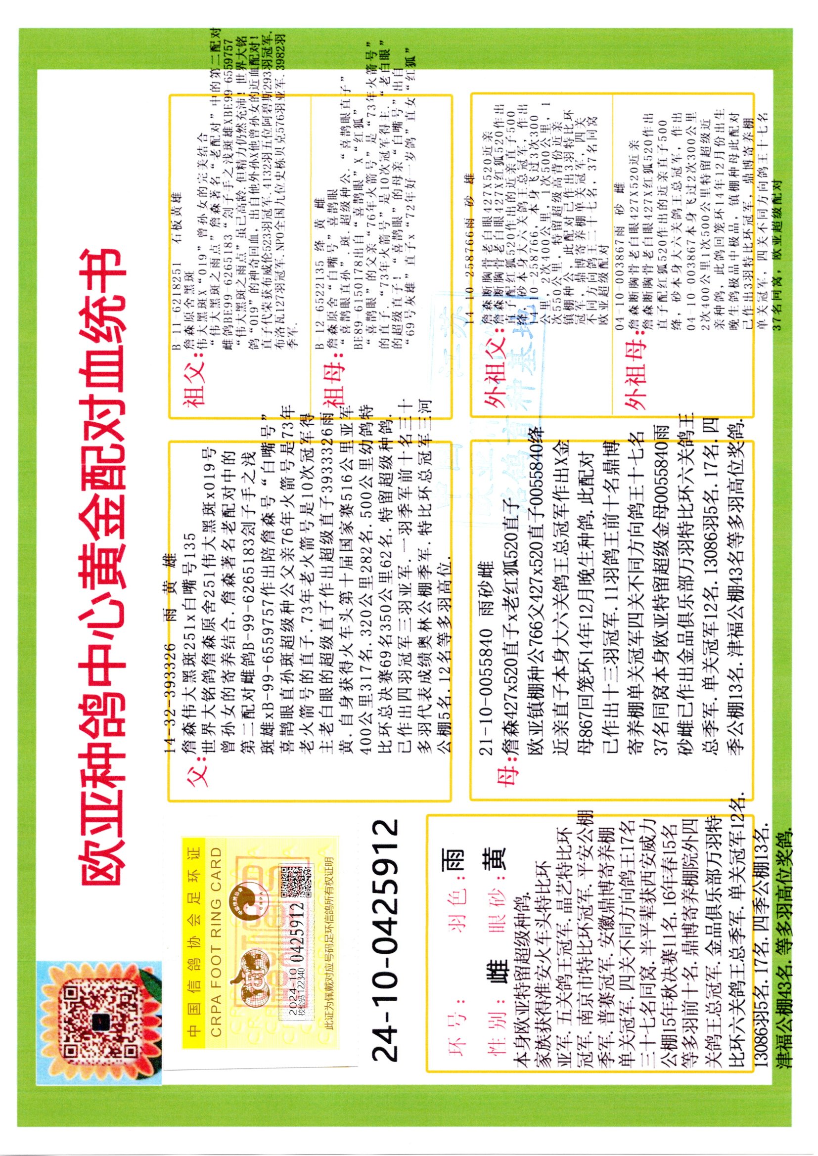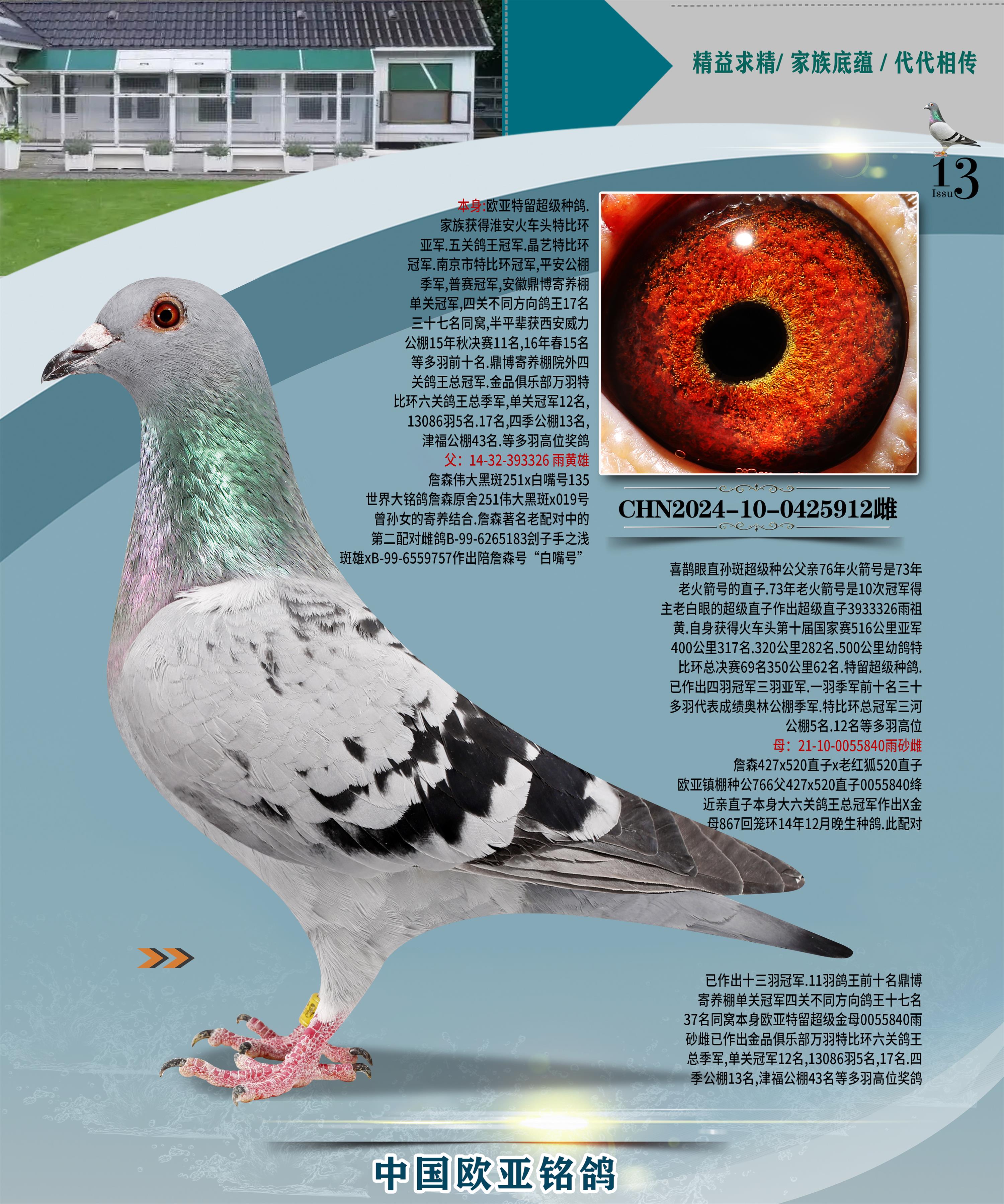 24年秋南京特比環(huán)歐亞榮獲大團(tuán)體冠軍.小團(tuán)體冠軍551公里大特比13名.14名.16名.19名.20名.21名.24名.26名.27名.28名.42名.52名.54名.57名.65名.66名.68名.70名.71名.72名.74名.76名.80名.82名.83名.84名.85名.86名.90名.92名.110名.116名.121名.122名.128名.131名.158名.161名.164名.165名.166名.172名.174名.177名.182名.195名.196名.201名.205名.208名.210名.216名.253名.269名.275名.276名.294名.296名.299名,,24年秋云南天南銅都公棚決賽415名.天南銅都小棚決賽409名.云南玉活公棚決賽102名.490名.團(tuán)體32名上籠二羽進(jìn)二羽,天南銅都大棚506公里決賽445名。熱烈祝賀河北省巨鹿縣李蘭生老師用歐亞泰山號血系連續(xù)十一年奪冠軍,河北省國家賽冠軍.全國季軍等多次前十名高位,揚(yáng)州王軍王總用歐亞利奧24年春季獲山東翔宇公棚決賽33名蓋比53名。南京劉正龍劉總用歐亞蓋比獲得24年秋山東濰坊國際公棚決賽42名.精英賽30名.三關(guān)鴿王71名.決賽86名.加站賽16名.南京市特比環(huán)A組鴿王9名.B組鴿王5名.6名.C組鴿王5名.精英賽冠軍4名.技能賽A組冠軍4名.5名.秦淮區(qū)特比環(huán)榮獲15名.46名.48名.87名。四川西昌徐亮徐總用歐亞利奧獲得涼山州聚友決賽177名.第二關(guān)亞軍雙關(guān)鴿王19名.三關(guān)鴿王105名.云南豪庭公棚決賽603名。熱烈祝賀24年四川重慶翔園鴿舍用歐亞泰山號榮獲春季400公里冠軍.秋季500公里冠軍,河北王總用詹森X利奧獲得千羽千翔公棚400公里冠軍,廣東蔡楷煥榮獲24年秋愛好者 賽鴿俱樂部三關(guān)鴿王季軍.一關(guān)420公里99名.二關(guān)450公里11名.三關(guān)520公里32名.單關(guān)季軍.7名.12名,江西李衛(wèi)興榮獲貴州紅楓公棚8名.共翔俱樂部寄養(yǎng)棚四關(guān)綜合鴿王30名.一關(guān)400公里78名.二關(guān)500公里55名.三關(guān)520公里37名.四關(guān)500公里57名.同父母獲公棚18名.雷鳴獲得武漢黃浦育翔中心冠軍,四川陳文獲得四川明鴻俱樂部300公里夢幻2名.3名.4名.9名.10名.13名.14名.15名.31名.34名.40名.41名.42名.43名.69名.71名.72名.73名.74名.94名.95名.97名.98名.99名.419公里決賽榮獲總冠軍7名.總共歸巢9羽,四川徐亮獲豪庭決賽603名,山西鄭勇獲得山西泰鑫公棚決賽255名詹森紅狐,熱烈祝賀馬總獲得開爾(飛躍隊(duì))決賽9名獲獎金1310000萬元.第一關(guān)52名,天津津福資賽180公里96名.獲獎金429543萬元,歐亞支持全國鴿友24年秋多人報(bào)喜 祝大家取得更好成績,給歐亞報(bào)喜鴿友歐亞決定給每人贈送一羽超級種鴿。歐亞俱樂部特比環(huán)多關(guān)鴿王成績:15年秋淮安特比環(huán)黑色星期一全會上籠9700多羽,當(dāng)天無鴿歸巢,第二天全會歸巢357羽,本舍歸巢158羽.前十名八羽.前一百名歸巢57羽,16年春季獲五關(guān)鴿王總冠軍,總亞軍四名.六名.七名.九名.十名.晶藝俱樂部520公里冠亞季軍5名.6名.7名.9名.11名等,火車頭冠軍.季軍6名.8名.9名.10名,16年秋晶藝俱樂部特比環(huán)520公里亞軍.季軍4名.6名.7名.9名,15年春南京白下特比環(huán)冠軍.亞軍.季軍6名.7名.8名.9名.10名.指定鴿A B組獲得冠軍.亞軍.季軍4名.5名.,17年淮安特比環(huán)亞軍.4名.5名.7名.8名.10名.六關(guān)鴿王總冠軍.4名.6名.9名.10名,寄養(yǎng)棚宿遷劉總20羽特比環(huán)獲冠軍.季軍.4名.7名.8名.9名等。18年榮獲萬羽特比環(huán)六關(guān)鴿王總冠軍.總亞軍.總季軍.6名.8名.十名.單關(guān)四羽冠軍.二羽亞軍.四羽季軍.前十名27羽。19年秋萬羽特比環(huán)六關(guān)鴿王總亞軍.總季軍.5名.8名等,單關(guān)二羽冠軍.三羽亞軍.一羽季軍前十名31羽。20年秋淮安市鴿會四關(guān)特比環(huán)大賽風(fēng)雨無阻鴿王亞軍.鴿王六名,金品俱樂部萬羽特比環(huán)六關(guān)鴿王總冠軍,總亞軍.四名.五名.六名.七名.八名.十名.前二百名鴿王35羽,單關(guān)冠亞季軍前十名四十多羽,火車頭五關(guān)鴿王季軍.六名.八名.前二百名鴿王十七羽。20年春榮獲淮安五區(qū)一市四關(guān)鴿王總冠軍.亞軍.四名.八名.九名。21年秋榮獲金品萬羽特比環(huán)大賽六關(guān)鴿王總亞軍.總季軍.四名.七名.九名.十名.單關(guān)冠亞軍季軍前十名三十多羽。火車頭協(xié)會鴿王六名.七名.十名.單關(guān)前十名十七羽。22年秋榮獲鴿王總冠軍.總亞軍.5名.7名.8名.9名.11名.單關(guān)冠亞季軍前十名三十多羽,第一關(guān)單關(guān)前二百名四十多羽,第二關(guān)前二百名三十多羽,第三關(guān)前二百名四十多羽,第四關(guān)前二百名四十多羽,第五關(guān)前一百名53羽。23年秋榮獲鴿王季軍.五名.八名.十名.13名.17名.20名.27名等多羽鴿王.單關(guān)前十名二十多羽。公棚.寄養(yǎng)棚部分成績:16年秋寧夏黃河公棚總冠軍電腦戈馬力指定通炮冠軍,17年送八羽參賽獲得鴿王八名進(jìn)獎四名,支持韓總榮獲八名。支持鴿友榮獲寧夏中衛(wèi)公棚決賽總冠軍.精英賽冠軍,支持18年寧夏黃河公棚決賽冠軍詹森X泰山。安徽鼎博寄養(yǎng)棚院內(nèi)外四關(guān)鴿王總冠軍.鴿王十七名.三十七名同窩,鴿王39名.42名.58名.67名。18年山東公棚預(yù)賽冠軍.決賽65名.送八羽進(jìn)獎五羽.指定獲奔馳汽車一輛。支持鴿友獲得云南藍(lán)云公棚冠軍.蓋比X佛卡門。支持鴿友榮獲云南銀集公棚決賽冠軍 詹森427X520血系 速度賽6700羽冠軍。17年榮獲金馬俱樂部寄養(yǎng)棚四關(guān)鴿王總冠軍.季軍.六名.八名.第一關(guān)冠軍.亞軍.季軍四名.七名.十一名.金