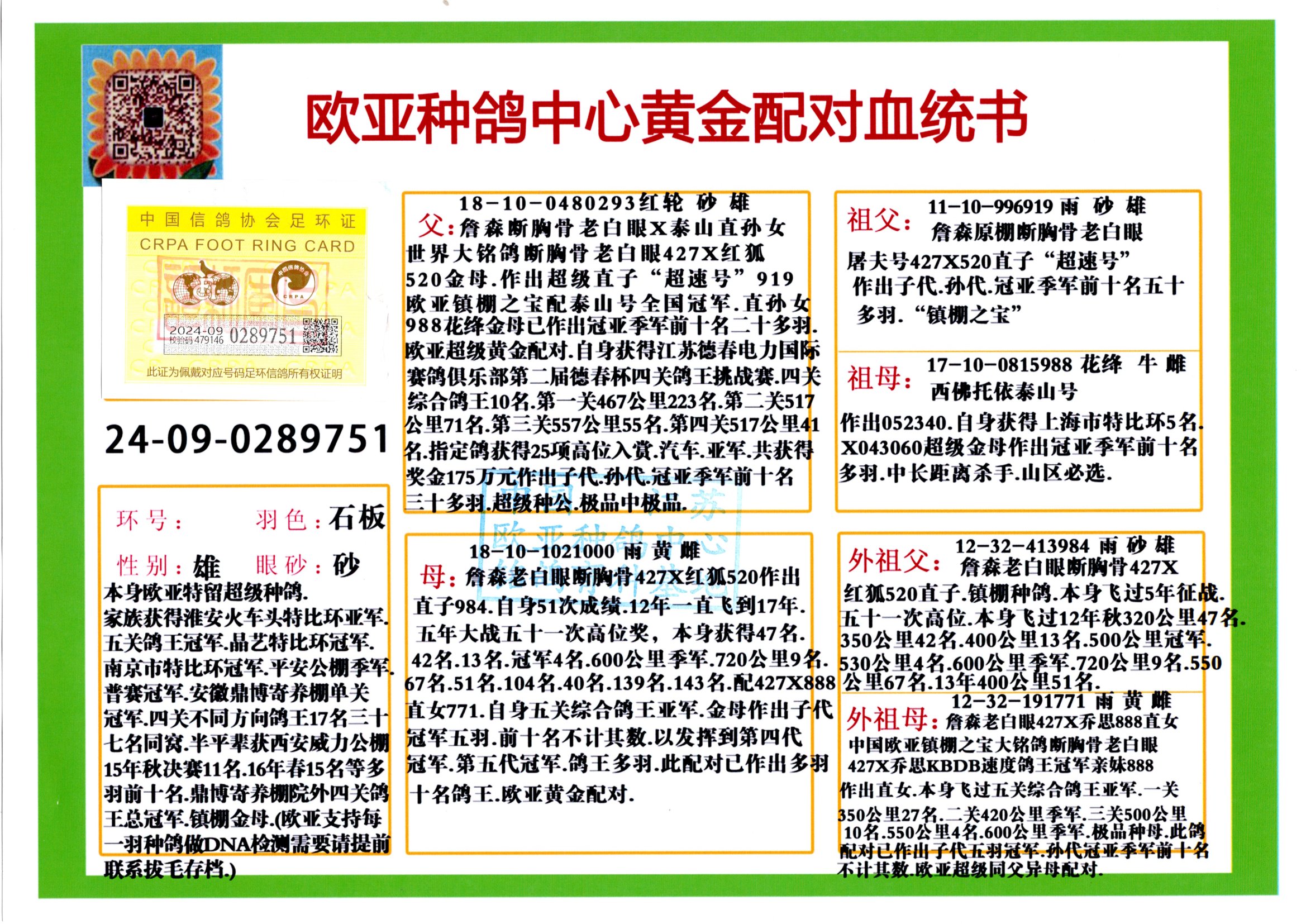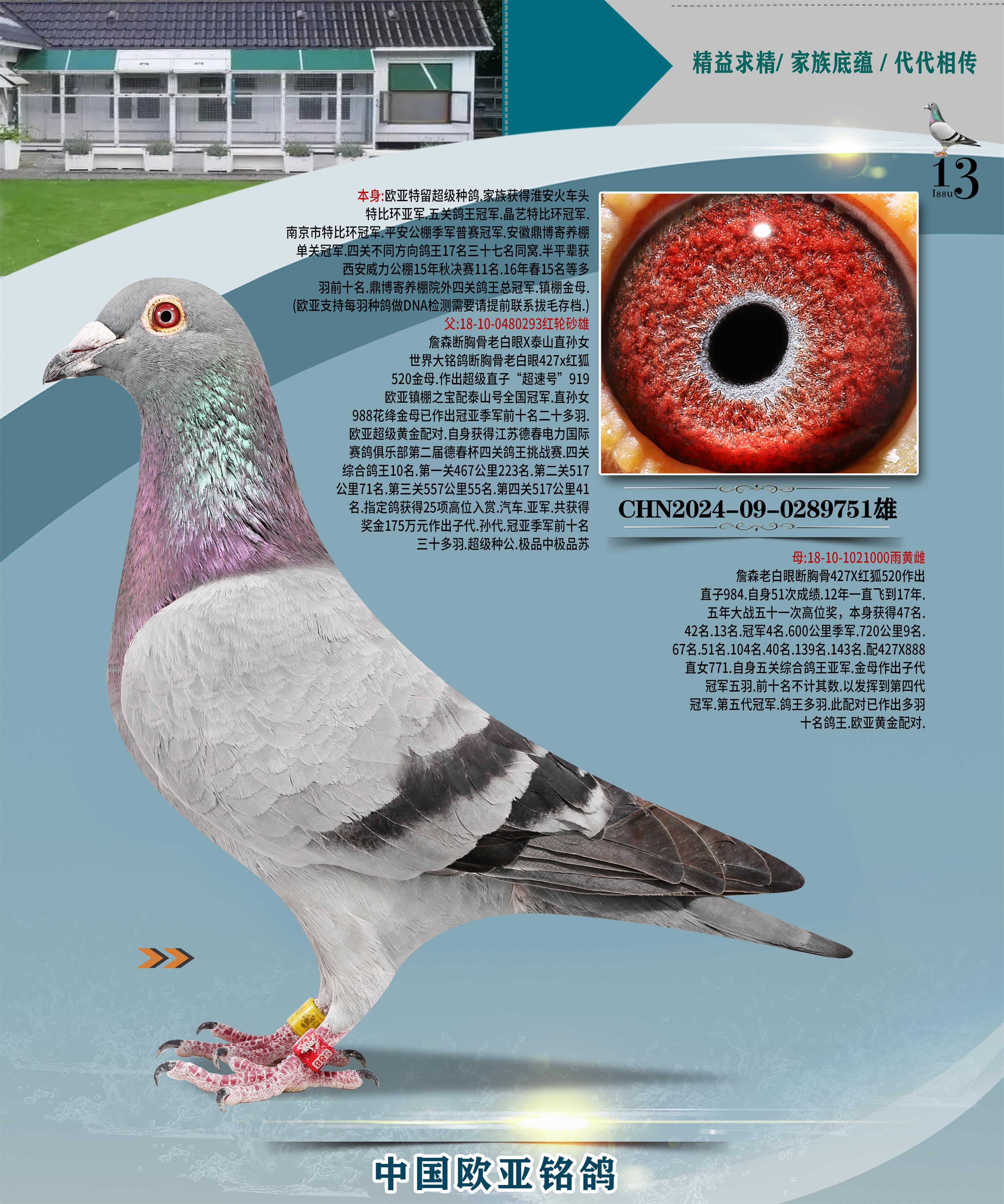 24年秋南京特比環(huán)歐亞榮獲大團體冠軍.小團體冠軍551公里大特比13名.14名.16名.19名.20名.21名.24名.26名.27名.28名.42名.52名.54名.57名.65名.66名.68名.70名.71名.72名.74名.76名.80名.82名.83名.84名.85名.86名.90名.92名.110名.116名.121名.122名.128名.131名.158名.161名.164名.165名.166名.172名.174名.177名.182名.195名.196名.201名.205名.208名.210名.216名.253名.269名.275名.276名.294名.296名.299名,,24年秋云南天南銅都公棚決賽415名.天南銅都小棚決賽409名.云南玉活公棚決賽102名.490名.團體32名上籠二羽進二羽,天南銅都大棚506公里決賽445名。熱烈祝賀河北省巨鹿縣李蘭生老師用歐亞泰山號血系連續(xù)十一年奪冠軍,河北省國家賽冠軍.全國季軍等多次前十名高位,揚州王軍王總用歐亞利奧24年春季獲山東翔宇公棚決賽33名蓋比53名。南京劉正龍劉總用歐亞蓋比獲得24年秋山東濰坊國際公棚決賽42名.精英賽30名.三關(guān)鴿王71名.決賽86名.加站賽16名.南京市特比環(huán)A組鴿王9名.B組鴿王5名.6名.C組鴿王5名.精英賽冠軍4名.技能賽A組冠軍4名.5名.秦淮區(qū)特比環(huán)榮獲15名.46名.48名.87名。四川西昌徐亮徐總用歐亞利奧獲得涼山州聚友決賽177名.第二關(guān)亞軍雙關(guān)鴿王19名.三關(guān)鴿王105名.云南豪庭公棚決賽603名。熱烈祝賀24年四川重慶翔園鴿舍用歐亞泰山號榮獲春季400公里冠軍.秋季500公里冠軍,河北王總用詹森X利奧獲得千羽千翔公棚400公里冠軍,廣東蔡楷煥榮獲24年秋愛好者 賽鴿俱樂部三關(guān)鴿王季軍.一關(guān)420公里99名.二關(guān)450公里11名.三關(guān)520公里32名.單關(guān)季軍.7名.12名,江西李衛(wèi)興榮獲貴州紅楓公棚8名.共翔俱樂部寄養(yǎng)棚四關(guān)綜合鴿王30名.一關(guān)400公里78名.二關(guān)500公里55名.三關(guān)520公里37名.四關(guān)500公里57名.同父母獲公棚18名.雷鳴獲得武漢黃浦育翔中心冠軍,四川陳文獲得四川明鴻俱樂部300公里夢幻2名.3名.4名.9名.10名.13名.14名.15名.31名.34名.40名.41名.42名.43名.69名.71名.72名.73名.74名.94名.95名.97名.98名.99名.419公里決賽榮獲總冠軍7名.總共歸巢9羽,四川徐亮獲豪庭決賽603名,山西鄭勇獲得山西泰鑫公棚決賽255名詹森紅狐,熱烈祝賀馬總獲得開爾(飛躍隊)決賽9名獲獎金1310000萬元.第一關(guān)52名,天津津福資賽180公里96名.獲獎金429543萬元,歐亞支持全國鴿友24年秋多人報喜 祝大家取得更好成績,給歐亞報喜鴿友歐亞決定給每人贈送一羽超級種鴿。歐亞俱樂部特比環(huán)多關(guān)鴿王成績:15年秋淮安特比環(huán)黑色星期一全會上籠9700多羽,當(dāng)天無鴿歸巢,第二天全會歸巢357羽,本舍歸巢158羽.前十名八羽.前一百名歸巢57羽,16年春季獲五關(guān)鴿王總冠軍,總亞軍四名.六名.七名.九名.十名.晶藝俱樂部520公里冠亞季軍5名.6名.7名.9名.11名等,火車頭冠軍.季軍6名.8名.9名.10名,16年秋晶藝俱樂部特比環(huán)520公里亞軍.季軍4名.6名.7名.9名,15年春南京白下特比環(huán)冠軍.亞軍.季軍6名.7名.8名.9名.10名.指定鴿A B組獲得冠軍.亞軍.季軍4名.5名.,17年淮安特比環(huán)亞軍.4名.5名.7名.8名.10名.六關(guān)鴿王總冠軍.4名.6名.9名.10名,寄養(yǎng)棚宿遷劉總20羽特比環(huán)獲冠軍.季軍.4名.7名.8名.9名等。18年榮獲萬羽特比環(huán)六關(guān)鴿王總冠軍.總亞軍.總季軍.6名.8名.十名.單關(guān)四羽冠軍.二羽亞軍.四羽季軍.前十名27羽。19年秋萬羽特比環(huán)六關(guān)鴿王總亞軍.總季軍.5名.8名等,單關(guān)二羽冠軍.三羽亞軍.一羽季軍前十名31羽。20年秋淮安市鴿會四關(guān)特比環(huán)大賽風(fēng)雨無阻鴿王亞軍.鴿王六名,金品俱樂部萬羽特比環(huán)六關(guān)鴿王總冠軍,總亞軍.四名.五名.六名.七名.八名.十名.前二百名鴿王35羽,單關(guān)冠亞季軍前十名四十多羽,火車頭五關(guān)鴿王季軍.六名.八名.前二百名鴿王十七羽。20年春榮獲淮安五區(qū)一市四關(guān)鴿王總冠軍.亞軍.四名.八名.九名。21年秋榮獲金品萬羽特比環(huán)大賽六關(guān)鴿王總亞軍.總季軍.四名.七名.九名.十名.單關(guān)冠亞軍季軍前十名三十多羽;疖囶^協(xié)會鴿王六名.七名.十名.單關(guān)前十名十七羽。22年秋榮獲鴿王總冠軍.總亞軍.5名.7名.8名.9名.11名.單關(guān)冠亞季軍前十名三十多羽,第一關(guān)單關(guān)前二百名四十多羽,第二關(guān)前二百名三十多羽,第三關(guān)前二百名四十多羽,第四關(guān)前二百名四十多羽,第五關(guān)前一百名53羽。23年秋榮獲鴿王季軍.五名.八名.十名.13名.17名.20名.27名等多羽鴿王.單關(guān)前十名二十多羽。公棚.寄養(yǎng)棚部分成績:16年秋寧夏黃河公棚總冠軍電腦戈馬力指定通炮冠軍,17年送八羽參賽獲得鴿王八名進獎四名,支持韓總榮獲八名。支持鴿友榮獲寧夏中衛(wèi)公棚決賽總冠軍.精英賽冠軍,支持18年寧夏黃河公棚決賽冠軍詹森X泰山。安徽鼎博寄養(yǎng)棚院內(nèi)外四關(guān)鴿王總冠軍.鴿王十七名.三十七名同窩,鴿王39名.42名.58名.67名。18年山東公棚預(yù)賽冠軍.決賽65名.送八羽進獎五羽.指定獲奔馳汽車一輛。支持鴿友獲得云南藍云公棚冠軍.蓋比X佛卡門。支持鴿友榮獲云南銀集公棚決賽冠軍 詹森427X520血系 速度賽6700羽冠軍。17年榮獲金馬俱樂部寄養(yǎng)棚四關(guān)鴿王總冠軍.季軍.六名.八名.第一關(guān)冠軍.亞軍.季軍四名.七名.十一名.金牌教練獎。支持鴿友18年北京費翔公棚預(yù)賽九名電腦X