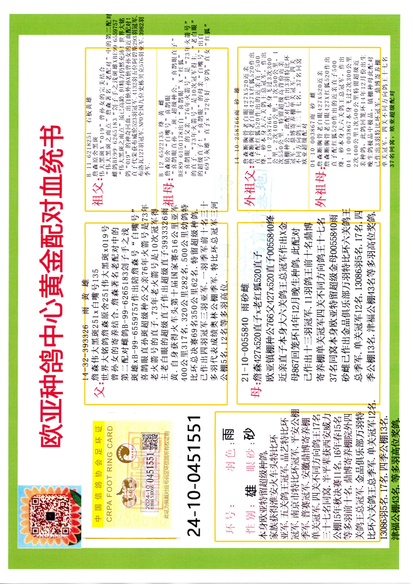 24年秋南京特比環(huán)歐亞榮獲大團體冠軍.小團體冠軍551公里大特比13名.14名.16名.19名.20名.21名.24名.26名.27名.28名.42名.52名.54名.57名.65名.66名.68名.70名.71名.72名.74名.76名.80名.82名.83名.84名.85名.86名.90名.92名.110名.116名.121名.122名.128名.131名.158名.161名.164名.165名.166名.172名.174名.177名.182名.195名.196名.201名.205名.208名.210名.216名.253名.269名.275名.276名.294名.296名.299名,,24年秋云南天南銅都公棚決賽415名.天南銅都小棚決賽409名.云南玉活公棚決賽102名.490名.團體32名上籠二羽進二羽,天南銅都大棚506公里決賽445名。熱烈祝賀河北省巨鹿縣李蘭生老師用歐亞泰山號血系連續(xù)十一年奪冠軍,河北省國家賽冠軍.全國季軍等多次前十名高位,揚州王軍王總用歐亞利奧24年春季獲山東翔宇公棚決賽33名蓋比53名。南京劉正龍劉總用歐亞蓋比獲得24年秋山東濰坊國際公棚決賽42名.精英賽30名.三關(guān)鴿王71名.決賽86名.加站賽16名.南京市特比環(huán)A組鴿王9名.B組鴿王5名.6名.C組鴿王5名.精英賽冠軍4名.技能賽A組冠軍4名.5名.秦淮區(qū)特比環(huán)榮獲15名.46名.48名.87名。四川西昌徐亮徐總用歐亞利奧獲得涼山州聚友決賽177名.第二關(guān)亞軍雙關(guān)鴿王19名.三關(guān)鴿王105名.云南豪庭公棚決賽603名。熱烈祝賀24年四川重慶翔園鴿舍用歐亞泰山號榮獲春季400公里冠軍.秋季500公里冠軍,河北王總用詹森X利奧獲得千羽千翔公棚400公里冠軍,廣東蔡楷煥榮獲24年秋愛好者 賽鴿俱樂部三關(guān)鴿王季軍.一關(guān)420公里99名.二關(guān)450公里11名.三關(guān)520公里32名.單關(guān)季軍.7名.12名,江西李衛(wèi)興榮獲貴州紅楓公棚8名.共翔俱樂部寄養(yǎng)棚四關(guān)綜合鴿王30名.一關(guān)400公里78名.二關(guān)500公里55名.三關(guān)520公里37名.四關(guān)500公里57名.同父母獲公棚18名.雷鳴獲得武漢黃浦育翔中心冠軍,四川陳文獲得四川明鴻俱樂部300公里夢幻2名.3名.4名.9名.10名.13名.14名.15名.31名.34名.40名.41名.42名.43名.69名.71名.72名.73名.74名.94名.95名.97名.98名.99名.419公里決賽榮獲總冠軍7名.總共歸巢9羽,四川徐亮獲豪庭決賽603名,山西鄭勇獲得山西泰鑫公棚決賽255名詹森紅狐,熱烈祝賀馬總獲得開爾(飛躍隊)決賽9名獲獎金1310000萬元.第一關(guān)52名,天津津福資賽180公里96名.獲獎金429543萬元,歐亞支持全國鴿友24年秋多人報喜 祝大家取得更好成績,給歐亞報喜鴿友歐亞決定給每人贈送一羽超級種鴿。歐亞俱樂部特比環(huán)多關(guān)鴿王成績:15年秋淮安特比環(huán)黑色星期一全會上籠9700多羽,當天無鴿歸巢,第二天全會歸巢357羽,本舍歸巢158羽.前十名八羽.前一百名歸巢57羽,16年春季獲五關(guān)鴿王總冠軍,總亞軍四名.六名.七名.九名.十名.晶藝俱樂部520公里冠亞季軍5名.6名.7名.9名.11名等,火車頭冠軍.季軍6名.8名.9名.10名,16年秋晶藝俱樂部特比環(huán)520公里亞軍.季軍4名.6名.7名.9名,15年春南京白下特比環(huán)冠軍.亞軍.季軍6名.7名.8名.9名.10名.指定鴿A B組獲得冠軍.亞軍.季軍4名.5名.,17年淮安特比環(huán)亞軍.4名.5名.7名.8名.10名.六關(guān)鴿王總冠軍.4名.6名.9名.10名,寄養(yǎng)棚宿遷劉總20羽特比環(huán)獲冠軍.季軍.4名.7名.8名.9名等。18年榮獲萬羽特比環(huán)六關(guān)鴿王總冠軍.總亞軍.總季軍.6名.8名.十名.單關(guān)四羽冠軍.二羽亞軍.四羽季軍.前十名27羽。19年秋萬羽特比環(huán)六關(guān)鴿王總亞軍.總季軍.5名.8名等,單關(guān)二羽冠軍.三羽亞軍.一羽季軍前十名31羽。20年秋淮安市鴿會四關(guān)特比環(huán)大賽風雨無阻鴿王亞軍.鴿王六名,金品俱樂部萬羽特比環(huán)六關(guān)鴿王總冠軍,總亞軍.四名.五名.六名.七名.八名.十名.前二百名鴿王35羽,單關(guān)冠亞季軍前十名四十多羽,火車頭五關(guān)鴿王季軍.六名.八名.前二百名鴿王十七羽。20年春榮獲淮安五區(qū)一市四關(guān)鴿王總冠軍.亞軍.四名.八名.九名。21年秋榮獲金品萬羽特比環(huán)大賽六關(guān)鴿王總亞軍.總季軍.四名.七名.九名.十名.單關(guān)冠亞軍季軍前十名三十多羽;疖囶^協(xié)會鴿王六名.七名.十名.單關(guān)前十名十七羽。22年秋榮獲鴿王總冠軍.總亞軍.5名.7名.8名.9名.11名.單關(guān)冠亞季軍前十名三十多羽,第一關(guān)單關(guān)前二百名四十多羽,第二關(guān)前二百名三十多羽,第三關(guān)前二百名四十多羽,第四關(guān)前二百名四十多羽,第五關(guān)前一百名53羽。23年秋榮獲鴿王季軍.五名.八名.十名.13名.17名.20名.27名等多羽鴿王.單關(guān)前十名二十多羽。公棚.寄養(yǎng)棚部分成績:16年秋寧夏黃河公棚總冠軍電腦戈馬力指定通炮冠軍,17年送八羽參賽獲得鴿王八名進獎四名,支持韓總榮獲八名。支持鴿友榮獲寧夏中衛(wèi)公棚決賽總冠軍.精英賽冠軍,支持18年寧夏黃河公棚決賽冠軍詹森X泰山。安徽鼎博寄養(yǎng)棚院內(nèi)外四關(guān)鴿王總冠軍.鴿王十七名.三十七名同窩,鴿王39名.42名.58名.67名。18年山東公棚預賽冠軍.決賽65名.送八羽進獎五羽.指定獲奔馳汽車一輛。支持鴿友獲得云南藍云公棚冠軍.蓋比X佛卡門。支持鴿友榮獲云南銀集公棚決賽冠軍 詹森427X520血系 速度賽6700羽冠軍。17年榮獲金馬俱樂部寄養(yǎng)棚四關(guān)鴿王總冠軍.季軍.六名.八名.第一關(guān)冠軍.亞軍.季軍四名.七名.十一名.金牌教練獎。支持鴿友18年北京費翔公棚預賽九名電腦X桑杰士,支持鴿友榮