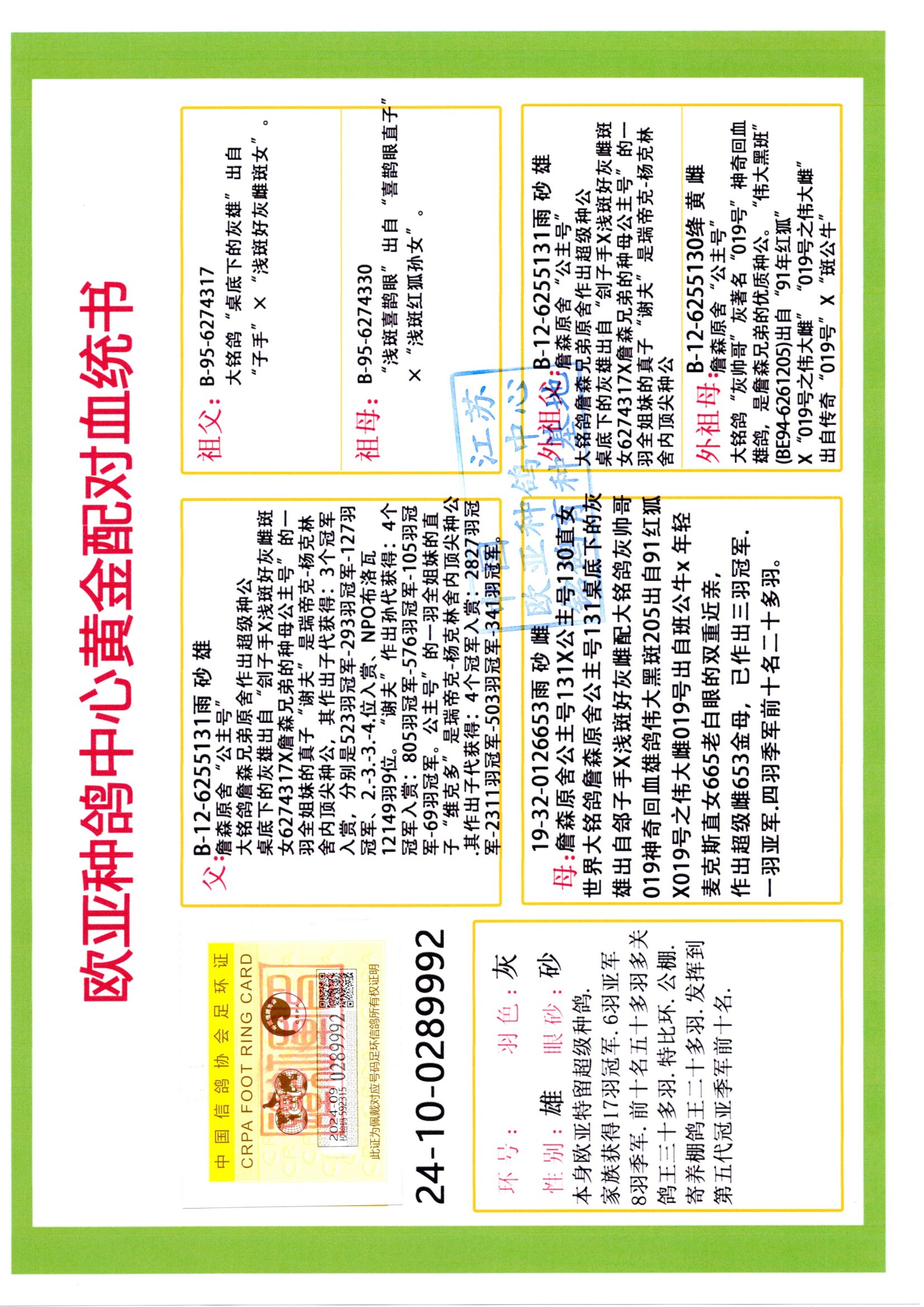 24年秋南京特比環(huán)歐亞榮獲大團(tuán)體冠軍.小團(tuán)體冠軍551公里大特比13名.14名.16名.19名.20名.21名.24名.26名.27名.28名.42名.52名.54名.57名.65名.66名.68名.70名.71名.72名.74名.76名.80名.82名.83名.84名.85名.86名.90名.92名.110名.116名.121名.122名.128名.131名.158名.161名.164名.165名.166名.172名.174名.177名.182名.195名.196名.201名.205名.208名.210名.216名.253名.269名.275名.276名.294名.296名.299名,,24年秋云南天南銅都公棚決賽415名.天南銅都小棚決賽409名.云南玉活公棚決賽102名.490名.團(tuán)體32名上籠二羽進(jìn)二羽,天南銅都大棚506公里決賽445名。熱烈祝賀河北省巨鹿縣李蘭生老師用歐亞泰山號血系連續(xù)十一年奪冠軍,河北省國家賽冠軍.全國季軍等多次前十名高位,揚州王軍王總用歐亞利奧24年春季獲山東翔宇公棚決賽33名蓋比53名。南京劉正龍劉總用歐亞蓋比獲得24年秋山東濰坊國際公棚決賽42名.精英賽30名.三關(guān)鴿王71名.決賽86名.加站賽16名.南京市特比環(huán)A組鴿王9名.B組鴿王5名.6名.C組鴿王5名.精英賽冠軍4名.技能賽A組冠軍4名.5名.秦淮區(qū)特比環(huán)榮獲15名.46名.48名.87名。四川西昌徐亮徐總用歐亞利奧獲得涼山州聚友決賽177名.第二關(guān)亞軍雙關(guān)鴿王19名.三關(guān)鴿王105名.云南豪庭公棚決賽603名。熱烈祝賀24年四川重慶翔園鴿舍用歐亞泰山號榮獲春季400公里冠軍.秋季500公里冠軍,河北王總用詹森X利奧獲得千羽千翔公棚400公里冠軍,廣東蔡楷煥榮獲24年秋愛好者 賽鴿俱樂部三關(guān)鴿王季軍.一關(guān)420公里99名.二關(guān)450公里11名.三關(guān)520公里32名.單關(guān)季軍.7名.12名,江西李衛(wèi)興榮獲貴州紅楓公棚8名.共翔俱樂部寄養(yǎng)棚四關(guān)綜合鴿王30名.一關(guān)400公里78名.二關(guān)500公里55名.三關(guān)520公里37名.四關(guān)500公里57名.同父母獲公棚18名.雷鳴獲得武漢黃浦育翔中心冠軍,四川陳文獲得四川明鴻俱樂部300公里夢幻2名.3名.4名.9名.10名.13名.14名.15名.31名.34名.40名.41名.42名.43名.69名.71名.72名.73名.74名.94名.95名.97名.98名.99名.419公里決賽榮獲總冠軍7名.總共歸巢9羽,四川徐亮獲豪庭決賽603名,山西鄭勇獲得山西泰鑫公棚決賽255名詹森紅狐,熱烈祝賀馬總獲得開爾(飛躍隊)決賽9名獲獎金1310000萬元.第一關(guān)52名,天津津福資賽180公里96名.獲獎金429543萬元,歐亞支持全國鴿友24年秋多人報喜 祝大家取得更好成績,給歐亞報喜鴿友歐亞決定給每人贈送一羽超級種鴿。歐亞俱樂部特比環(huán)多關(guān)鴿王成績:15年秋淮安特比環(huán)黑色星期一全會上籠9700多羽,當(dāng)天無鴿歸巢,第二天全會歸巢357羽,本舍歸巢158羽.前十名八羽.前一百名歸巢57羽,16年春季獲五關(guān)鴿王總冠軍,總亞軍四名.六名.七名.九名.十名.晶藝俱樂部520公里冠亞季軍5名.6名.7名.9名.11名等,火車頭冠軍.季軍6名.8名.9名.10名,16年秋晶藝俱樂部特比環(huán)520公里亞軍.季軍4名.6名.7名.9名,15年春南京白下特比環(huán)冠軍.亞軍.季軍6名.7名.8名.9名.10名.指定鴿A B組獲得冠軍.亞軍.季軍4名.5名.,17年淮安特比環(huán)亞軍.4名.5名.7名.8名.10名.六關(guān)鴿王總冠軍.4名.6名.9名.10名,寄養(yǎng)棚宿遷劉總20羽特比環(huán)獲冠軍.季軍.4名.7名.8名.9名等。18年榮獲萬羽特比環(huán)六關(guān)鴿王總冠軍.總亞軍.總季軍.6名.8名.十名.單關(guān)四羽冠軍.二羽亞軍.四羽季軍.前十名27羽。19年秋萬羽特比環(huán)六關(guān)鴿王總亞軍.總季軍.5名.8名等,單關(guān)二羽冠軍.三羽亞軍.一羽季軍前十名31羽。20年秋淮安市鴿會四關(guān)特比環(huán)大賽風(fēng)雨無阻鴿王亞軍.鴿王六名,金品俱樂部萬羽特比環(huán)六關(guān)鴿王總冠軍,總亞軍.四名.五名.六名.七名.八名.十名.前二百名鴿王35羽,單關(guān)冠亞季軍前十名四十多羽,火車頭五關(guān)鴿王季軍.六名.八名.前二百名鴿王十七羽。20年春榮獲淮安五區(qū)一市四關(guān)鴿王總冠軍.亞軍.四名.八名.九名。21年秋榮獲金品萬羽特比環(huán)大賽六關(guān)鴿王總亞軍.總季軍.四名.七名.九名.十名.單關(guān)冠亞軍季軍前十名三十多羽;疖囶^協(xié)會鴿王六名.七名.十名.單關(guān)前十名十七羽。22年秋榮獲鴿王總冠軍.總亞軍.5名.7名.8名.9名.11名.單關(guān)冠亞季軍前十名三十多羽,第一關(guān)單關(guān)前二百名四十多羽,第二關(guān)前二百名三十多羽,第三關(guān)前二百名四十多羽,第四關(guān)前二百名四十多羽,第五關(guān)前一百名53羽。23年秋榮獲鴿王季軍.五名.八名.十名.13名.17名.20名.27名等多羽鴿王.單關(guān)前十名二十多羽。公棚.寄養(yǎng)棚部分成績:16年秋寧夏黃河公棚總冠軍電腦戈馬力指定通炮冠軍,17年送八羽參賽獲得鴿王八名進(jìn)獎四名,支持韓總榮獲八名。支持鴿友榮獲寧夏中衛(wèi)公棚決賽總冠軍.精英賽冠軍,支持18年寧夏黃河公棚決賽冠軍詹森X泰山。安徽鼎博寄養(yǎng)棚院內(nèi)外四關(guān)鴿王總冠軍.鴿王十七名.三十七名同窩,鴿王39名.42名.58名.67名。18年山東公棚預(yù)賽冠軍.決賽65名.送八羽進(jìn)獎五羽.指定獲奔馳汽車一輛。支持鴿友獲得云南藍(lán)云公棚冠軍.蓋比X佛卡門。支持鴿友榮獲云南銀集公棚決賽冠軍 詹森427X520血系 速度賽6700羽冠軍。17年榮獲金馬俱樂部寄養(yǎng)棚四關(guān)鴿王總冠軍.季軍.六名.八名.第一關(guān)冠軍.亞軍.季軍四名.七名.十一名.金牌教練獎。支持鴿友18