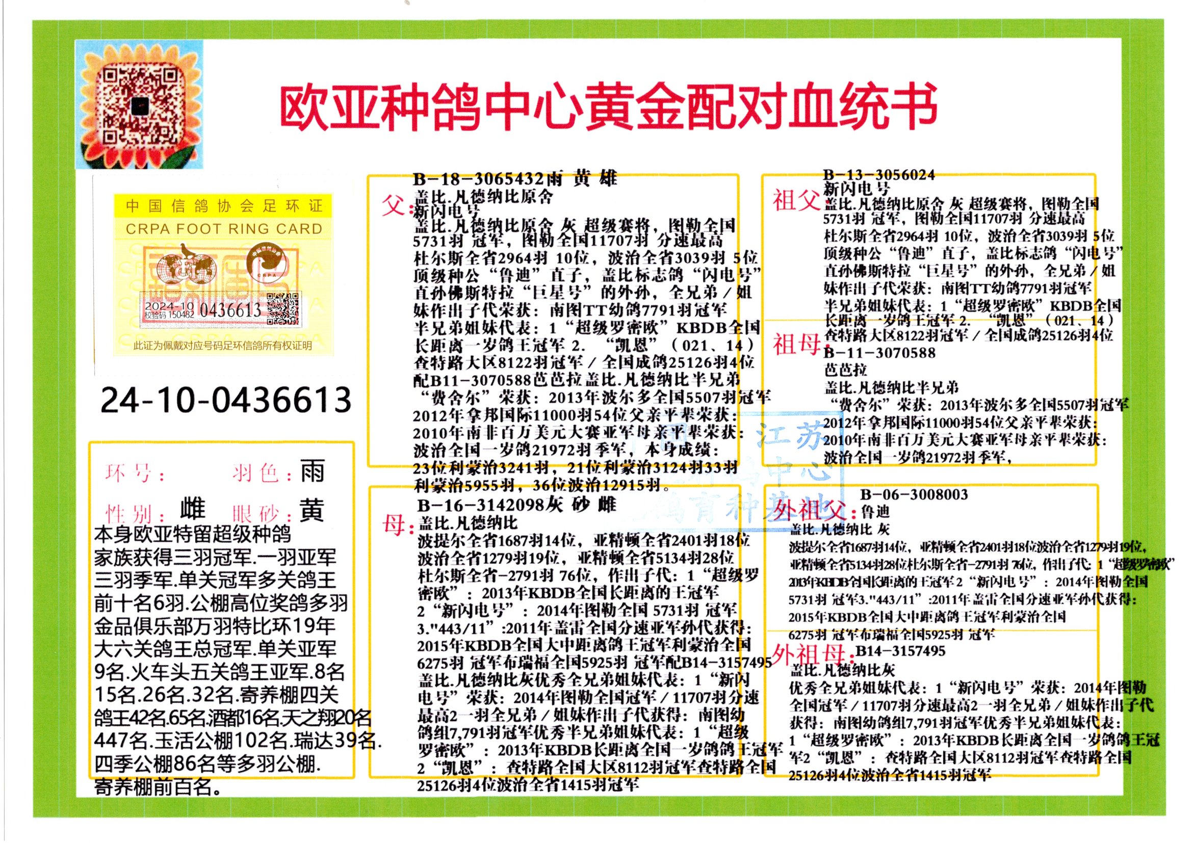 24年秋南京特比環(huán)歐亞榮獲大團(tuán)體冠軍.小團(tuán)體冠軍551公里大特比13名.14名.16名.19名.20名.21名.24名.26名.27名.28名.42名.52名.54名.57名.65名.66名.68名.70名.71名.72名.74名.76名.80名.82名.83名.84名.85名.86名.90名.92名.110名.116名.121名.122名.128名.131名.158名.161名.164名.165名.166名.172名.174名.177名.182名.195名.196名.201名.205名.208名.210名.216名.253名.269名.275名.276名.294名.296名.299名,,24年秋云南天南銅都公棚決賽415名.天南銅都小棚決賽409名.云南玉活公棚決賽102名.490名.團(tuán)體32名上籠二羽進(jìn)二羽,天南銅都大棚506公里決賽445名。熱烈祝賀河北省巨鹿縣李蘭生老師用歐亞泰山號(hào)血系連續(xù)十一年奪冠軍,河北省國(guó)家賽冠軍.全國(guó)季軍等多次前十名高位,揚(yáng)州王軍王總用歐亞利奧24年春季獲山東翔宇公棚決賽33名蓋比53名。南京劉正龍劉總用歐亞蓋比獲得24年秋山東濰坊國(guó)際公棚決賽42名.精英賽30名.三關(guān)鴿王71名.決賽86名.加站賽16名.南京市特比環(huán)A組鴿王9名.B組鴿王5名.6名.C組鴿王5名.精英賽冠軍4名.技能賽A組冠軍4名.5名.秦淮區(qū)特比環(huán)榮獲15名.46名.48名.87名。四川西昌徐亮徐總用歐亞利奧獲得涼山州聚友決賽177名.第二關(guān)亞軍雙關(guān)鴿王19名.三關(guān)鴿王105名.云南豪庭公棚決賽603名。熱烈祝賀24年四川重慶翔園鴿舍用歐亞泰山號(hào)榮獲春季400公里冠軍.秋季500公里冠軍,河北王總用詹森X利奧獲得千羽千翔公棚400公里冠軍,廣東蔡楷煥榮獲24年秋愛好者 賽鴿俱樂(lè)部三關(guān)鴿王季軍.一關(guān)420公里99名.二關(guān)450公里11名.三關(guān)520公里32名.單關(guān)季軍.7名.12名,江西李衛(wèi)興榮獲貴州紅楓公棚8名.共翔俱樂(lè)部寄養(yǎng)棚四關(guān)綜合鴿王30名.一關(guān)400公里78名.二關(guān)500公里55名.三關(guān)520公里37名.四關(guān)500公里57名.同父母獲公棚18名.雷鳴獲得武漢黃浦育翔中心冠軍,四川陳文獲得四川明鴻俱樂(lè)部300公里夢(mèng)幻2名.3名.4名.9名.10名.13名.14名.15名.31名.34名.40名.41名.42名.43名.69名.71名.72名.73名.74名.94名.95名.97名.98名.99名.419公里決賽榮獲總冠軍7名.總共歸巢9羽,四川徐亮獲豪庭決賽603名,山西鄭勇獲得山西泰鑫公棚決賽255名詹森紅狐,熱烈祝賀馬總獲得開爾(飛躍隊(duì))決賽9名獲獎(jiǎng)金1310000萬(wàn)元.第一關(guān)52名,天津津福資賽180公里96名.獲獎(jiǎng)金429543萬(wàn)元,歐亞支持全國(guó)鴿友24年秋多人報(bào)喜 祝大家取得更好成績(jī),給歐亞報(bào)喜鴿友歐亞決定給每人贈(zèng)送一羽超級(jí)種鴿。歐亞俱樂(lè)部特比環(huán)多關(guān)鴿王成績(jī):15年秋淮安特比環(huán)黑色星期一全會(huì)上籠9700多羽,當(dāng)天無(wú)鴿歸巢,第二天全會(huì)歸巢357羽,本舍歸巢158羽.前十名八羽.前一百名歸巢57羽,16年春季獲五關(guān)鴿王總冠軍,總亞軍四名.六名.七名.九名.十名.晶藝俱樂(lè)部520公里冠亞季軍5名.6名.7名.9名.11名等,火車頭冠軍.季軍6名.8名.9名.10名,16年秋晶藝俱樂(lè)部特比環(huán)520公里亞軍.季軍4名.6名.7名.9名,15年春南京白下特比環(huán)冠軍.亞軍.季軍6名.7名.8名.9名.10名.指定鴿A B組獲得冠軍.亞軍.季軍4名.5名.,17年淮安特比環(huán)亞軍.4名.5名.7名.8名.10名.六關(guān)鴿王總冠軍.4名.6名.9名.10名,寄養(yǎng)棚宿遷劉總20羽特比環(huán)獲冠軍.季軍.4名.7名.8名.9名等。18年榮獲萬(wàn)羽特比環(huán)六關(guān)鴿王總冠軍.總亞軍.總季軍.6名.8名.十名.單關(guān)四羽冠軍.二羽亞軍.四羽季軍.前十名27羽。19年秋萬(wàn)羽特比環(huán)六關(guān)鴿王總亞軍.總季軍.5名.8名等,單關(guān)二羽冠軍.三羽亞軍.一羽季軍前十名31羽。20年秋淮安市鴿會(huì)四關(guān)特比環(huán)大賽風(fēng)雨無(wú)阻鴿王亞軍.鴿王六名,金品俱樂(lè)部萬(wàn)羽特比環(huán)六關(guān)鴿王總冠軍,總亞軍.四名.五名.六名.七名.八名.十名.前二百名鴿王35羽,單關(guān)冠亞季軍前十名四十多羽,火車頭五關(guān)鴿王季軍.六名.八名.前二百名鴿王十七羽。20年春榮獲淮安五區(qū)一市四關(guān)鴿王總冠軍.亞軍.四名.八名.九名。21年秋榮獲金品萬(wàn)羽特比環(huán)大賽六關(guān)鴿王總亞軍.總季軍.四名.七名.九名.十名.單關(guān)冠亞軍季軍前十名三十多羽。火車頭協(xié)會(huì)鴿王六名.七名.十名.單關(guān)前十名十七羽。22年秋榮獲鴿王總冠軍.總亞軍.5名.7名.8名.9名.11名.單關(guān)冠亞季軍前十名三十多羽,第一關(guān)單關(guān)前二百名四十多羽,第二關(guān)前二百名三十多羽,第三關(guān)前二百名四十多羽,第四關(guān)前二百名四十多羽,第五關(guān)前一百名53羽。23年秋榮獲鴿王季軍.五名.八名.十名.13名.17名.20名.27名等多羽鴿王.單關(guān)前十名二十多羽。公棚.寄養(yǎng)棚部分成績(jī):16年秋寧夏黃河公棚總冠軍電腦戈馬力指定通炮冠軍,17年送八羽參賽獲得鴿王八名進(jìn)獎(jiǎng)四名,支持韓總榮獲八名。支持鴿友榮獲寧夏中衛(wèi)公棚決賽總冠軍.精英賽冠軍,支持18年寧夏黃河公棚決賽冠軍詹森X泰山。安徽鼎博寄養(yǎng)棚院內(nèi)外四關(guān)鴿王總冠軍.鴿王十七名.三十七名同窩,鴿王39名.42名.58名.67名。18年山東公棚預(yù)賽冠軍.決賽65名.送八羽進(jìn)獎(jiǎng)五羽.指定獲奔馳汽車一輛。支持鴿友獲得云南藍(lán)云公棚冠軍.蓋比X佛卡門。支持鴿友榮獲云南銀集公棚決賽