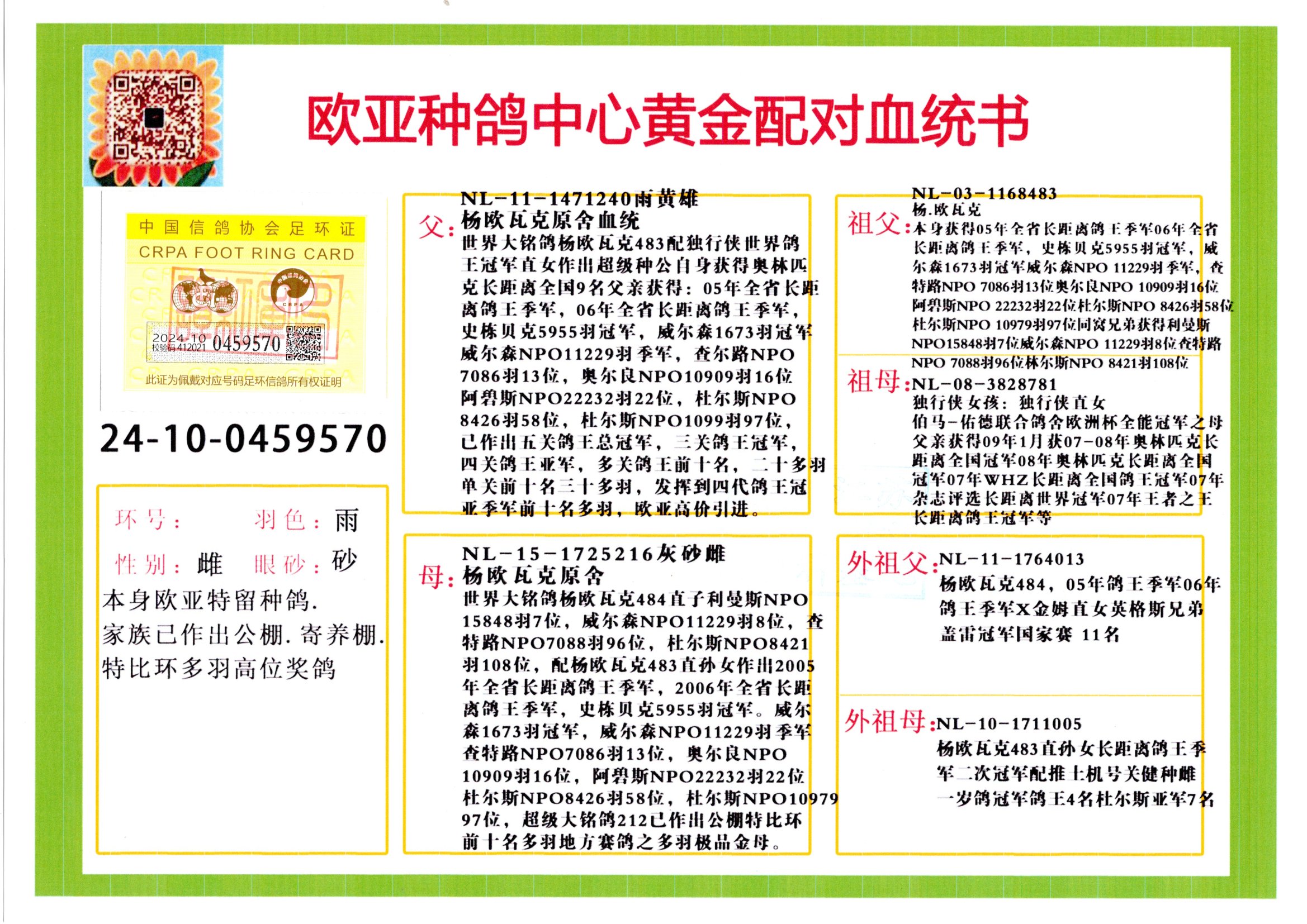 24年秋南京特比環(huán)歐亞榮獲大團體冠軍.小團體冠軍551公里大特比13名.14名.16名.19名.20名.21名.24名.26名.27名.28名.42名.52名.54名.57名.65名.66名.68名.70名.71名.72名.74名.76名.80名.82名.83名.84名.85名.86名.90名.92名.110名.116名.121名.122名.128名.131名.158名.161名.164名.165名.166名.172名.174名.177名.182名.195名.196名.201名.205名.208名.210名.216名.253名.269名.275名.276名.294名.296名.299名,,24年秋云南天南銅都公棚決賽415名.天南銅都小棚決賽409名.云南玉活公棚決賽102名.490名.團體32名上籠二羽進二羽,天南銅都大棚506公里決賽445名。熱烈祝賀河北省巨鹿縣李蘭生老師用歐亞泰山號血系連續(xù)十一年奪冠軍,河北省國家賽冠軍.全國季軍等多次前十名高位,揚州王軍王總用歐亞利奧24年春季獲山東翔宇公棚決賽33名蓋比53名。南京劉正龍劉總用歐亞蓋比獲得24年秋山東濰坊國際公棚決賽42名.精英賽30名.三關(guān)鴿王71名.決賽86名.加站賽16名.南京市特比環(huán)A組鴿王9名.B組鴿王5名.6名.C組鴿王5名.精英賽冠軍4名.技能賽A組冠軍4名.5名.秦淮區(qū)特比環(huán)榮獲15名.46名.48名.87名。四川西昌徐亮徐總用歐亞利奧獲得涼山州聚友決賽177名.第二關(guān)亞軍雙關(guān)鴿王19名.三關(guān)鴿王105名.云南豪庭公棚決賽603名。熱烈祝賀24年四川重慶翔園鴿舍用歐亞泰山號榮獲春季400公里冠軍.秋季500公里冠軍,河北王總用詹森X利奧獲得千羽千翔公棚400公里冠軍,廣東蔡楷煥榮獲24年秋愛好者 賽鴿俱樂部三關(guān)鴿王季軍.一關(guān)420公里99名.二關(guān)450公里11名.三關(guān)520公里32名.單關(guān)季軍.7名.12名,江西李衛(wèi)興榮獲貴州紅楓公棚8名.共翔俱樂部寄養(yǎng)棚四關(guān)綜合鴿王30名.一關(guān)400公里78名.二關(guān)500公里55名.三關(guān)520公里37名.四關(guān)500公里57名.同父母獲公棚18名.雷鳴獲得武漢黃浦育翔中心冠軍,四川陳文獲得四川明鴻俱樂部300公里夢幻2名.3名.4名.9名.10名.13名.14名.15名.31名.34名.40名.41名.42名.43名.69名.71名.72名.73名.74名.94名.95名.97名.98名.99名.419公里決賽榮獲總冠軍7名.總共歸巢9羽,四川徐亮獲豪庭決賽603名,山西鄭勇獲得山西泰鑫公棚決賽255名詹森紅狐,熱烈祝賀馬總獲得開爾(飛躍隊)決賽9名獲獎金1310000萬元.第一關(guān)52名,天津津福資賽180公里96名.獲獎金429543萬元,歐亞支持全國鴿友24年秋多人報喜 祝大家取得更好成績,給歐亞報喜鴿友歐亞決定給每人贈送一羽超級種鴿。歐亞俱樂部特比環(huán)多關(guān)鴿王成績:15年秋淮安特比環(huán)黑色星期一全會上籠9700多羽,當天無鴿歸巢,第二天全會歸巢357羽,本舍歸巢158羽.前十名八羽.前一百名歸巢57羽,16年春季獲五關(guān)鴿王總冠軍,總亞軍四名.六名.七名.九名.十名.晶藝俱樂部520公里冠亞季軍5名.6名.7名.9名.11名等,火車頭冠軍.季軍6名.8名.9名.10名,16年秋晶藝俱樂部特比環(huán)520公里亞軍.季軍4名.6名.7名.9名,15年春南京白下特比環(huán)冠軍.亞軍.季軍6名.7名.8名.9名.10名.指定鴿A B組獲得冠軍.亞軍.季軍4名.5名.,17年淮安特比環(huán)亞軍.4名.5名.7名.8名.10名.六關(guān)鴿王總冠軍.4名.6名.9名.10名,寄養(yǎng)棚宿遷劉總20羽特比環(huán)獲冠軍.季軍.4名.7名.8名.9名等。18年榮獲萬羽特比環(huán)六關(guān)鴿王總冠軍.總亞軍.總季軍.6名.8名.十名.單關(guān)四羽冠軍.二羽亞軍.四羽季軍.前十名27羽。19年秋萬羽特比環(huán)六關(guān)鴿王總亞軍.總季軍.5名.8名等,單關(guān)二羽冠軍.三羽亞軍.一羽季軍前十名31羽。20年秋淮安市鴿會四關(guān)特比環(huán)大賽風雨無阻鴿王亞軍.鴿王六名,金品俱樂部萬羽特比環(huán)六關(guān)鴿王總冠軍,總亞軍.四名.五名.六名.七名.八名.十名.前二百名鴿王35羽,單關(guān)冠亞季軍前十名四十多羽,火車頭五關(guān)鴿王季軍.六名.八名.前二百名鴿王十七羽。20年春榮獲淮安五區(qū)一市四關(guān)鴿王總冠軍.亞軍.四名.八名.九名。21年秋榮獲金品萬羽特比環(huán)大賽六關(guān)鴿王總亞軍.總季軍.四名.七名.九名.十名.單關(guān)冠亞軍季軍前十名三十多羽;疖囶^協(xié)會鴿王六名.七名.十名.單關(guān)前十名十七羽。22年秋榮獲鴿王總冠軍.總亞軍.5名.7名.8名.9名.11名.單關(guān)冠亞季軍前十名三十多羽,第一關(guān)單關(guān)前二百名四十多羽,第二關(guān)前二百名三十多羽,第三關(guān)前二百名四十多羽,第四關(guān)前二百名四十多羽,第五關(guān)前一百名53羽。23年秋榮獲鴿王季軍.五名.八名.十名.13名.17名.20名.27名等多羽鴿王.單關(guān)前十名二十多羽。公棚.寄養(yǎng)棚部分成績:16年秋寧夏黃河公棚總冠軍電腦戈馬力指定通炮冠軍,17年送八羽參賽獲得鴿王八名進獎四名,支持韓總榮獲八名。支持鴿友榮獲寧夏中衛(wèi)公棚決賽總冠軍.精英賽冠軍,支持18年寧夏黃河公棚決賽冠軍詹森X泰山。安徽鼎博寄養(yǎng)棚院內(nèi)外四關(guān)鴿王總冠軍.鴿王十七名.三十七名同窩,鴿王39名.42名.58名.67名。18年山東公棚預賽冠軍.決賽65名.送八羽進獎五羽.指定獲奔馳汽車一輛。支持鴿友獲得云南藍云公棚冠軍.蓋比X佛卡門。支持鴿友榮獲云南銀集公棚決賽冠軍 詹森427X520血系 速度賽6700羽冠軍。17年榮獲金馬俱樂部寄養(yǎng)棚四關(guān)鴿王總冠軍.季軍.六名.八名.第一關(guān)冠軍.亞軍.季軍四名.七名.十一名.金牌教練獎。支持鴿友18年北京費翔公棚預賽九名電腦X桑杰士,支持鴿友榮