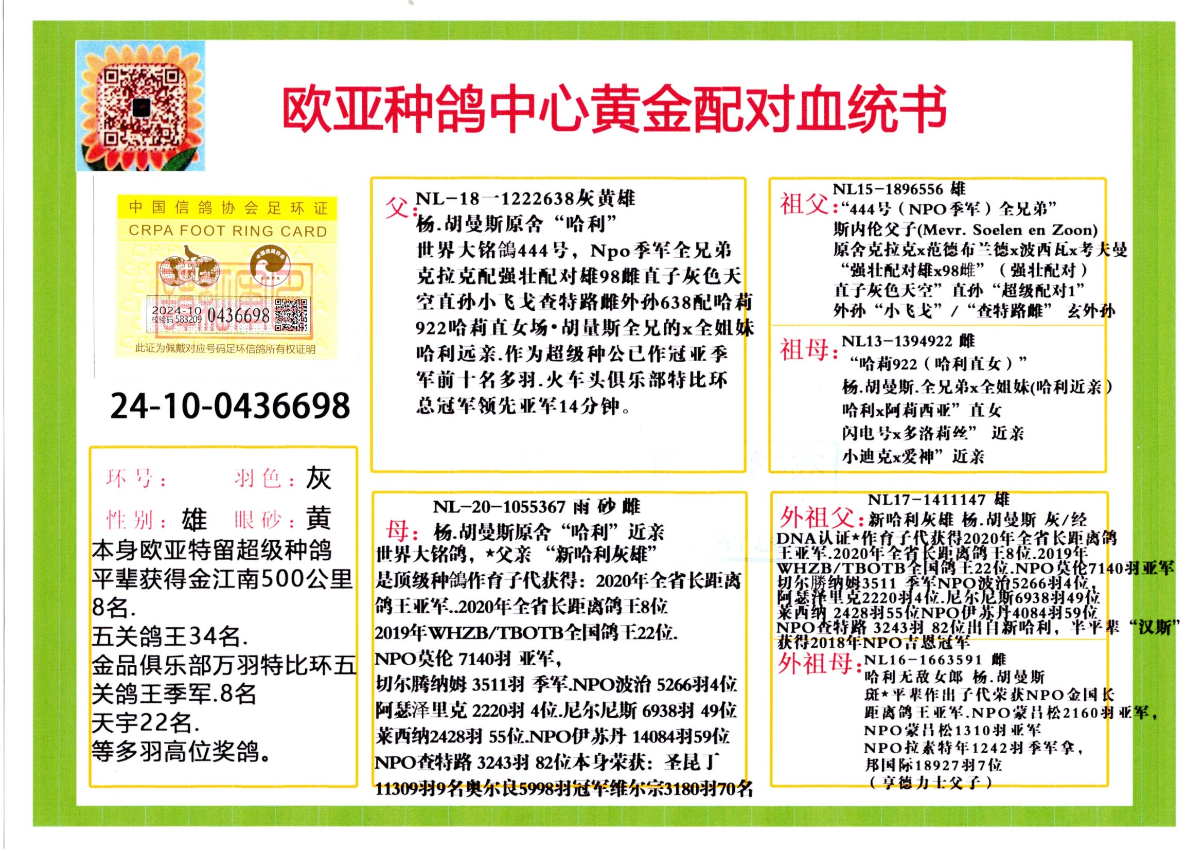 24年秋南京特比環(huán)歐亞榮獲大團(tuán)體冠軍.小團(tuán)體冠軍551公里大特比13名.14名.16名.19名.20名.21名.24名.26名.27名.28名.42名.52名.54名.57名.65名.66名.68名.70名.71名.72名.74名.76名.80名.82名.83名.84名.85名.86名.90名.92名.110名.116名.121名.122名.128名.131名.158名.161名.164名.165名.166名.172名.174名.177名.182名.195名.196名.201名.205名.208名.210名.216名.253名.269名.275名.276名.294名.296名.299名,,24年秋云南天南銅都公棚決賽415名.天南銅都小棚決賽409名.云南玉活公棚決賽102名.490名.團(tuán)體32名上籠二羽進(jìn)二羽,天南銅都大棚506公里決賽445名。熱烈祝賀河北省巨鹿縣李蘭生老師用歐亞泰山號(hào)血系連續(xù)十一年奪冠軍,河北省國家賽冠軍.全國季軍等多次前十名高位,揚(yáng)州王軍王總用歐亞利奧24年春季獲山東翔宇公棚決賽33名蓋比53名。南京劉正龍劉總用歐亞蓋比獲得24年秋山東濰坊國際公棚決賽42名.精英賽30名.三關(guān)鴿王71名.決賽86名.加站賽16名.南京市特比環(huán)A組鴿王9名.B組鴿王5名.6名.C組鴿王5名.精英賽冠軍4名.技能賽A組冠軍4名.5名.秦淮區(qū)特比環(huán)榮獲15名.46名.48名.87名。四川西昌徐亮徐總用歐亞利奧獲得涼山州聚友決賽177名.第二關(guān)亞軍雙關(guān)鴿王19名.三關(guān)鴿王105名.云南豪庭公棚決賽603名。熱烈祝賀24年四川重慶翔園鴿舍用歐亞泰山號(hào)榮獲春季400公里冠軍.秋季500公里冠軍,河北王總用詹森X利奧獲得千羽千翔公棚400公里冠軍,廣東蔡楷煥榮獲24年秋愛好者 賽鴿俱樂部三關(guān)鴿王季軍.一關(guān)420公里99名.二關(guān)450公里11名.三關(guān)520公里32名.單關(guān)季軍.7名.12名,江西李衛(wèi)興榮獲貴州紅楓公棚8名.共翔俱樂部寄養(yǎng)棚四關(guān)綜合鴿王30名.一關(guān)400公里78名.二關(guān)500公里55名.三關(guān)520公里37名.四關(guān)500公里57名.同父母獲公棚18名.雷鳴獲得武漢黃浦育翔中心冠軍,四川陳文獲得四川明鴻俱樂部300公里夢(mèng)幻2名.3名.4名.9名.10名.13名.14名.15名.31名.34名.40名.41名.42名.43名.69名.71名.72名.73名.74名.94名.95名.97名.98名.99名.419公里決賽榮獲總冠軍7名.總共歸巢9羽,四川徐亮獲豪庭決賽603名,山西鄭勇獲得山西泰鑫公棚決賽255名詹森紅狐,熱烈祝賀馬總獲得開爾(飛躍隊(duì))決賽9名獲獎(jiǎng)金1310000萬元.第一關(guān)52名,天津津福資賽180公里96名.獲獎(jiǎng)金429543萬元,歐亞支持全國鴿友24年秋多人報(bào)喜 祝大家取得更好成績,給歐亞報(bào)喜鴿友歐亞決定給每人贈(zèng)送一羽超級(jí)種鴿。歐亞俱樂部特比環(huán)多關(guān)鴿王成績:15年秋淮安特比環(huán)黑色星期一全會(huì)上籠9700多羽,當(dāng)天無鴿歸巢,第二天全會(huì)歸巢357羽,本舍歸巢158羽.前十名八羽.前一百名歸巢57羽,16年春季獲五關(guān)鴿王總冠軍,總亞軍四名.六名.七名.九名.十名.晶藝俱樂部520公里冠亞季軍5名.6名.7名.9名.11名等,火車頭冠軍.季軍6名.8名.9名.10名,16年秋晶藝俱樂部特比環(huán)520公里亞軍.季軍4名.6名.7名.9名,15年春南京白下特比環(huán)冠軍.亞軍.季軍6名.7名.8名.9名.10名.指定鴿A B組獲得冠軍.亞軍.季軍4名.5名.,17年淮安特比環(huán)亞軍.4名.5名.7名.8名.10名.六關(guān)鴿王總冠軍.4名.6名.9名.10名,寄養(yǎng)棚宿遷劉總20羽特比環(huán)獲冠軍.季軍.4名.7名.8名.9名等。18年榮獲萬羽特比環(huán)六關(guān)鴿王總冠軍.總亞軍.總季軍.6名.8名.十名.單關(guān)四羽冠軍.二羽亞軍.四羽季軍.前十名27羽。19年秋萬羽特比環(huán)六關(guān)鴿王總亞軍.總季軍.5名.8名等,單關(guān)二羽冠軍.三羽亞軍.一羽季軍前十名31羽。20年秋淮安市鴿會(huì)四關(guān)特比環(huán)大賽風(fēng)雨無阻鴿王亞軍.鴿王六名,金品俱樂部萬羽特比環(huán)六關(guān)鴿王總冠軍,總亞軍.四名.五名.六名.七名.八名.十名.前二百名鴿王35羽,單關(guān)冠亞季軍前十名四十多羽,火車頭五關(guān)鴿王季軍.六名.八名.前二百名鴿王十七羽。20年春榮獲淮安五區(qū)一市四關(guān)鴿王總冠軍.亞軍.四名.八名.九名。21年秋榮獲金品萬羽特比環(huán)大賽六關(guān)鴿王總亞軍.總季軍.四名.七名.九名.十名.單關(guān)冠亞軍季軍前十名三十多羽。火車頭協(xié)會(huì)鴿王六名.七名.十名.單關(guān)前十名十七羽。22年秋榮獲鴿王總冠軍.總亞軍.5名.7名.8名.9名.11名.單關(guān)冠亞季軍前十名三十多羽,第一關(guān)單關(guān)前二百名四十多羽,第二關(guān)前二百名三十多羽,第三關(guān)前二百名四十多羽,第四關(guān)前二百名四十多羽,第五關(guān)前一百名53羽。23年秋榮獲鴿王季軍.五名.八名.十名.13名.17名.20名.27名等多羽鴿王.單關(guān)前十名二十多羽。公棚.寄養(yǎng)棚部分成績:16年秋寧夏黃河公棚總冠軍電腦戈馬力指定通炮冠軍,17年送八羽參賽獲得鴿王八名進(jìn)獎(jiǎng)四名,支持韓總榮獲八名。支持鴿友榮獲寧夏中衛(wèi)公棚決賽總冠軍.精英賽冠軍,支持18年寧夏黃河公棚決賽冠軍詹森X泰山。安徽鼎博寄養(yǎng)棚院內(nèi)外四關(guān)鴿王總冠軍.鴿王十七名.三十七名同窩,鴿王39名.42名.58名.67名。18年山東公棚預(yù)賽冠軍.決賽65名.送八羽進(jìn)獎(jiǎng)五羽.指定獲奔馳汽車一輛。支持鴿友獲得云南藍(lán)云公棚冠軍.蓋比X佛卡門。支持鴿友榮獲云南銀集公棚決賽冠軍 詹森427X520血系 速度賽6700羽冠軍。17年榮獲金馬俱樂部寄養(yǎng)棚四關(guān)鴿王總冠軍