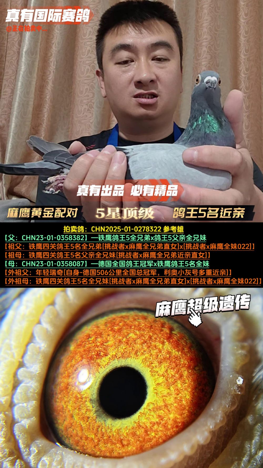 由于所有拍賣鴿均沒有作育記錄,因此無法100%保證雌雄的正確性,拍賣視頻中的雌雄僅供參考,最終以實物為主。如有雌雄特殊要求請及時聯(lián)系真有國際確認,所有拍賣鴿均享受7天免費換鴿服務(運費自理),由于拍賣形式的鴿子具備商品的唯一性,因此不支持退款服務,感謝大家的理解與支持!謝謝!