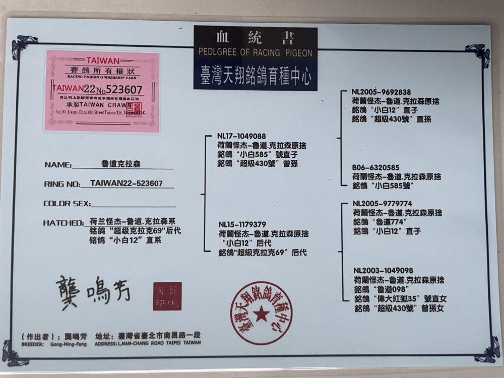 1597471 | 血統(tǒng) 詹森紫光皇帝鴿王6位 | ¥200元 | 1次 |