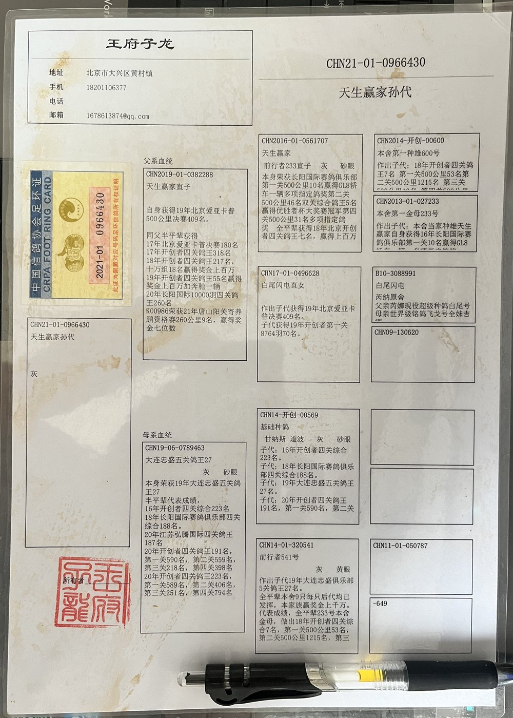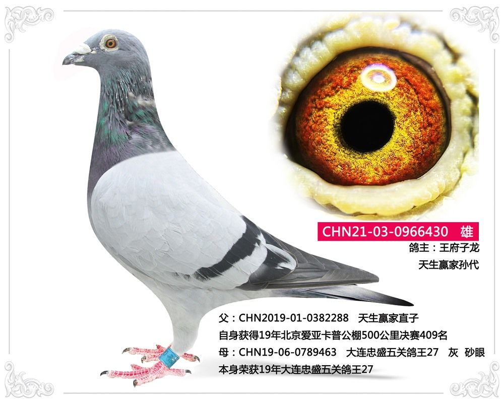 父:CHN2019-01-0382288 天生贏家直子 自身獲得19年北京愛亞卡普公棚500公里決賽409名 同父半平輩獲得:17年北京愛亞卡普決賽180名;17年開創(chuàng)者四關(guān)鴿王318名;18年開創(chuàng)者四關(guān)鴿王217名;十萬組18名贏得獎(jiǎng)金上百萬;19年開創(chuàng)者四關(guān)鴿王55名贏得獎(jiǎng)金上百萬加奔馳一輛;20年長(zhǎng)陽(yáng)國(guó)際10000羽四關(guān)鴿王260名;K00986榮獲21年唐山陽(yáng)關(guān)寄養(yǎng)棚資格賽260公里9名,贏得獎(jiǎng)金七位數(shù)