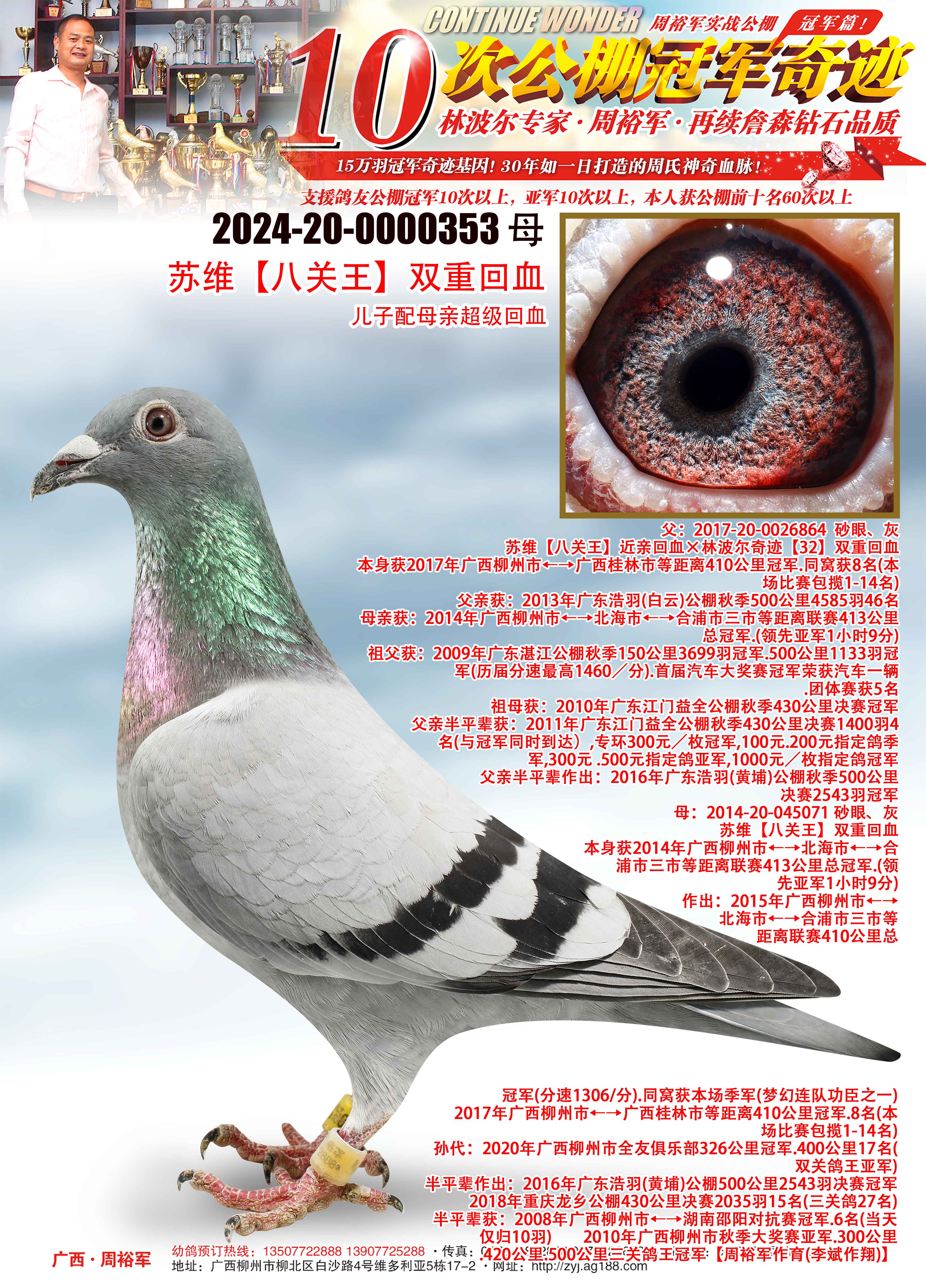 2010年廣西柳州市秋季大獎(jiǎng)賽亞軍、300公里、420公里、500公里三關(guān)鴿王冠軍【周裕軍作育、李斌作翔】