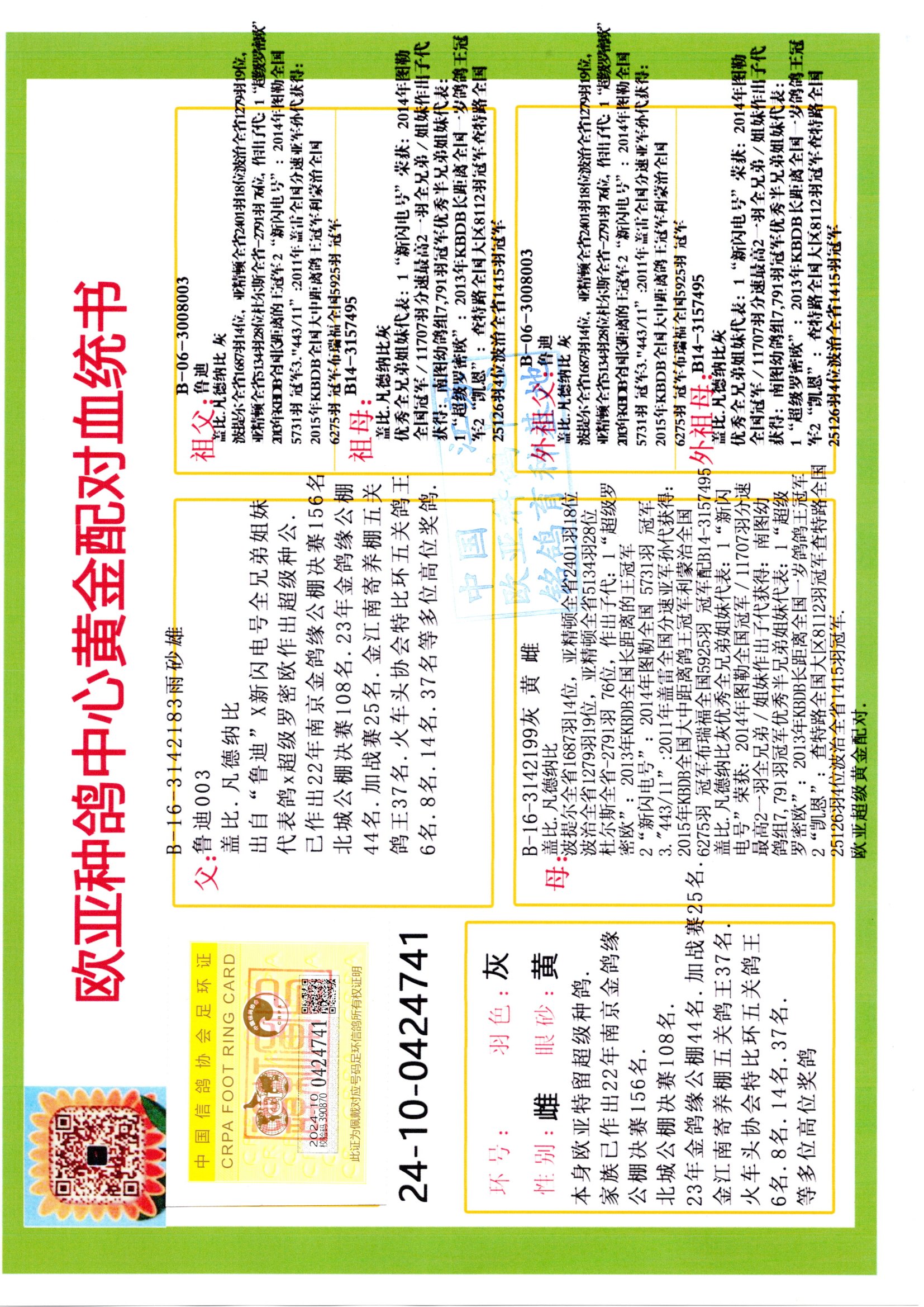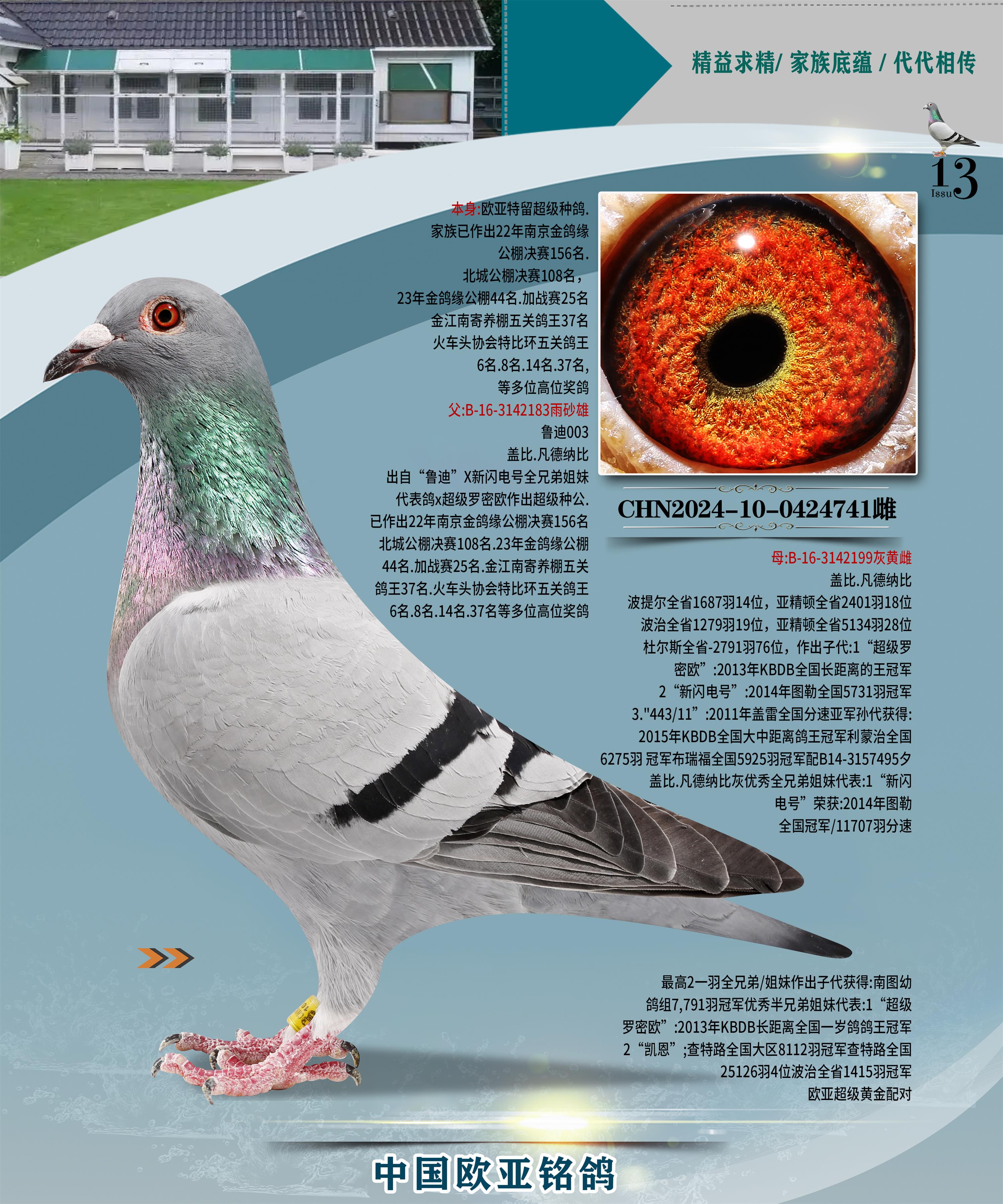24年秋南京特比環(huán)歐亞榮獲大團(tuán)體冠軍.小團(tuán)體冠軍551公里大特比13名.14名.16名.19名.20名.21名.24名.26名.27名.28名.42名.52名.54名.57名.65名.66名.68名.70名.71名.72名.74名.76名.80名.82名.83名.84名.85名.86名.90名.92名.110名.116名.121名.122名.128名.131名.158名.161名.164名.165名.166名.172名.174名.177名.182名.195名.196名.201名.205名.208名.210名.216名.253名.269名.275名.276名.294名.296名.299名,,24年秋云南天南銅都公棚決賽415名.天南銅都小棚決賽409名.云南玉活公棚決賽102名.490名.團(tuán)體32名上籠二羽進(jìn)二羽,天南銅都大棚506公里決賽445名。熱烈祝賀河北省巨鹿縣李蘭生老師用歐亞泰山號血系連續(xù)十一年奪冠軍,河北省國家賽冠軍.全國季軍等多次前十名高位,揚(yáng)州王軍王總用歐亞利奧24年春季獲山東翔宇公棚決賽33名蓋比53名。南京劉正龍劉總用歐亞蓋比獲得24年秋山東濰坊國際公棚決賽42名.精英賽30名.三關(guān)鴿王71名.決賽86名.加站賽16名.南京市特比環(huán)A組鴿王9名.B組鴿王5名.6名.C組鴿王5名.精英賽冠軍4名.技能賽A組冠軍4名.5名.秦淮區(qū)特比環(huán)榮獲15名.46名.48名.87名。四川西昌徐亮徐總用歐亞利奧獲得涼山州聚友決賽177名.第二關(guān)亞軍雙關(guān)鴿王19名.三關(guān)鴿王105名.云南豪庭公棚決賽603名。熱烈祝賀24年四川重慶翔園鴿舍用歐亞泰山號榮獲春季400公里冠軍.秋季500公里冠軍,河北王總用詹森X利奧獲得千羽千翔公棚400公里冠軍,廣東蔡楷煥榮獲24年秋愛好者 賽鴿俱樂部三關(guān)鴿王季軍.一關(guān)420公里99名.二關(guān)450公里11名.三關(guān)520公里32名.單關(guān)季軍.7名.12名,江西李衛(wèi)興榮獲貴州紅楓公棚8名.共翔俱樂部寄養(yǎng)棚四關(guān)綜合鴿王30名.一關(guān)400公里78名.二關(guān)500公里55名.三關(guān)520公里37名.四關(guān)500公里57名.同父母獲公棚18名.雷鳴獲得武漢黃浦育翔中心冠軍,四川陳文獲得四川明鴻俱樂部300公里夢幻2名.3名.4名.9名.10名.13名.14名.15名.31名.34名.40名.41名.42名.43名.69名.71名.72名.73名.74名.94名.95名.97名.98名.99名.419公里決賽榮獲總冠軍7名.總共歸巢9羽,四川徐亮獲豪庭決賽603名,山西鄭勇獲得山西泰鑫公棚決賽255名詹森紅狐,熱烈祝賀馬總獲得開爾(飛躍隊(duì))決賽9名獲獎金1310000萬元.第一關(guān)52名,天津津福資賽180公里96名.獲獎金429543萬元,歐亞支持全國鴿友24年秋多人報喜 祝大家取得更好成績,給歐亞報喜鴿友歐亞決定給每人贈送一羽超級種鴿。歐亞俱樂部特比環(huán)多關(guān)鴿王成績:15年秋淮安特比環(huán)黑色星期一全會上籠9700多羽,當(dāng)天無鴿歸巢,第二天全會歸巢357羽,本舍歸巢158羽.前十名八羽.前一百名歸巢57羽,16年春季獲五關(guān)鴿王總冠軍,總亞軍四名.六名.七名.九名.十名.晶藝俱樂部520公里冠亞季軍5名.6名.7名.9名.11名等,火車頭冠軍.季軍6名.8名.9名.10名,16年秋晶藝俱樂部特比環(huán)520公里亞軍.季軍4名.6名.7名.9名,15年春南京白下特比環(huán)冠軍.亞軍.季軍6名.7名.8名.9名.10名.指定鴿A B組獲得冠軍.亞軍.季軍4名.5名.,17年淮安特比環(huán)亞軍.4名.5名.7名.8名.10名.六關(guān)鴿王總冠軍.4名.6名.9名.10名,寄養(yǎng)棚宿遷劉總20羽特比環(huán)獲冠軍.季軍.4名.7名.8名.9名等。18年榮獲萬羽特比環(huán)六關(guān)鴿王總冠軍.總亞軍.總季軍.6名.8名.十名.單關(guān)四羽冠軍.二羽亞軍.四羽季軍.前十名27羽。19年秋萬羽特比環(huán)六關(guān)鴿王總亞軍.總季軍.5名.8名等,單關(guān)二羽冠軍.三羽亞軍.一羽季軍前十名31羽。20年秋淮安市鴿會四關(guān)特比環(huán)大賽風(fēng)雨無阻鴿王亞軍.鴿王六名,金品俱樂部萬羽特比環(huán)六關(guān)鴿王總冠軍,總亞軍.四名.五名.六名.七名.八名.十名.前二百名鴿王35羽,單關(guān)冠亞季軍前十名四十多羽,火車頭五關(guān)鴿王季軍.六名.八名.前二百名鴿王十七羽。20年春榮獲淮安五區(qū)一市四關(guān)鴿王總冠軍.亞軍.四名.八名.九名。21年秋榮獲金品萬羽特比環(huán)大賽六關(guān)鴿王總亞軍.總季軍.四名.七名.九名.十名.單關(guān)冠亞軍季軍前十名三十多羽。火車頭協(xié)會鴿王六名.七名.十名.單關(guān)前十名十七羽。22年秋榮獲鴿王總冠軍.總亞軍.5名.7名.8名.9名.11名.單關(guān)冠亞季軍前十名三十多羽,第一關(guān)單關(guān)前二百名四十多羽,第二關(guān)前二百名三十多羽,第三關(guān)前二百名四十多羽,第四關(guān)前二百名四十多羽,第五關(guān)前一百名53羽。23年秋榮獲鴿王季軍.五名.八名.十名.13名.17名.20名.27名等多羽鴿王.單關(guān)前十名二十多羽。公棚.寄養(yǎng)棚部分成績:16年秋寧夏黃河公棚總冠軍電腦戈馬力指定通炮冠軍,17年送八羽參賽獲得鴿王八名進(jìn)獎四名,支持韓總榮獲八名。支持鴿友榮獲寧夏中衛(wèi)公棚決賽總冠軍.精英賽冠軍,支持18年寧夏黃河公棚決賽冠軍詹森X泰山。安徽鼎博寄養(yǎng)棚院內(nèi)外四關(guān)鴿王總冠軍.鴿王十七名.三十七名同窩,鴿王39名.42名.58名.67名。18年山東公棚預(yù)賽冠軍.決賽65名.送八羽進(jìn)獎五羽.指定獲奔馳汽車一輛。支持鴿友獲得云南藍(lán)云公棚冠軍.蓋比X佛卡門。支持鴿友榮獲云南銀集公棚決賽冠軍 詹森427X520血系 速度賽6700羽冠軍。17年榮獲金馬俱樂部寄養(yǎng)棚四關(guān)鴿王總冠軍.季軍.六名.八名.第一關(guān)冠軍.亞軍.季軍四名.七名.十一名.金牌教練獎