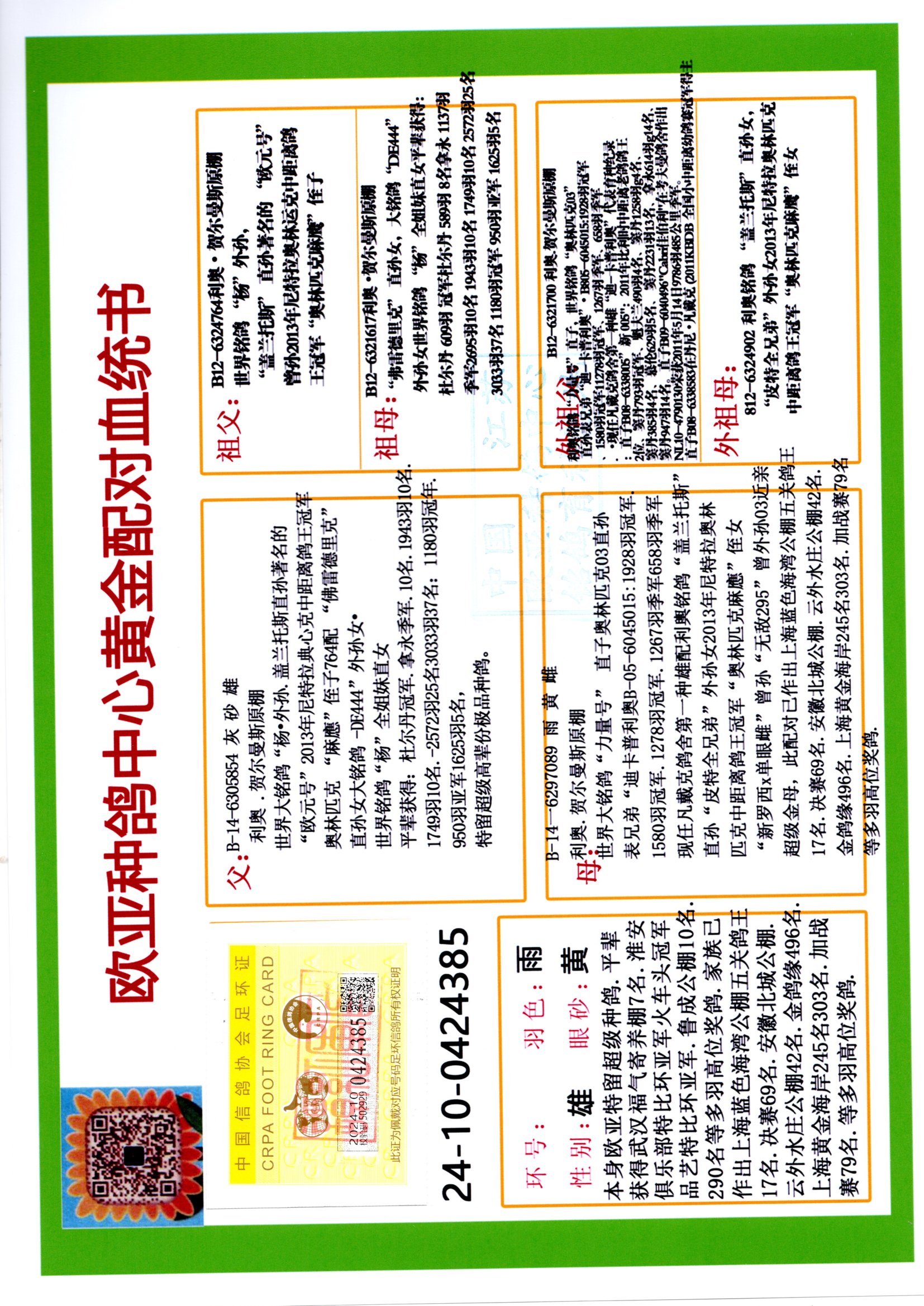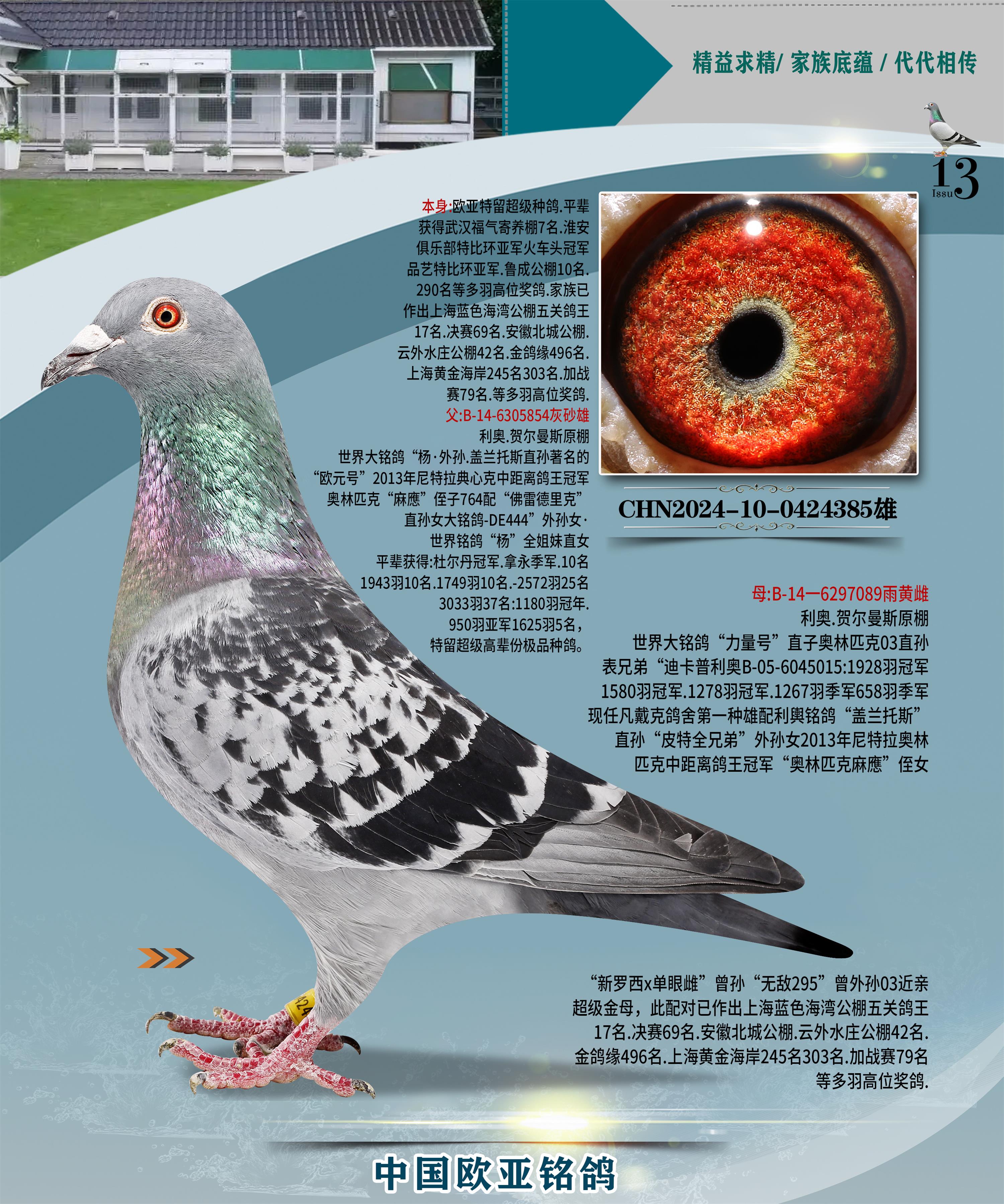 24年秋南京特比環(huán)歐亞榮獲大團體冠軍.小團體冠軍551公里大特比13名.14名.16名.19名.20名.21名.24名.26名.27名.28名.42名.52名.54名.57名.65名.66名.68名.70名.71名.72名.74名.76名.80名.82名.83名.84名.85名.86名.90名.92名.110名.116名.121名.122名.128名.131名.158名.161名.164名.165名.166名.172名.174名.177名.182名.195名.196名.201名.205名.208名.210名.216名.253名.269名.275名.276名.294名.296名.299名,,24年秋云南天南銅都公棚決賽415名.天南銅都小棚決賽409名.云南玉活公棚決賽102名.490名.團體32名上籠二羽進二羽,天南銅都大棚506公里決賽445名。熱烈祝賀河北省巨鹿縣李蘭生老師用歐亞泰山號血系連續(xù)十一年奪冠軍,河北省國家賽冠軍.全國季軍等多次前十名高位,揚州王軍王總用歐亞利奧24年春季獲山東翔宇公棚決賽33名蓋比53名。南京劉正龍劉總用歐亞蓋比獲得24年秋山東濰坊國際公棚決賽42名.精英賽30名.三關鴿王71名.決賽86名.加站賽16名.南京市特比環(huán)A組鴿王9名.B組鴿王5名.6名.C組鴿王5名.精英賽冠軍4名.技能賽A組冠軍4名.5名.秦淮區(qū)特比環(huán)榮獲15名.46名.48名.87名。四川西昌徐亮徐總用歐亞利奧獲得涼山州聚友決賽177名.第二關亞軍雙關鴿王19名.三關鴿王105名.云南豪庭公棚決賽603名。熱烈祝賀24年四川重慶翔園鴿舍用歐亞泰山號榮獲春季400公里冠軍.秋季500公里冠軍,河北王總用詹森X利奧獲得千羽千翔公棚400公里冠軍,廣東蔡楷煥榮獲24年秋愛好者 賽鴿俱樂部三關鴿王季軍.一關420公里99名.二關450公里11名.三關520公里32名.單關季軍.7名.12名,江西李衛(wèi)興榮獲貴州紅楓公棚8名.共翔俱樂部寄養(yǎng)棚四關綜合鴿王30名.一關400公里78名.二關500公里55名.三關520公里37名.四關500公里57名.同父母獲公棚18名.雷鳴獲得武漢黃浦育翔中心冠軍,四川陳文獲得四川明鴻俱樂部300公里夢幻2名.3名.4名.9名.10名.13名.14名.15名.31名.34名.40名.41名.42名.43名.69名.71名.72名.73名.74名.94名.95名.97名.98名.99名.419公里決賽榮獲總冠軍7名.總共歸巢9羽,四川徐亮獲豪庭決賽603名,山西鄭勇獲得山西泰鑫公棚決賽255名詹森紅狐,熱烈祝賀馬總獲得開爾(飛躍隊)決賽9名獲獎金1310000萬元.第一關52名,天津津福資賽180公里96名.獲獎金429543萬元,歐亞支持全國鴿友24年秋多人報喜 祝大家取得更好成績,給歐亞報喜鴿友歐亞決定給每人贈送一羽超級種鴿。歐亞俱樂部特比環(huán)多關鴿王成績:15年秋淮安特比環(huán)黑色星期一全會上籠9700多羽,當天無鴿歸巢,第二天全會歸巢357羽,本舍歸巢158羽.前十名八羽.前一百名歸巢57羽,16年春季獲五關鴿王總冠軍,總亞軍四名.六名.七名.九名.十名.晶藝俱樂部520公里冠亞季軍5名.6名.7名.9名.11名等,火車頭冠軍.季軍6名.8名.9名.10名,16年秋晶藝俱樂部特比環(huán)520公里亞軍.季軍4名.6名.7名.9名,15年春南京白下特比環(huán)冠軍.亞軍.季軍6名.7名.8名.9名.10名.指定鴿A B組獲得冠軍.亞軍.季軍4名.5名.,17年淮安特比環(huán)亞軍.4名.5名.7名.8名.10名.六關鴿王總冠軍.4名.6名.9名.10名,寄養(yǎng)棚宿遷劉總20羽特比環(huán)獲冠軍.季軍.4名.7名.8名.9名等。18年榮獲萬羽特比環(huán)六關鴿王總冠軍.總亞軍.總季軍.6名.8名.十名.單關四羽冠軍.二羽亞軍.四羽季軍.前十名27羽。19年秋萬羽特比環(huán)六關鴿王總亞軍.總季軍.5名.8名等,單關二羽冠軍.三羽亞軍.一羽季軍前十名31羽。20年秋淮安市鴿會四關特比環(huán)大賽風雨無阻鴿王亞軍.鴿王六名,金品俱樂部萬羽特比環(huán)六關鴿王總冠軍,總亞軍.四名.五名.六名.七名.八名.十名.前二百名鴿王35羽,單關冠亞季軍前十名四十多羽,火車頭五關鴿王季軍.六名.八名.前二百名鴿王十七羽。20年春榮獲淮安五區(qū)一市四關鴿王總冠軍.亞軍.四名.八名.九名。21年秋榮獲金品萬羽特比環(huán)大賽六關鴿王總亞軍.總季軍.四名.七名.九名.十名.單關冠亞軍季軍前十名三十多羽;疖囶^協(xié)會鴿王六名.七名.十名.單關前十名十七羽。22年秋榮獲鴿王總冠軍.總亞軍.5名.7名.8名.9名.11名.單關冠亞季軍前十名三十多羽,第一關單關前二百名四十多羽,第二關前二百名三十多羽,第三關前二百名四十多羽,第四關前二百名四十多羽,第五關前一百名53羽。23年秋榮獲鴿王季軍.五名.八名.十名.13名.17名.20名.27名等多羽鴿王.單關前十名二十多羽。公棚.寄養(yǎng)棚部分成績:16年秋寧夏黃河公棚總冠軍電腦戈馬力指定通炮冠軍,17年送八羽參賽獲得鴿王八名進獎四名,支持韓總榮獲八名。支持鴿友榮獲寧夏中衛(wèi)公棚決賽總冠軍.精英賽冠軍,支持18年寧夏黃河公棚決賽冠軍詹森X泰山。安徽鼎博寄養(yǎng)棚院內外四關鴿王總冠軍.鴿王十七名.三十七名同窩,鴿王39名.42名.58名.67名。18年山東公棚預賽冠軍.決賽65名.送八羽進獎五羽.指定獲奔馳汽車一輛。支持鴿友獲得云南藍云公棚冠軍.蓋比X佛卡門。支持鴿友榮獲云南銀集公棚決賽冠軍 詹森427X520血系 速度賽6700羽冠軍。17年榮獲金馬俱樂部寄養(yǎng)棚四關鴿王總冠軍.季軍.六名.八名.第一關冠軍.亞軍.季軍四名.七名.十一名.金牌教練獎。支持鴿友18年北京費翔公棚預賽九名電腦X桑杰士,支持鴿友榮獲陜西威力公棚決賽11名.內蒙古臨河寄養(yǎng)棚四關鴿王六名.詹森配泰山,支持河北王總用歐亞詹森427配胡本喜獲20年秋開爾青年棚季軍。云南東榮公棚16年預賽冠軍.決賽77名.17年決賽12名.詹森紅狐X泰山,17年平安公棚決賽4名