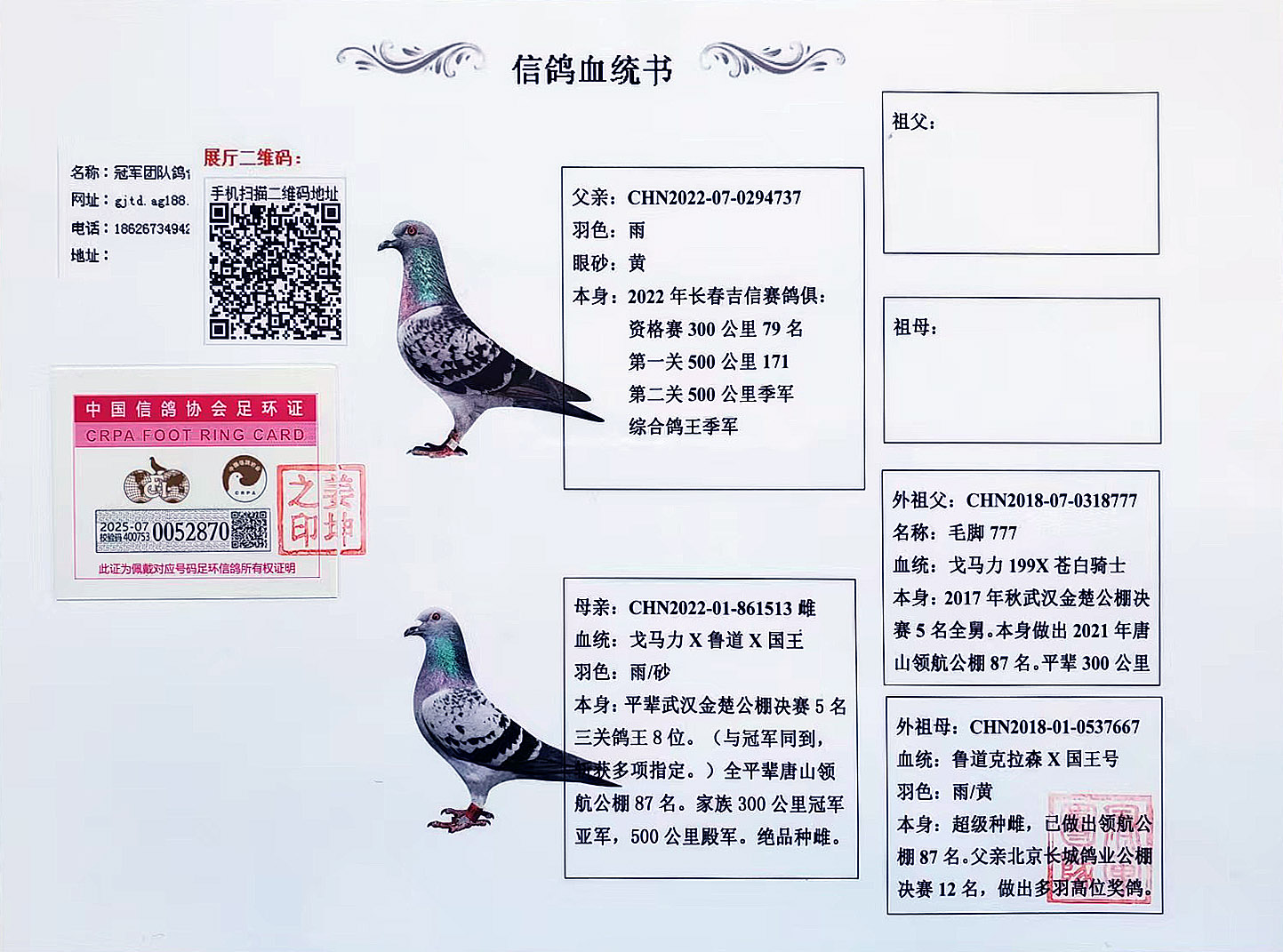 血統(tǒng)書足環(huán)卡隨鴿發(fā)出,低價位高品質(zhì)幼鴿,種賽皆宜。良心做人,所有成績血統(tǒng)假一賠百,不做虛假宣傳!當曖贅氪菩塾啥嗄昃楹屯雅卸轄齬┎慰跡�