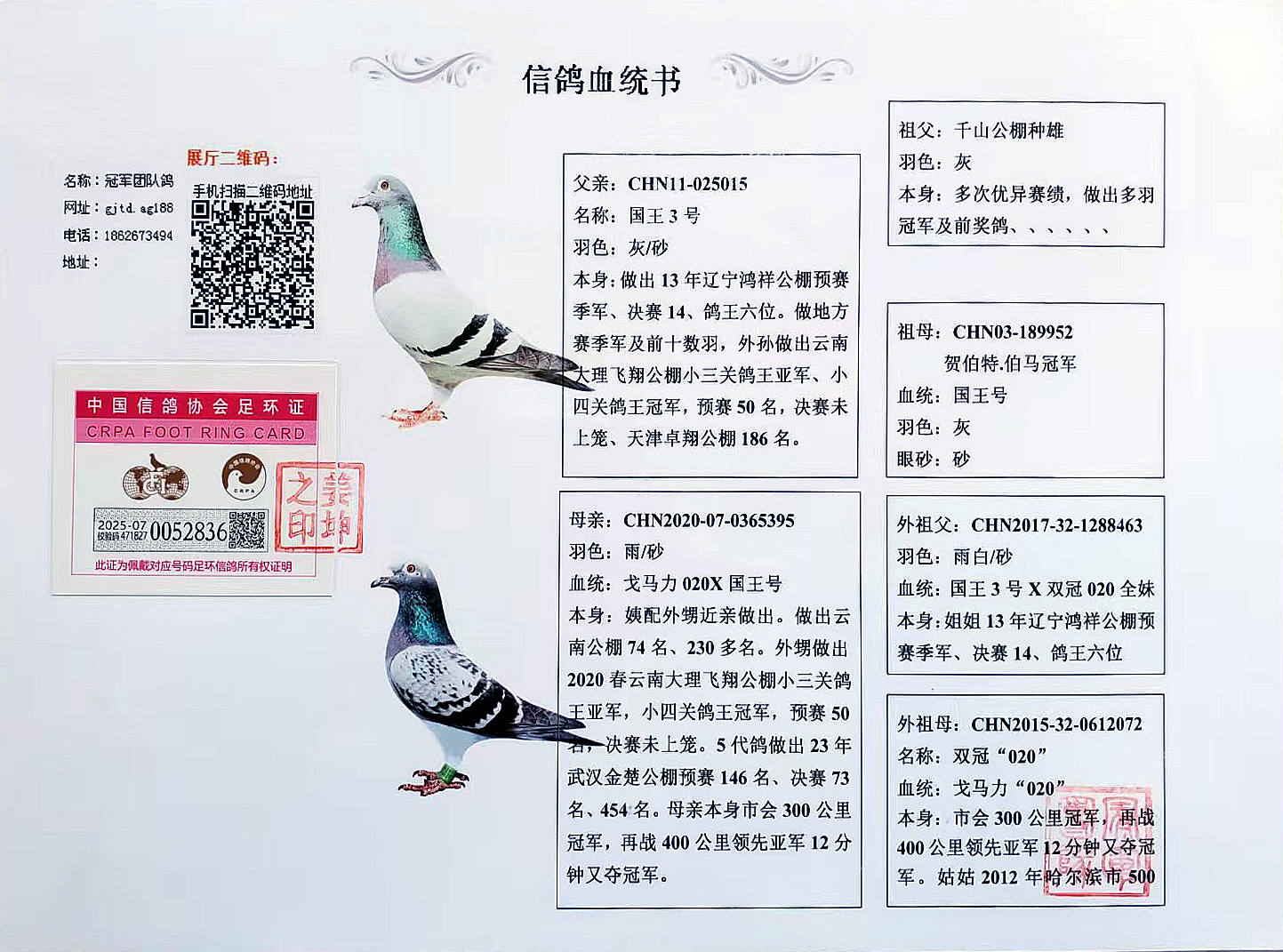 血統(tǒng)書足環(huán)卡隨鴿發(fā)出,低價(jià)位高品質(zhì)幼鴿,種賽皆宜。良心做人,所有成績(jī)血統(tǒng)假一賠百,不做虛假宣傳!當(dāng)曖贅氪菩塾啥嗄昃楹屯雅卸轄齬┎慰跡�