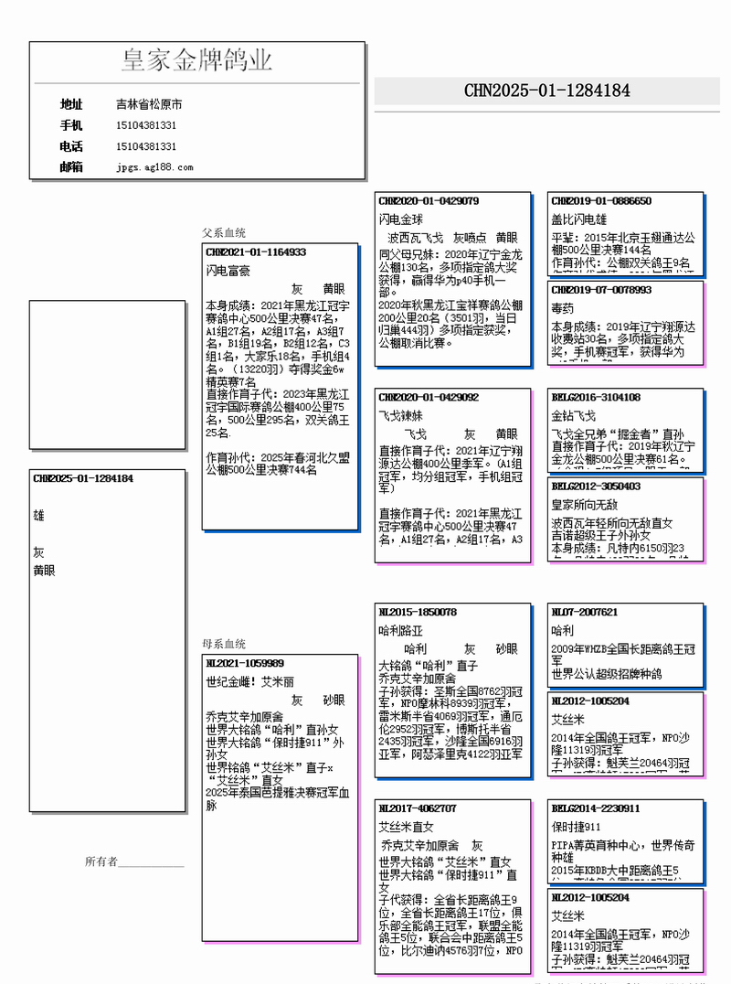 本身成績:2021年黑龍江冠宇賽鴿中心500公里決賽47名,A1組27名,A2組17名,A3組7名,B1組19名,B2組12名,C3組1名,大家樂18名,手機(jī)組4名。(13220羽)奪得獎金6w