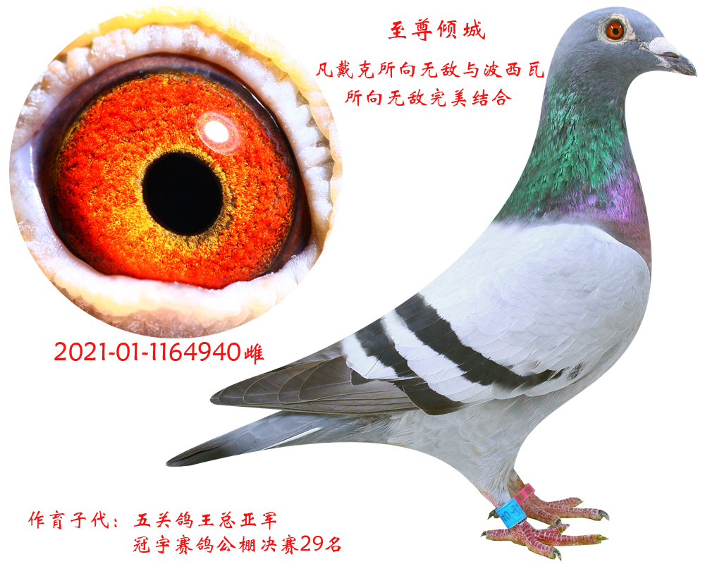 父親為凡戴克所向無敵家族高代種鴿,(年輕所向無敵x小女王)直子,母親為波西瓦年輕所向無敵高代種鴿,兩羽優(yōu)秀家族,作育出超級種鴿。