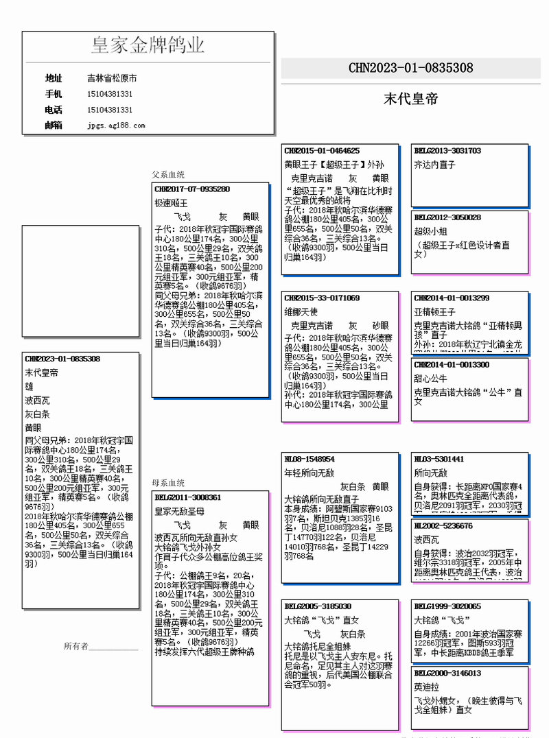 作育子代眾多公棚高位鴿王獎項(xiàng)。