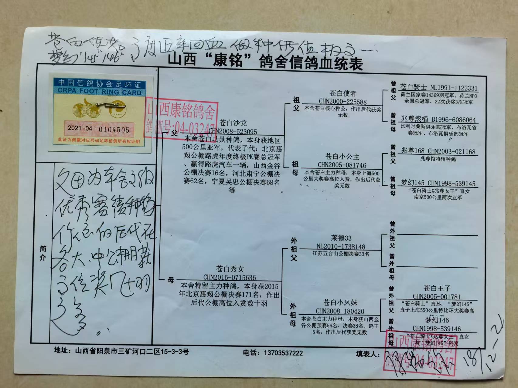 山西康銘鴿舍:惠翔路虎PK賽總冠軍半平輩505