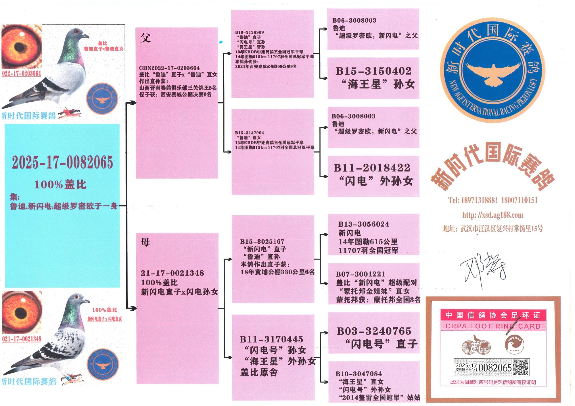 冠軍鴿父親“魯?shù)稀笔情W電號直子,本身也是實力不凡的成績鴿,而且其另外一羽直子“超級羅密歐”已經(jīng)獲2013年KBDB中距離一歲鴿鴿王冠軍,顯示“魯?shù)稀睂嵙Σ贿d父親“閃電號”!冠軍鴿母親是“閃電號”外孫女。