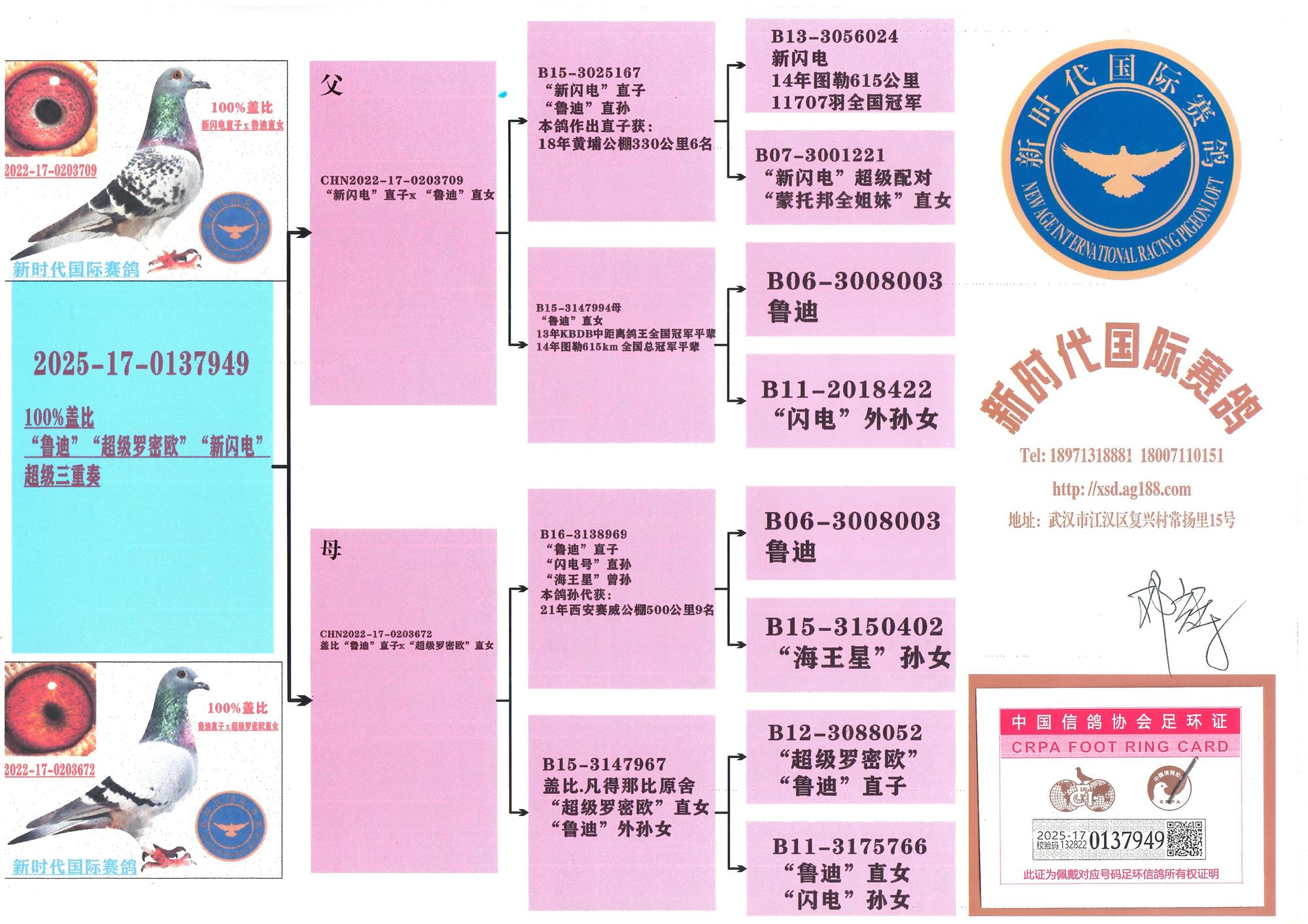 冠軍鴿父親“魯?shù)稀笔情W電號直子,本身也是實力不凡的成績鴿,而且其另外一羽直子“超級羅密歐”已經(jīng)獲2013年KBDB中距離一歲鴿鴿王冠軍,顯示“魯?shù)稀睂嵙Σ贿d父親“閃電號”!冠軍鴿母親是“閃電號”外孫女。