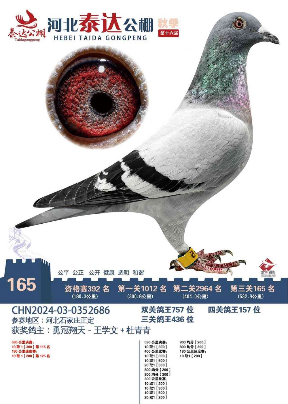 河北泰達賽鴿公棚第二關(guān)400公里2964名;參與指定:1600元;