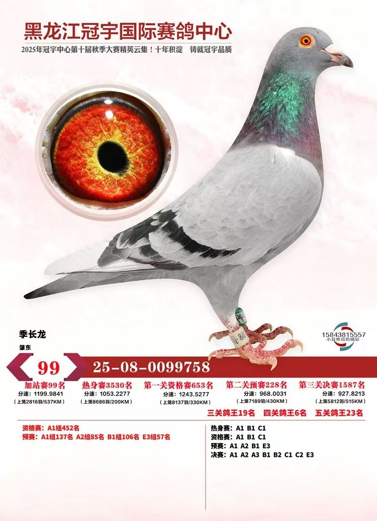 黑龍江冠宇國(guó)際賽鴿中心537公里加站賽99名;
