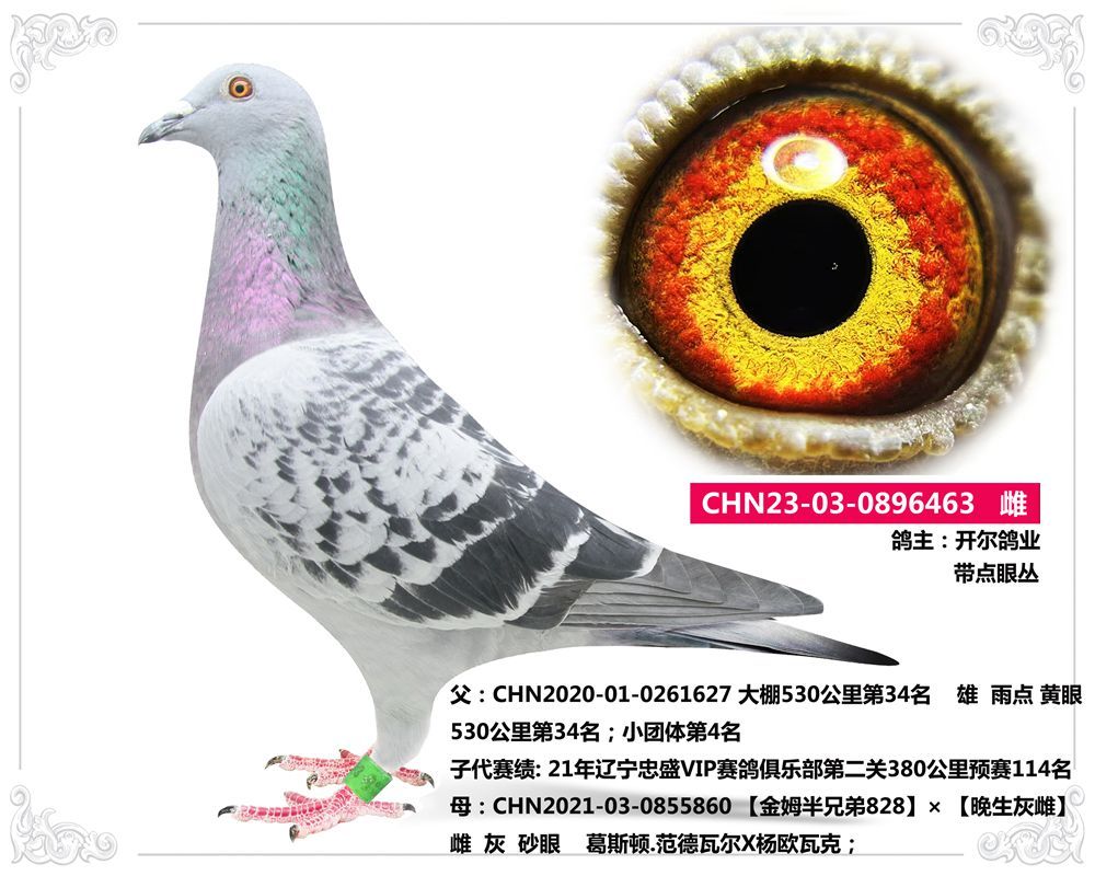 父:CHN2020-01-0261627 大棚530公里第34名 雄 雨點 黃眼 開爾愛心公棚大棚200公里第9408名;320公里第5313名;430公里第1860名;530公里第34名;小團體第4名 子代賽績: 21年遼寧忠盛VIP賽鴿俱樂部第二關(guān)380公里預(yù)賽114名