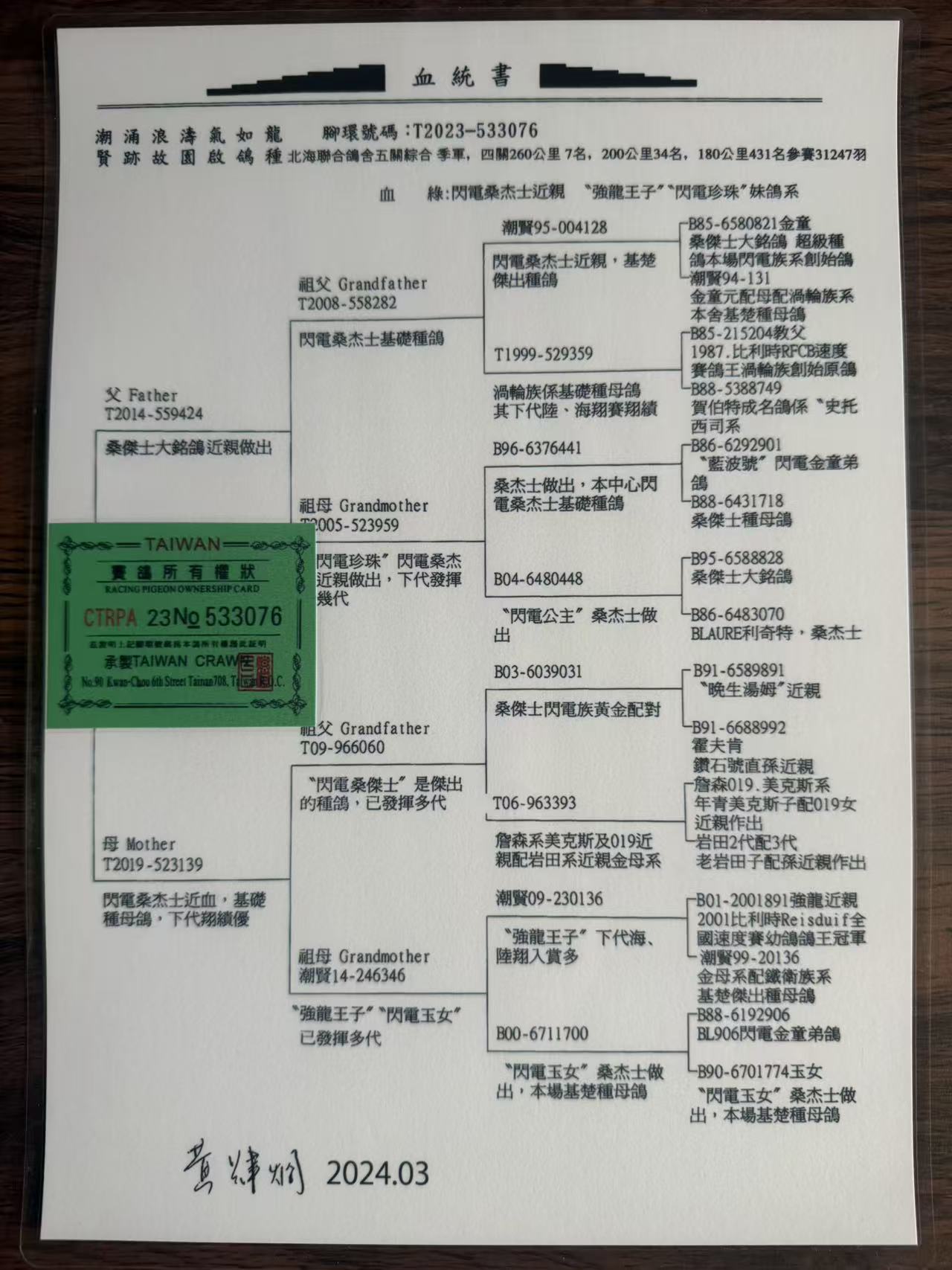 1604386 臺灣飛事速競翔研究中心 ”詹森“血系 ¥0元 0次