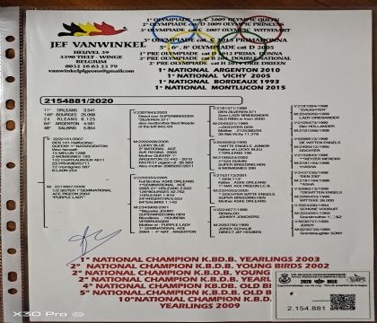 晟捷國際鴿業(yè):鴿主養(yǎng)鴿30余載,引進世界銘鴿,公棚鴿王,地方賽鴿王,前名次鴿多羽。鴿舍主血:利奧賀爾曼斯,楊胡曼斯哈利,奶酪,胡本,克拉克,詹森紅狐,麥克斯,51次,019,桑杰士,馬克羅森斯,戈馬力,速霸龍,東方不敗,喬斯佛卡門,小迪迪,,甘納斯,芬妮卡5000 晟捷國際鴿業(yè):代表成績:2009年獲得惠翔3名,團體冠軍, 2006年大鵝島公棚預賽21名,決賽84名。 2007年盛世公棚500公里決賽182名296名425名。 2008年盛世公棚500公里決賽61名,276名。 2009年獲得千山公棚決賽9名,鴿王10名.... 2011年獲得祺陽牧業(yè)決賽17名37名243名,團體5名。 2014年獲得丹東祺陽牧業(yè)決賽138名 2015年海逸國際公棚393名鴿王11名 2016年北戴河六藝國際公棚預賽26名,決賽51名。 藍湖欲鴿決賽73名,精英賽冠軍。 2017年大安信和公棚決賽233名300名414名。 北戴河六藝國際公棚預賽151名決賽145名 2018年春潮公棚決賽195名,376名 2019年綏中縱誠公棚500公里決賽59名 大慶臻翔公棚500公里決賽43名 海逸國際公棚四關鴿王13名 。