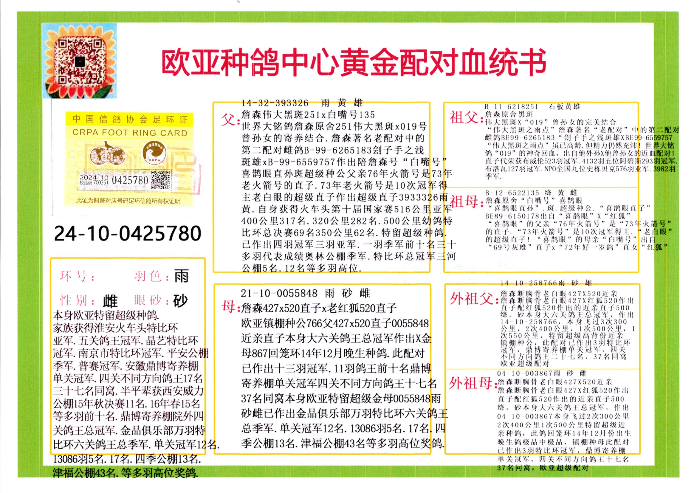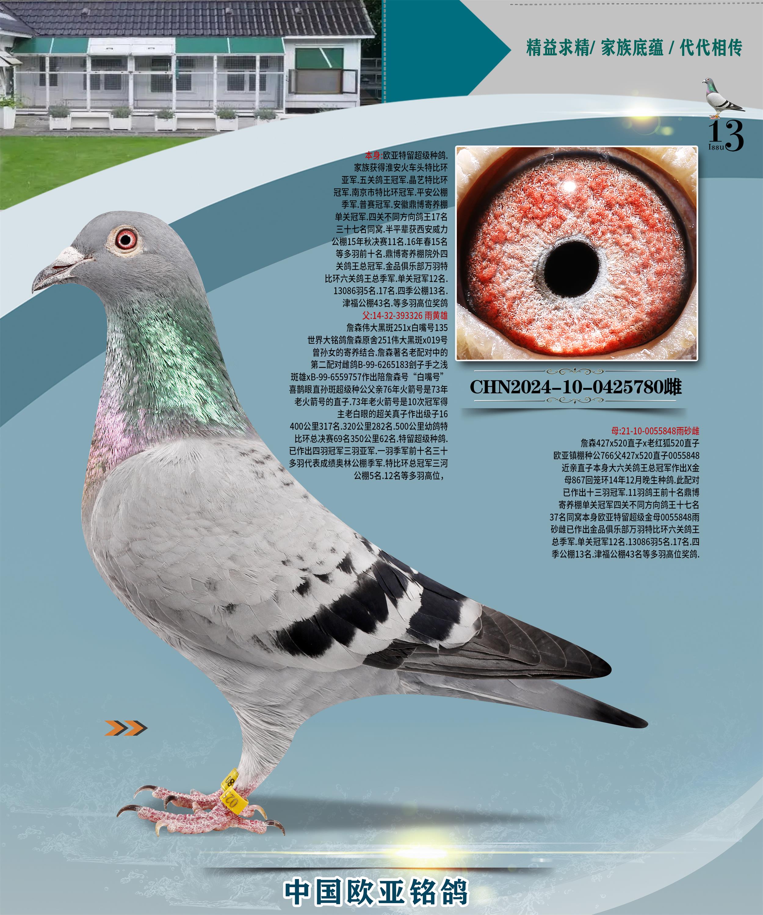 24年秋南京特比環(huán)歐亞榮獲大團(tuán)體冠軍.小團(tuán)體冠軍551公里大特比13名.14名.16名.19名.20名.21名.24名.26名.27名.28名.42名.52名.54名.57名.65名.66名.68名.70名.71名.72名.74名.76名.80名.82名.83名.84名.85名.86名.90名.92名.110名.116名.121名.122名.128名.131名.158名.161名.164名.165名.166名.172名.174名.177名.182名.195名.196名.201名.205名.208名.210名.216名.253名.269名.275名.276名.294名.296名.299名,,24年秋云南天南銅都公棚決賽415名.天南銅都小棚決賽409名.云南玉活公棚決賽102名.490名.團(tuán)體32名上籠二羽進(jìn)二羽,天南銅都大棚506公里決賽445名。熱烈祝賀河北省巨鹿縣李蘭生老師用歐亞泰山號(hào)血系連續(xù)十一年奪冠軍,河北省國(guó)家賽冠軍.全國(guó)季軍等多次前十名高位,揚(yáng)州王軍王總用歐亞利奧24年春季獲山東翔宇公棚決賽33名蓋比53名。南京劉正龍劉總用歐亞蓋比獲得24年秋山東濰坊國(guó)際公棚決賽42名.精英賽30名.三關(guān)鴿王71名.決賽86名.加站賽16名.南京市特比環(huán)A組鴿王9名.B組鴿王5名.6名.C組鴿王5名.精英賽冠軍4名.技能賽A組冠軍4名.5名.秦淮區(qū)特比環(huán)榮獲15名.46名.48名.87名。四川西昌徐亮徐總用歐亞利奧獲得涼山州聚友決賽177名.第二關(guān)亞軍雙關(guān)鴿王19名.三關(guān)鴿王105名.云南豪庭公棚決賽603名。熱烈祝賀24年四川重慶翔園鴿舍用歐亞泰山號(hào)榮獲春季400公里冠軍.秋季500公里冠軍,河北王總用詹森X利奧獲得千羽千翔公棚400公里冠軍,廣東蔡楷煥榮獲24年秋愛(ài)好者 賽鴿俱樂(lè)部三關(guān)鴿王季軍.一關(guān)420公里99名.二關(guān)450公里11名.三關(guān)520公里32名.單關(guān)季軍.7名.12名,江西李衛(wèi)興榮獲貴州紅楓公棚8名.共翔俱樂(lè)部寄養(yǎng)棚四關(guān)綜合鴿王30名.一關(guān)400公里78名.二關(guān)500公里55名.三關(guān)520公里37名.四關(guān)500公里57名.同父母獲公棚18名.雷鳴獲得武漢黃浦育翔中心冠軍,四川陳文獲得四川明鴻俱樂(lè)部300公里夢(mèng)幻2名.3名.4名.9名.10名.13名.14名.15名.31名.34名.40名.41名.42名.43名.69名.71名.72名.73名.74名.94名.95名.97名.98名.99名.419公里決賽榮獲總冠軍7名.總共歸巢9羽,四川徐亮獲豪庭決賽603名,山西鄭勇獲得山西泰鑫公棚決賽255名詹森紅狐,熱烈祝賀馬總獲得開(kāi)爾(飛躍隊(duì))決賽9名獲獎(jiǎng)金1310000萬(wàn)元.第一關(guān)52名,天津津福資賽180公里96名.獲獎(jiǎng)金429543萬(wàn)元,歐亞支持全國(guó)鴿友24年秋多人報(bào)喜 祝大家取得更好成績(jī),給歐亞報(bào)喜鴿友歐亞決定給每人贈(zèng)送一羽超級(jí)種鴿。歐亞俱樂(lè)部特比環(huán)多關(guān)鴿王成績(jī):15年秋淮安特比環(huán)黑色星期一全會(huì)上籠9700多羽,當(dāng)天無(wú)鴿歸巢,第二天全會(huì)歸巢357羽,本舍歸巢158羽.前十名八羽.前一百名歸巢57羽,16年春季獲五關(guān)鴿王總冠軍,總亞軍四名.六名.七名.九名.十名.晶藝俱樂(lè)部520公里冠亞季軍5名.6名.7名.9名.11名等,火車頭冠軍.季軍6名.8名.9名.10名,16年秋晶藝俱樂(lè)部特比環(huán)520公里亞軍.季軍4名.6名.7名.9名,15年春南京白下特比環(huán)冠軍.亞軍.季軍6名.7名.8名.9名.10名.指定鴿A B組獲得冠軍.亞軍.季軍4名.5名.,17年淮安特比環(huán)亞軍.4名.5名.7名.8名.10名.六關(guān)鴿王總冠軍.4名.6名.9名.10名,寄養(yǎng)棚宿遷劉總20羽特比環(huán)獲冠軍.季軍.4名.7名.8名.9名等。18年榮獲萬(wàn)羽特比環(huán)六關(guān)鴿王總冠軍.總亞軍.總季軍.6名.8名.十名.單關(guān)四羽冠軍.二羽亞軍.四羽季軍.前十名27羽。19年秋萬(wàn)羽特比環(huán)六關(guān)鴿王總亞軍.總季軍.5名.8名等,單關(guān)二羽冠軍.三羽亞軍.一羽季軍前十名31羽。20年秋淮安市鴿會(huì)四關(guān)特比環(huán)大賽風(fēng)雨無(wú)阻鴿王亞軍.鴿王六名,金品俱樂(lè)部萬(wàn)羽特比環(huán)六關(guān)鴿王總冠軍,總亞軍.四名.五名.六名.七名.八名.十名.前二百名鴿王35羽,單關(guān)冠亞季軍前十名四十多羽,火車頭五關(guān)鴿王季軍.六名.八名.前二百名鴿王十七羽。20年春榮獲淮安五區(qū)一市四關(guān)鴿王總冠軍.亞軍.四名.八名.九名。21年秋榮獲金品萬(wàn)羽特比環(huán)大賽六關(guān)鴿王總亞軍.總季軍.四名.七名.九名.十名.單關(guān)冠亞軍季軍前十名三十多羽;疖囶^協(xié)會(huì)鴿王六名.七名.十名.單關(guān)前十名十七羽。22年秋榮獲鴿王總冠軍.總亞軍.5名.7名.8名.9名.11名.單關(guān)冠亞季軍前十名三十多羽,第一關(guān)單關(guān)前二百名四十多羽,第二關(guān)前二百名三十多羽,第三關(guān)前二百名四十多羽,第四關(guān)前二百名四十多羽,第五關(guān)前一百名53羽。23年秋榮獲鴿王季軍.五名.八名.十名.13名.17名.20名.27名等多羽鴿王.單關(guān)前十名二十多羽。公棚.寄養(yǎng)棚部分成績(jī):16年秋寧夏黃河公棚總冠軍電腦戈馬力指定通炮冠軍,17年送八羽參賽獲得鴿王八名進(jìn)獎(jiǎng)四名,支持韓總榮獲八名。支持鴿友榮獲寧夏中衛(wèi)公棚決賽總冠軍.精英賽冠軍,支持18年寧夏黃河公棚決賽冠軍詹森X泰山。安徽鼎博寄養(yǎng)棚院內(nèi)外四關(guān)鴿王總冠軍.鴿王十七名.三十七名同窩,鴿王39名.42名.58名.67名。18年山東公棚預(yù)賽冠軍.決賽65名.送八羽進(jìn)獎(jiǎng)五羽.指定獲奔馳汽車一輛。支持鴿友獲得云南藍(lán)云公棚冠軍.蓋比X佛卡門。支持鴿友榮獲云南銀集公棚