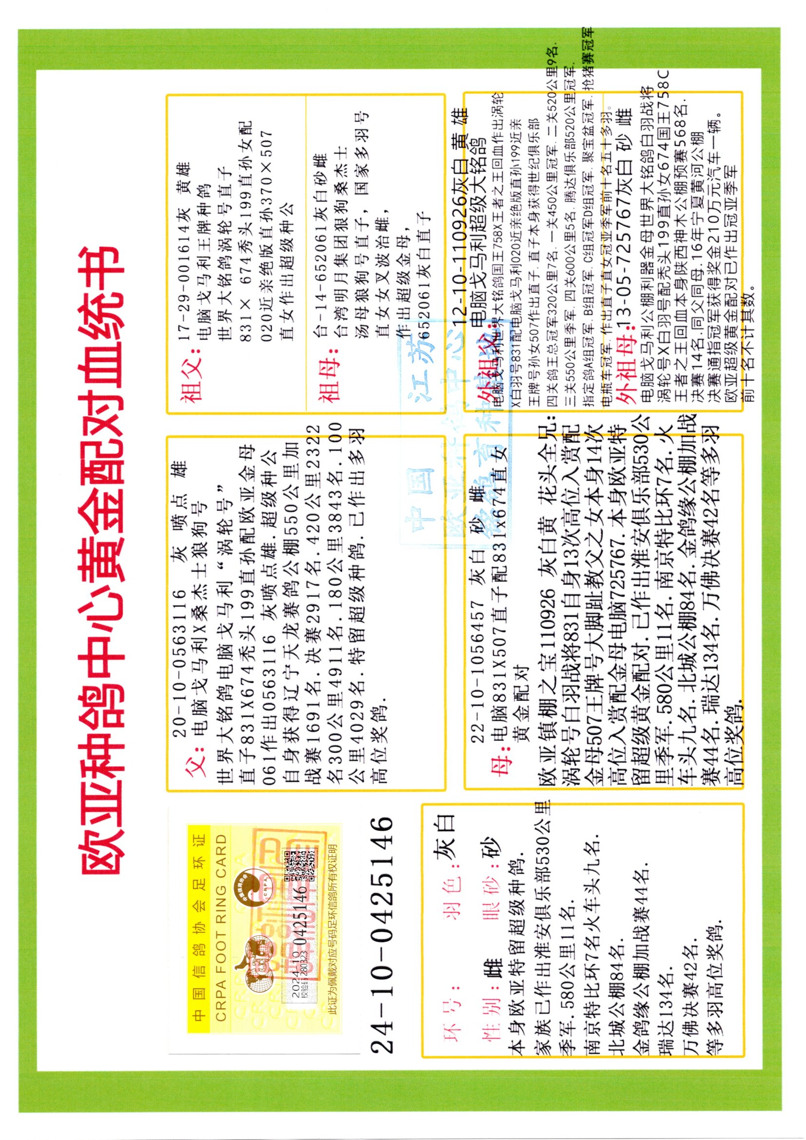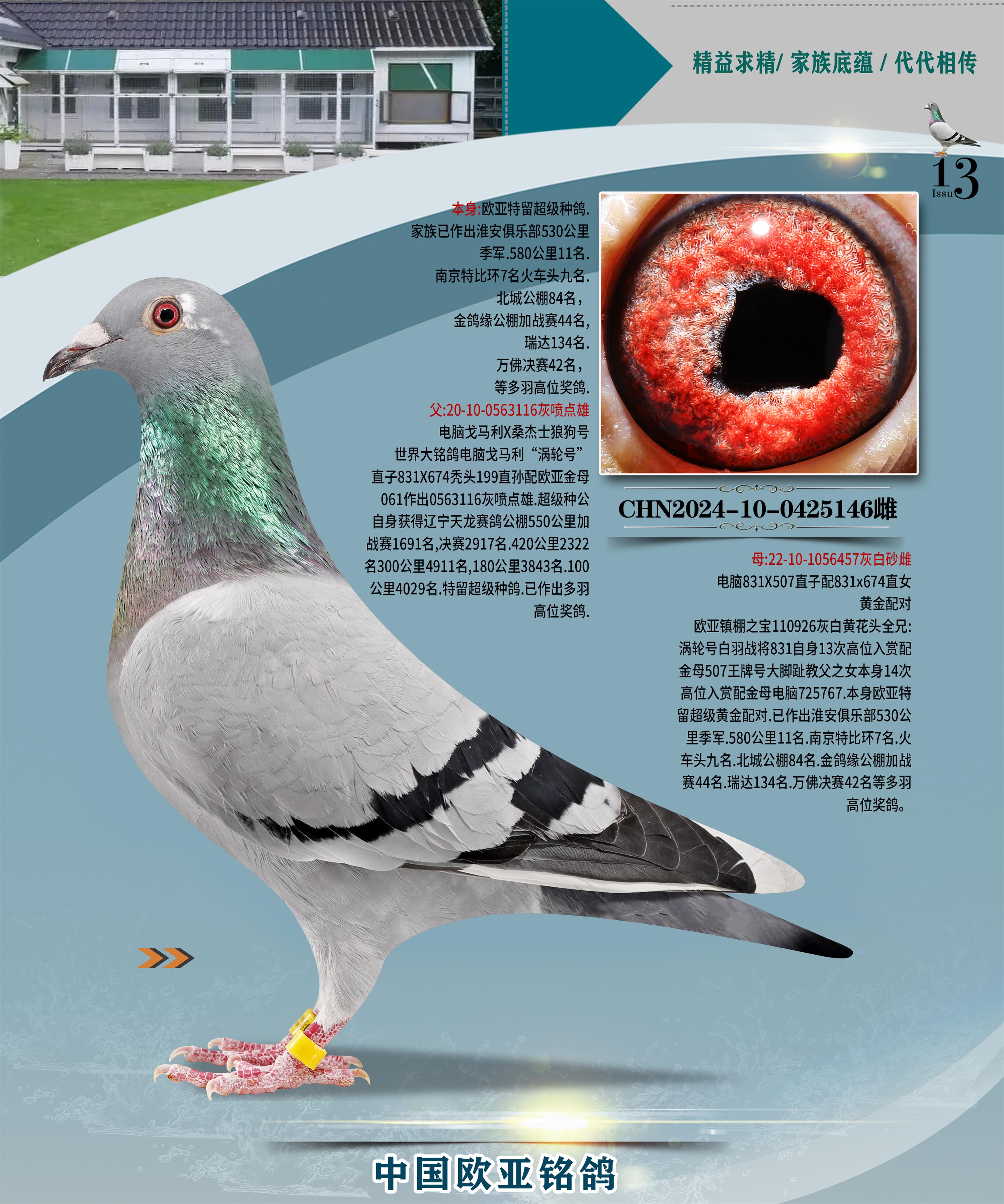24年秋南京特比環(huán)歐亞榮獲大團(tuán)體冠軍.小團(tuán)體冠軍551公里大特比13名.14名.16名.19名.20名.21名.24名.26名.27名.28名.42名.52名.54名.57名.65名.66名.68名.70名.71名.72名.74名.76名.80名.82名.83名.84名.85名.86名.90名.92名.110名.116名.121名.122名.128名.131名.158名.161名.164名.165名.166名.172名.174名.177名.182名.195名.196名.201名.205名.208名.210名.216名.253名.269名.275名.276名.294名.296名.299名,,24年秋云南天南銅都公棚決賽415名.天南銅都小棚決賽409名.云南玉活公棚決賽102名.490名.團(tuán)體32名上籠二羽進(jìn)二羽,天南銅都大棚506公里決賽445名。熱烈祝賀河北省巨鹿縣李蘭生老師用歐亞泰山號(hào)血系連續(xù)十一年奪冠軍,河北省國(guó)家賽冠軍.全國(guó)季軍等多次前十名高位,揚(yáng)州王軍王總用歐亞利奧24年春季獲山東翔宇公棚決賽33名蓋比53名。南京劉正龍劉總用歐亞蓋比獲得24年秋山東濰坊國(guó)際公棚決賽42名.精英賽30名.三關(guān)鴿王71名.決賽86名.加站賽16名.南京市特比環(huán)A組鴿王9名.B組鴿王5名.6名.C組鴿王5名.精英賽冠軍4名.技能賽A組冠軍4名.5名.秦淮區(qū)特比環(huán)榮獲15名.46名.48名.87名。四川西昌徐亮徐總用歐亞利奧獲得涼山州聚友決賽177名.第二關(guān)亞軍雙關(guān)鴿王19名.三關(guān)鴿王105名.云南豪庭公棚決賽603名。熱烈祝賀24年四川重慶翔園鴿舍用歐亞泰山號(hào)榮獲春季400公里冠軍.秋季500公里冠軍,河北王總用詹森X利奧獲得千羽千翔公棚400公里冠軍,廣東蔡楷煥榮獲24年秋愛(ài)好者 賽鴿俱樂(lè)部三關(guān)鴿王季軍.一關(guān)420公里99名.二關(guān)450公里11名.三關(guān)520公里32名.單關(guān)季軍.7名.12名,江西李衛(wèi)興榮獲貴州紅楓公棚8名.共翔俱樂(lè)部寄養(yǎng)棚四關(guān)綜合鴿王30名.一關(guān)400公里78名.二關(guān)500公里55名.三關(guān)520公里37名.四關(guān)500公里57名.同父母獲公棚18名.雷鳴獲得武漢黃浦育翔中心冠軍,四川陳文獲得四川明鴻俱樂(lè)部300公里夢(mèng)幻2名.3名.4名.9名.10名.13名.14名.15名.31名.34名.40名.41名.42名.43名.69名.71名.72名.73名.74名.94名.95名.97名.98名.99名.419公里決賽榮獲總冠軍7名.總共歸巢9羽,四川徐亮獲豪庭決賽603名,山西鄭勇獲得山西泰鑫公棚決賽255名詹森紅狐,熱烈祝賀馬總獲得開(kāi)爾(飛躍隊(duì))決賽9名獲獎(jiǎng)金1310000萬(wàn)元.第一關(guān)52名,天津津福資賽180公里96名.獲獎(jiǎng)金429543萬(wàn)元,歐亞支持全國(guó)鴿友24年秋多人報(bào)喜 祝大家取得更好成績(jī),給歐亞報(bào)喜鴿友歐亞決定給每人贈(zèng)送一羽超級(jí)種鴿。歐亞俱樂(lè)部特比環(huán)多關(guān)鴿王成績(jī):15年秋淮安特比環(huán)黑色星期一全會(huì)上籠9700多羽,當(dāng)天無(wú)鴿歸巢,第二天全會(huì)歸巢357羽,本舍歸巢158羽.前十名八羽.前一百名歸巢57羽,16年春季獲五關(guān)鴿王總冠軍,總亞軍四名.六名.七名.九名.十名.晶藝俱樂(lè)部520公里冠亞季軍5名.6名.7名.9名.11名等,火車頭冠軍.季軍6名.8名.9名.10名,16年秋晶藝俱樂(lè)部特比環(huán)520公里亞軍.季軍4名.6名.7名.9名,15年春南京白下特比環(huán)冠軍.亞軍.季軍6名.7名.8名.9名.10名.指定鴿A B組獲得冠軍.亞軍.季軍4名.5名.,17年淮安特比環(huán)亞軍.4名.5名.7名.8名.10名.六關(guān)鴿王總冠軍.4名.6名.9名.10名,寄養(yǎng)棚宿遷劉總20羽特比環(huán)獲冠軍.季軍.4名.7名.8名.9名等。18年榮獲萬(wàn)羽特比環(huán)六關(guān)鴿王總冠軍.總亞軍.總季軍.6名.8名.十名.單關(guān)四羽冠軍.二羽亞軍.四羽季軍.前十名27羽。19年秋萬(wàn)羽特比環(huán)六關(guān)鴿王總亞軍.總季軍.5名.8名等,單關(guān)二羽冠軍.三羽亞軍.一羽季軍前十名31羽。20年秋淮安市鴿會(huì)四關(guān)特比環(huán)大賽風(fēng)雨無(wú)阻鴿王亞軍.鴿王六名,金品俱樂(lè)部萬(wàn)羽特比環(huán)六關(guān)鴿王總冠軍,總亞軍.四名.五名.六名.七名.八名.十名.前二百名鴿王35羽,單關(guān)冠亞季軍前十名四十多羽,火車頭五關(guān)鴿王季軍.六名.八名.前二百名鴿王十七羽。20年春榮獲淮安五區(qū)一市四關(guān)鴿王總冠軍.亞軍.四名.八名.九名。21年秋榮獲金品萬(wàn)羽特比環(huán)大賽六關(guān)鴿王總亞軍.總季軍.四名.七名.九名.十名.單關(guān)冠亞軍季軍前十名三十多羽;疖囶^協(xié)會(huì)鴿王六名.七名.十名.單關(guān)前十名十七羽。22年秋榮獲鴿王總冠軍.總亞軍.5名.7名.8名.9名.11名.單關(guān)冠亞季軍前十名三十多羽,第一關(guān)單關(guān)前二百名四十多羽,第二關(guān)前二百名三十多羽,第三關(guān)前二百名四十多羽,第四關(guān)前二百名四十多羽,第五關(guān)前一百名53羽。23年秋榮獲鴿王季軍.五名.八名.十名.13名.17名.20名.27名等多羽鴿王.單關(guān)前十名二十多羽。公棚.寄養(yǎng)棚部分成績(jī):16年秋寧夏黃河公棚總冠軍電腦戈馬力指定通炮冠軍,17年送八羽參賽獲得鴿王八名進(jìn)獎(jiǎng)四名,支持韓總榮獲八名。支持鴿友榮獲寧夏中衛(wèi)公棚決賽總冠軍.精英賽冠軍,支持18年寧夏黃河公棚決賽冠軍詹森X泰山。安徽鼎博寄養(yǎng)棚院內(nèi)外四關(guān)鴿王總冠軍.鴿王十七名.三十七名同窩,鴿王39名.42名.58名.67名。18年山東公棚預(yù)賽冠軍.決賽65名.送八羽進(jìn)獎(jiǎng)五羽.指定獲奔馳汽車一輛。支持鴿友獲得云南藍(lán)云公棚冠軍.蓋比X佛卡門。支持鴿友榮獲云南銀集公棚