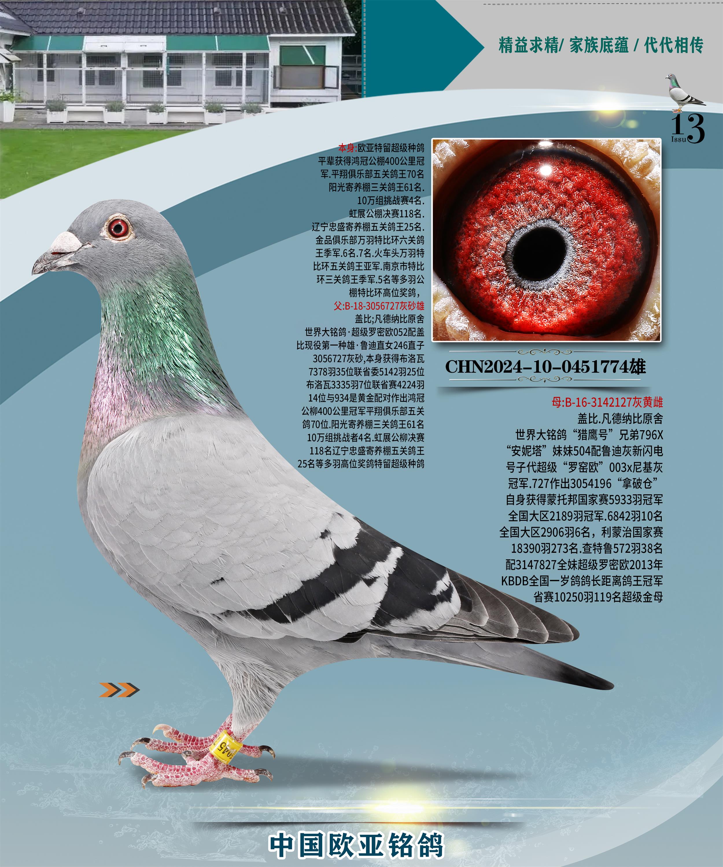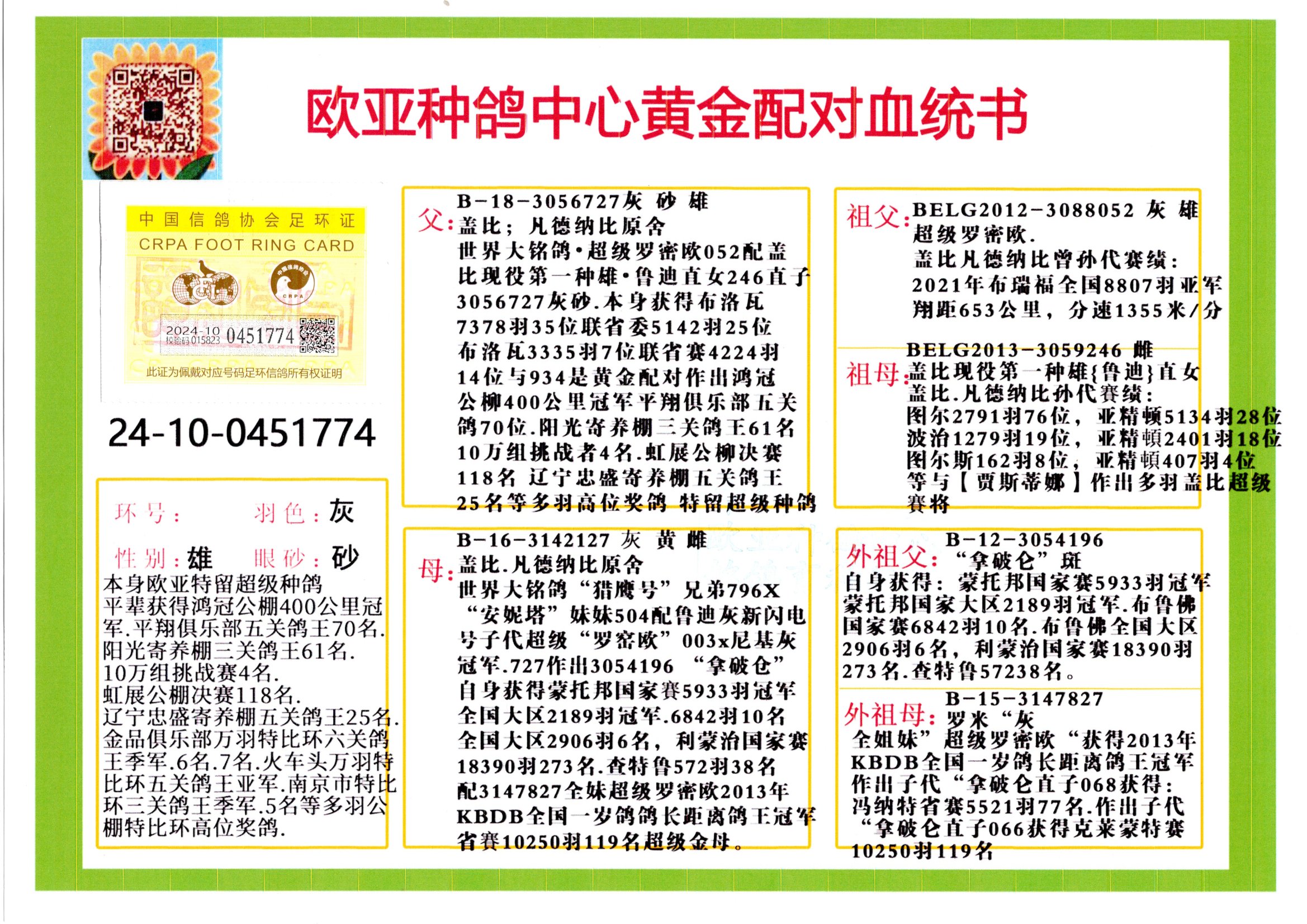 24年秋南京特比環(huán)歐亞榮獲大團體冠軍.小團體冠軍551公里大特比13名.14名.16名.19名.20名.21名.24名.26名.27名.28名.42名.52名.54名.57名.65名.66名.68名.70名.71名.72名.74名.76名.80名.82名.83名.84名.85名.86名.90名.92名.110名.116名.121名.122名.128名.131名.158名.161名.164名.165名.166名.172名.174名.177名.182名.195名.196名.201名.205名.208名.210名.216名.253名.269名.275名.276名.294名.296名.299名,,24年秋云南天南銅都公棚決賽415名.天南銅都小棚決賽409名.云南玉活公棚決賽102名.490名.團體32名上籠二羽進二羽,天南銅都大棚506公里決賽445名。熱烈祝賀河北省巨鹿縣李蘭生老師用歐亞泰山號血系連續(xù)十一年奪冠軍,河北省國家賽冠軍.全國季軍等多次前十名高位,揚州王軍王總用歐亞利奧24年春季獲山東翔宇公棚決賽33名蓋比53名。南京劉正龍劉總用歐亞蓋比獲得24年秋山東濰坊國際公棚決賽42名.精英賽30名.三關(guān)鴿王71名.決賽86名.加站賽16名.南京市特比環(huán)A組鴿王9名.B組鴿王5名.6名.C組鴿王5名.精英賽冠軍4名.技能賽A組冠軍4名.5名.秦淮區(qū)特比環(huán)榮獲15名.46名.48名.87名。四川西昌徐亮徐總用歐亞利奧獲得涼山州聚友決賽177名.第二關(guān)亞軍雙關(guān)鴿王19名.三關(guān)鴿王105名.云南豪庭公棚決賽603名。熱烈祝賀24年四川重慶翔園鴿舍用歐亞泰山號榮獲春季400公里冠軍.秋季500公里冠軍,河北王總用詹森X利奧獲得千羽千翔公棚400公里冠軍,廣東蔡楷煥榮獲24年秋愛好者 賽鴿俱樂部三關(guān)鴿王季軍.一關(guān)420公里99名.二關(guān)450公里11名.三關(guān)520公里32名.單關(guān)季軍.7名.12名,江西李衛(wèi)興榮獲貴州紅楓公棚8名.共翔俱樂部寄養(yǎng)棚四關(guān)綜合鴿王30名.一關(guān)400公里78名.二關(guān)500公里55名.三關(guān)520公里37名.四關(guān)500公里57名.同父母獲公棚18名.雷鳴獲得武漢黃浦育翔中心冠軍,四川陳文獲得四川明鴻俱樂部300公里夢幻2名.3名.4名.9名.10名.13名.14名.15名.31名.34名.40名.41名.42名.43名.69名.71名.72名.73名.74名.94名.95名.97名.98名.99名.419公里決賽榮獲總冠軍7名.總共歸巢9羽,四川徐亮獲豪庭決賽603名,山西鄭勇獲得山西泰鑫公棚決賽255名詹森紅狐,熱烈祝賀馬總獲得開爾(飛躍隊)決賽9名獲獎金1310000萬元.第一關(guān)52名,天津津福資賽180公里96名.獲獎金429543萬元,歐亞支持全國鴿友24年秋多人報喜 祝大家取得更好成績,給歐亞報喜鴿友歐亞決定給每人贈送一羽超級種鴿。歐亞俱樂部特比環(huán)多關(guān)鴿王成績:15年秋淮安特比環(huán)黑色星期一全會上籠9700多羽,當(dāng)天無鴿歸巢,第二天全會歸巢357羽,本舍歸巢158羽.前十名八羽.前一百名歸巢57羽,16年春季獲五關(guān)鴿王總冠軍,總亞軍四名.六名.七名.九名.十名.晶藝俱樂部520公里冠亞季軍5名.6名.7名.9名.11名等,火車頭冠軍.季軍6名.8名.9名.10名,16年秋晶藝俱樂部特比環(huán)520公里亞軍.季軍4名.6名.7名.9名,15年春南京白下特比環(huán)冠軍.亞軍.季軍6名.7名.8名.9名.10名.指定鴿A B組獲得冠軍.亞軍.季軍4名.5名.,17年淮安特比環(huán)亞軍.4名.5名.7名.8名.10名.六關(guān)鴿王總冠軍.4名.6名.9名.10名,寄養(yǎng)棚宿遷劉總20羽特比環(huán)獲冠軍.季軍.4名.7名.8名.9名等。18年榮獲萬羽特比環(huán)六關(guān)鴿王總冠軍.總亞軍.總季軍.6名.8名.十名.單關(guān)四羽冠軍.二羽亞軍.四羽季軍.前十名27羽。19年秋萬羽特比環(huán)六關(guān)鴿王總亞軍.總季軍.5名.8名等,單關(guān)二羽冠軍.三羽亞軍.一羽季軍前十名31羽。20年秋淮安市鴿會四關(guān)特比環(huán)大賽風(fēng)雨無阻鴿王亞軍.鴿王六名,金品俱樂部萬羽特比環(huán)六關(guān)鴿王總冠軍,總亞軍.四名.五名.六名.七名.八名.十名.前二百名鴿王35羽,單關(guān)冠亞季軍前十名四十多羽,火車頭五關(guān)鴿王季軍.六名.八名.前二百名鴿王十七羽。20年春榮獲淮安五區(qū)一市四關(guān)鴿王總冠軍.亞軍.四名.八名.九名。21年秋榮獲金品萬羽特比環(huán)大賽六關(guān)鴿王總亞軍.總季軍.四名.七名.九名.十名.單關(guān)冠亞軍季軍前十名三十多羽;疖囶^協(xié)會鴿王六名.七名.十名.單關(guān)前十名十七羽。22年秋榮獲鴿王總冠軍.總亞軍.5名.7名.8名.9名.11名.單關(guān)冠亞季軍前十名三十多羽,第一關(guān)單關(guān)前二百名四十多羽,第二關(guān)前二百名三十多羽,第三關(guān)前二百名四十多羽,第四關(guān)前二百名四十多羽,第五關(guān)前一百名53羽。23年秋榮獲鴿王季軍.五名.八名.十名.13名.17名.20名.27名等多羽鴿王.單關(guān)前十名二十多羽。公棚.寄養(yǎng)棚部分成績:16年秋寧夏黃河公棚總冠軍電腦戈馬力指定通炮冠軍,17年送八羽參賽獲得鴿王八名進獎四名,支持韓總榮獲八名。支持鴿友榮獲寧夏中衛(wèi)公棚決賽總冠軍.精英賽冠軍,支持18年寧夏黃河公棚決賽冠軍詹森X泰山。安徽鼎博寄養(yǎng)棚院內(nèi)外四關(guān)鴿王總冠軍.鴿王十七名.三十七名同窩,鴿王39名.42名.58名.67名。18年山東公棚預(yù)賽冠軍.決賽65名.送八羽進獎五羽.指定獲奔馳汽車一輛。支持鴿友獲得云南藍云公棚冠軍.蓋比X佛卡門。支持鴿友榮獲云南銀集公棚決賽冠軍 詹森427X520血系 速度賽6700羽冠軍。17年榮獲金馬俱樂部寄養(yǎng)棚四關(guān)鴿王總冠軍.季軍.六名.八名.第一關(guān)冠軍.亞軍.季軍四名.七名.十一名.金牌教練獎。支持鴿友18年北京費翔公棚預(yù)賽九名電腦X