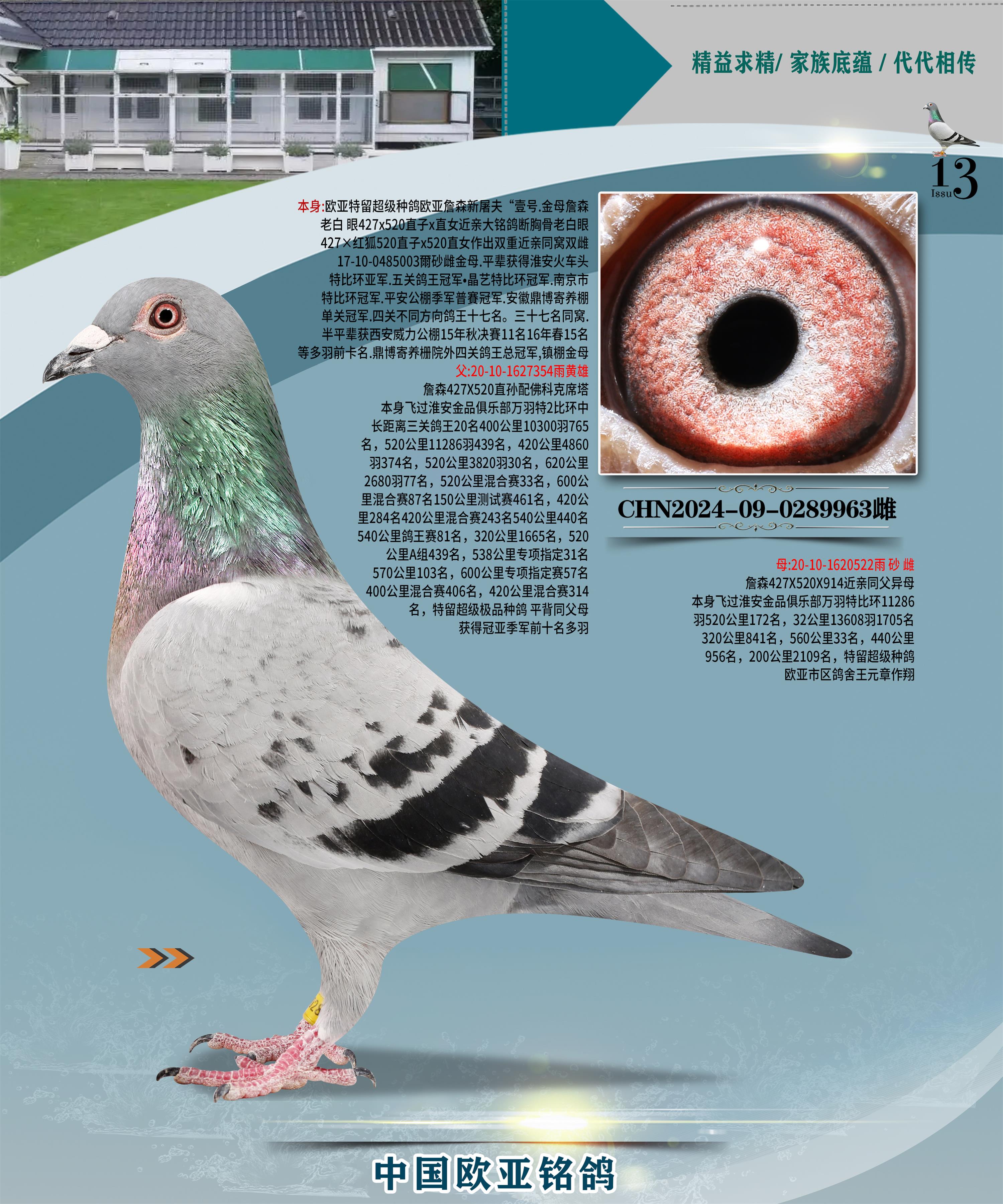 24年秋南京特比環(huán)歐亞榮獲大團體冠軍.小團體冠軍551公里大特比13名.14名.16名.19名.20名.21名.24名.26名.27名.28名.42名.52名.54名.57名.65名.66名.68名.70名.71名.72名.74名.76名.80名.82名.83名.84名.85名.86名.90名.92名.110名.116名.121名.122名.128名.131名.158名.161名.164名.165名.166名.172名.174名.177名.182名.195名.196名.201名.205名.208名.210名.216名.253名.269名.275名.276名.294名.296名.299名,,24年秋云南天南銅都公棚決賽415名.天南銅都小棚決賽409名.云南玉活公棚決賽102名.490名.團體32名上籠二羽進二羽,天南銅都大棚506公里決賽445名。熱烈祝賀河北省巨鹿縣李蘭生老師用歐亞泰山號血系連續(xù)十一年奪冠軍,河北省國家賽冠軍.全國季軍等多次前十名高位,揚州王軍王總用歐亞利奧24年春季獲山東翔宇公棚決賽33名蓋比53名。南京劉正龍劉總用歐亞蓋比獲得24年秋山東濰坊國際公棚決賽42名.精英賽30名.三關鴿王71名.決賽86名.加站賽16名.南京市特比環(huán)A組鴿王9名.B組鴿王5名.6名.C組鴿王5名.精英賽冠軍4名.技能賽A組冠軍4名.5名.秦淮區(qū)特比環(huán)榮獲15名.46名.48名.87名。四川西昌徐亮徐總用歐亞利奧獲得涼山州聚友決賽177名.第二關亞軍雙關鴿王19名.三關鴿王105名.云南豪庭公棚決賽603名。熱烈祝賀24年四川重慶翔園鴿舍用歐亞泰山號榮獲春季400公里冠軍.秋季500公里冠軍,河北王總用詹森X利奧獲得千羽千翔公棚400公里冠軍,廣東蔡楷煥榮獲24年秋愛好者 賽鴿俱樂部三關鴿王季軍.一關420公里99名.二關450公里11名.三關520公里32名.單關季軍.7名.12名,江西李衛(wèi)興榮獲貴州紅楓公棚8名.共翔俱樂部寄養(yǎng)棚四關綜合鴿王30名.一關400公里78名.二關500公里55名.三關520公里37名.四關500公里57名.同父母獲公棚18名.雷鳴獲得武漢黃浦育翔中心冠軍,四川陳文獲得四川明鴻俱樂部300公里夢幻2名.3名.4名.9名.10名.13名.14名.15名.31名.34名.40名.41名.42名.43名.69名.71名.72名.73名.74名.94名.95名.97名.98名.99名.419公里決賽榮獲總冠軍7名.總共歸巢9羽,四川徐亮獲豪庭決賽603名,山西鄭勇獲得山西泰鑫公棚決賽255名詹森紅狐,熱烈祝賀馬總獲得開爾(飛躍隊)決賽9名獲獎金1310000萬元.第一關52名,天津津福資賽180公里96名.獲獎金429543萬元,歐亞支持全國鴿友24年秋多人報喜 祝大家取得更好成績,給歐亞報喜鴿友歐亞決定給每人贈送一羽超級種鴿。歐亞俱樂部特比環(huán)多關鴿王成績:15年秋淮安特比環(huán)黑色星期一全會上籠9700多羽,當天無鴿歸巢,第二天全會歸巢357羽,本舍歸巢158羽.前十名八羽.前一百名歸巢57羽,16年春季獲五關鴿王總冠軍,總亞軍四名.六名.七名.九名.十名.晶藝俱樂部520公里冠亞季軍5名.6名.7名.9名.11名等,火車頭冠軍.季軍6名.8名.9名.10名,16年秋晶藝俱樂部特比環(huán)520公里亞軍.季軍4名.6名.7名.9名,15年春南京白下特比環(huán)冠軍.亞軍.季軍6名.7名.8名.9名.10名.指定鴿A B組獲得冠軍.亞軍.季軍4名.5名.,17年淮安特比環(huán)亞軍.4名.5名.7名.8名.10名.六關鴿王總冠軍.4名.6名.9名.10名,寄養(yǎng)棚宿遷劉總20羽特比環(huán)獲冠軍.季軍.4名.7名.8名.9名等。18年榮獲萬羽特比環(huán)六關鴿王總冠軍.總亞軍.總季軍.6名.8名.十名.單關四羽冠軍.二羽亞軍.四羽季軍.前十名27羽。19年秋萬羽特比環(huán)六關鴿王總亞軍.總季軍.5名.8名等,單關二羽冠軍.三羽亞軍.一羽季軍前十名31羽。20年秋淮安市鴿會四關特比環(huán)大賽風雨無阻鴿王亞軍.鴿王六名,金品俱樂部萬羽特比環(huán)六關鴿王總冠軍,總亞軍.四名.五名.六名.七名.八名.十名.前二百名鴿王35羽,單關冠亞季軍前十名四十多羽,火車頭五關鴿王季軍.六名.八名.前二百名鴿王十七羽。20年春榮獲淮安五區(qū)一市四關鴿王總冠軍.亞軍.四名.八名.九名。21年秋榮獲金品萬羽特比環(huán)大賽六關鴿王總亞軍.總季軍.四名.七名.九名.十名.單關冠亞軍季軍前十名三十多羽;疖囶^協(xié)會鴿王六名.七名.十名.單關前十名十七羽。22年秋榮獲鴿王總冠軍.總亞軍.5名.7名.8名.9名.11名.單關冠亞季軍前十名三十多羽,第一關單關前二百名四十多羽,第二關前二百名三十多羽,第三關前二百名四十多羽,第四關前二百名四十多羽,第五關前一百名53羽。23年秋榮獲鴿王季軍.五名.八名.十名.13名.17名.20名.27名等多羽鴿王.單關前十名二十多羽。公棚.寄養(yǎng)棚部分成績:16年秋寧夏黃河公棚總冠軍電腦戈馬力指定通炮冠軍,17年送八羽參賽獲得鴿王八名進獎四名,支持韓總榮獲八名。支持鴿友榮獲寧夏中衛(wèi)公棚決賽總冠軍.精英賽冠軍,支持18年寧夏黃河公棚決賽冠軍詹森X泰山。安徽鼎博寄養(yǎng)棚院內外四關鴿王總冠軍.鴿王十七名.三十七名同窩,鴿王39名.42名.58名.67名。18年山東公棚預賽冠軍.決賽65名.送八羽進獎五羽.指定獲奔馳汽車一輛。支持鴿友獲得云南藍云公棚冠軍.蓋比X佛卡門。支持鴿友榮獲云南銀集公棚決賽冠軍 詹森427X520血系 速度賽6700羽冠軍。17年榮獲金馬俱樂部寄養(yǎng)棚四關鴿王總冠軍.季軍.六名.八名.第一關冠軍.亞軍.季軍四名.七名.十一名.金牌教練獎。支持鴿友18年北京費翔公棚預賽九名電腦X桑杰士,支持鴿友榮獲陜西威力公棚決賽11名.內蒙古臨河寄養(yǎng)棚四關鴿王六名.詹森配泰山,支持河北王總用歐亞詹森427配胡本喜獲20年秋開爾青年棚季軍。云南東榮公棚16年預賽冠軍.決賽77名.17年決賽12名.詹森紅狐X泰山,17年平安公棚決賽4名