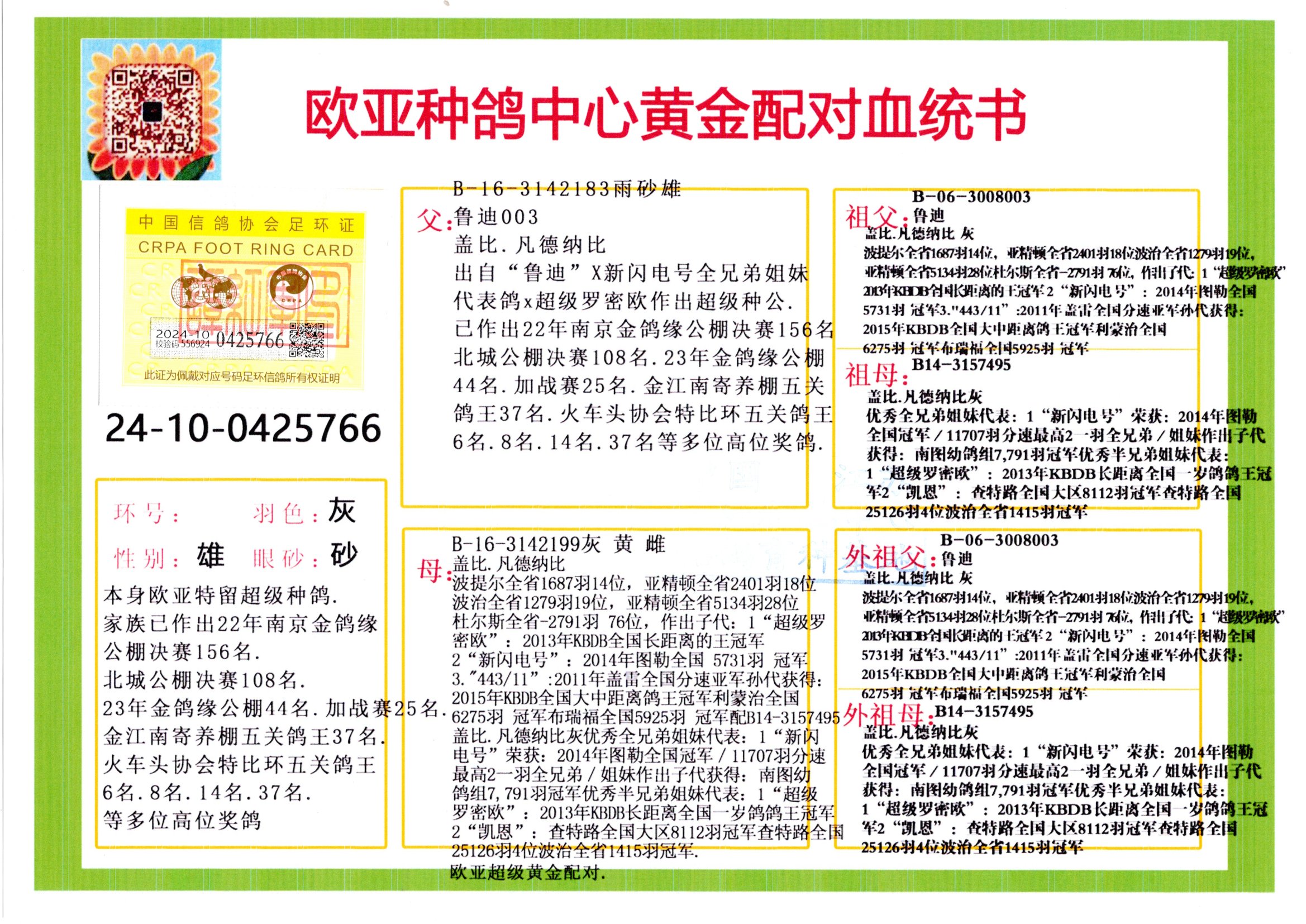 24年秋南京特比環(huán)歐亞榮獲大團(tuán)體冠軍.小團(tuán)體冠軍551公里大特比13名.14名.16名.19名.20名.21名.24名.26名.27名.28名.42名.52名.54名.57名.65名.66名.68名.70名.71名.72名.74名.76名.80名.82名.83名.84名.85名.86名.90名.92名.110名.116名.121名.122名.128名.131名.158名.161名.164名.165名.166名.172名.174名.177名.182名.195名.196名.201名.205名.208名.210名.216名.253名.269名.275名.276名.294名.296名.299名,,24年秋云南天南銅都公棚決賽415名.天南銅都小棚決賽409名.云南玉活公棚決賽102名.490名.團(tuán)體32名上籠二羽進(jìn)二羽,天南銅都大棚506公里決賽445名。熱烈祝賀河北省巨鹿縣李蘭生老師用歐亞泰山號血系連續(xù)十一年奪冠軍,河北省國家賽冠軍.全國季軍等多次前十名高位,揚(yáng)州王軍王總用歐亞利奧24年春季獲山東翔宇公棚決賽33名蓋比53名。南京劉正龍劉總用歐亞蓋比獲得24年秋山東濰坊國際公棚決賽42名.精英賽30名.三關(guān)鴿王71名.決賽86名.加站賽16名.南京市特比環(huán)A組鴿王9名.B組鴿王5名.6名.C組鴿王5名.精英賽冠軍4名.技能賽A組冠軍4名.5名.秦淮區(qū)特比環(huán)榮獲15名.46名.48名.87名。四川西昌徐亮徐總用歐亞利奧獲得涼山州聚友決賽177名.第二關(guān)亞軍雙關(guān)鴿王19名.三關(guān)鴿王105名.云南豪庭公棚決賽603名。熱烈祝賀24年四川重慶翔園鴿舍用歐亞泰山號榮獲春季400公里冠軍.秋季500公里冠軍,河北王總用詹森X利奧獲得千羽千翔公棚400公里冠軍,廣東蔡楷煥榮獲24年秋愛好者 賽鴿俱樂部三關(guān)鴿王季軍.一關(guān)420公里99名.二關(guān)450公里11名.三關(guān)520公里32名.單關(guān)季軍.7名.12名,江西李衛(wèi)興榮獲貴州紅楓公棚8名.共翔俱樂部寄養(yǎng)棚四關(guān)綜合鴿王30名.一關(guān)400公里78名.二關(guān)500公里55名.三關(guān)520公里37名.四關(guān)500公里57名.同父母獲公棚18名.雷鳴獲得武漢黃浦育翔中心冠軍,四川陳文獲得四川明鴻俱樂部300公里夢幻2名.3名.4名.9名.10名.13名.14名.15名.31名.34名.40名.41名.42名.43名.69名.71名.72名.73名.74名.94名.95名.97名.98名.99名.419公里決賽榮獲總冠軍7名.總共歸巢9羽,四川徐亮獲豪庭決賽603名,山西鄭勇獲得山西泰鑫公棚決賽255名詹森紅狐,熱烈祝賀馬總獲得開爾(飛躍隊(duì))決賽9名獲獎(jiǎng)金1310000萬元.第一關(guān)52名,天津津福資賽180公里96名.獲獎(jiǎng)金429543萬元,歐亞支持全國鴿友24年秋多人報(bào)喜 祝大家取得更好成績,給歐亞報(bào)喜鴿友歐亞決定給每人贈送一羽超級種鴿。歐亞俱樂部特比環(huán)多關(guān)鴿王成績:15年秋淮安特比環(huán)黑色星期一全會上籠9700多羽,當(dāng)天無鴿歸巢,第二天全會歸巢357羽,本舍歸巢158羽.前十名八羽.前一百名歸巢57羽,16年春季獲五關(guān)鴿王總冠軍,總亞軍四名.六名.七名.九名.十名.晶藝俱樂部520公里冠亞季軍5名.6名.7名.9名.11名等,火車頭冠軍.季軍6名.8名.9名.10名,16年秋晶藝俱樂部特比環(huán)520公里亞軍.季軍4名.6名.7名.9名,15年春南京白下特比環(huán)冠軍.亞軍.季軍6名.7名.8名.9名.10名.指定鴿A B組獲得冠軍.亞軍.季軍4名.5名.,17年淮安特比環(huán)亞軍.4名.5名.7名.8名.10名.六關(guān)鴿王總冠軍.4名.6名.9名.10名,寄養(yǎng)棚宿遷劉總20羽特比環(huán)獲冠軍.季軍.4名.7名.8名.9名等。18年榮獲萬羽特比環(huán)六關(guān)鴿王總冠軍.總亞軍.總季軍.6名.8名.十名.單關(guān)四羽冠軍.二羽亞軍.四羽季軍.前十名27羽。19年秋萬羽特比環(huán)六關(guān)鴿王總亞軍.總季軍.5名.8名等,單關(guān)二羽冠軍.三羽亞軍.一羽季軍前十名31羽。20年秋淮安市鴿會四關(guān)特比環(huán)大賽風(fēng)雨無阻鴿王亞軍.鴿王六名,金品俱樂部萬羽特比環(huán)六關(guān)鴿王總冠軍,總亞軍.四名.五名.六名.七名.八名.十名.前二百名鴿王35羽,單關(guān)冠亞季軍前十名四十多羽,火車頭五關(guān)鴿王季軍.六名.八名.前二百名鴿王十七羽。20年春榮獲淮安五區(qū)一市四關(guān)鴿王總冠軍.亞軍.四名.八名.九名。21年秋榮獲金品萬羽特比環(huán)大賽六關(guān)鴿王總亞軍.總季軍.四名.七名.九名.十名.單關(guān)冠亞軍季軍前十名三十多羽;疖囶^協(xié)會鴿王六名.七名.十名.單關(guān)前十名十七羽。22年秋榮獲鴿王總冠軍.總亞軍.5名.7名.8名.9名.11名.單關(guān)冠亞季軍前十名三十多羽,第一關(guān)單關(guān)前二百名四十多羽,第二關(guān)前二百名三十多羽,第三關(guān)前二百名四十多羽,第四關(guān)前二百名四十多羽,第五關(guān)前一百名53羽。23年秋榮獲鴿王季軍.五名.八名.十名.13名.17名.20名.27名等多羽鴿王.單關(guān)前十名二十多羽。公棚.寄養(yǎng)棚部分成績:16年秋寧夏黃河公棚總冠軍電腦戈馬力指定通炮冠軍,17年送八羽參賽獲得鴿王八名進(jìn)獎(jiǎng)四名,支持韓總榮獲八名。支持鴿友榮獲寧夏中衛(wèi)公棚決賽總冠軍.精英賽冠軍,支持18年寧夏黃河公棚決賽冠軍詹森X泰山。安徽鼎博寄養(yǎng)棚院內(nèi)外四關(guān)鴿王總冠軍.鴿王十七名.三十七名同窩,鴿王39名.42名.58名.67名。18年山東公棚預(yù)賽冠軍.決賽65名.送八羽進(jìn)獎(jiǎng)五羽.指定獲奔馳汽車一輛。支持鴿友獲得云南藍(lán)云公棚冠軍.蓋比X佛卡門。支持鴿友榮獲云南銀集公棚決賽冠軍 詹森427X520血系 速度賽6700羽冠軍。17年榮獲金馬俱樂部寄養(yǎng)棚四關(guān)鴿王總冠軍.季軍.六名.八名.第一關(guān)冠軍.亞軍.季軍