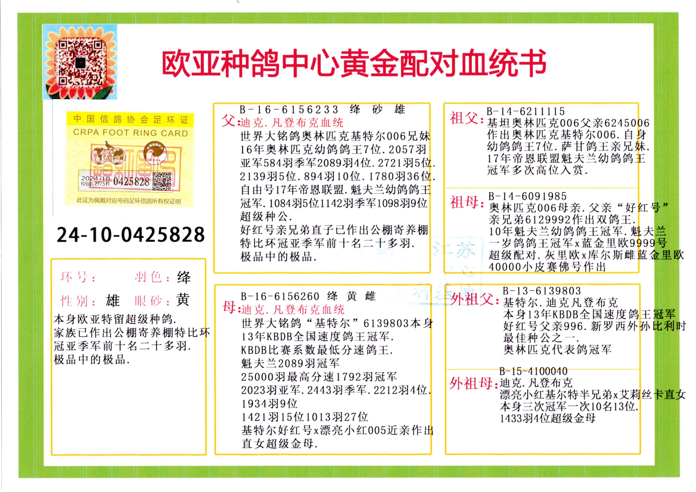24年秋南京特比環(huán)歐亞榮獲大團體冠軍.小團體冠軍551公里大特比13名.14名.16名.19名.20名.21名.24名.26名.27名.28名.42名.52名.54名.57名.65名.66名.68名.70名.71名.72名.74名.76名.80名.82名.83名.84名.85名.86名.90名.92名.110名.116名.121名.122名.128名.131名.158名.161名.164名.165名.166名.172名.174名.177名.182名.195名.196名.201名.205名.208名.210名.216名.253名.269名.275名.276名.294名.296名.299名,,24年秋云南天南銅都公棚決賽415名.天南銅都小棚決賽409名.云南玉活公棚決賽102名.490名.團體32名上籠二羽進二羽,天南銅都大棚506公里決賽445名。熱烈祝賀河北省巨鹿縣李蘭生老師用歐亞泰山號血系連續(xù)十一年奪冠軍,河北省國家賽冠軍.全國季軍等多次前十名高位,揚州王軍王總用歐亞利奧24年春季獲山東翔宇公棚決賽33名蓋比53名。南京劉正龍劉總用歐亞蓋比獲得24年秋山東濰坊國際公棚決賽42名.精英賽30名.三關(guān)鴿王71名.決賽86名.加站賽16名.南京市特比環(huán)A組鴿王9名.B組鴿王5名.6名.C組鴿王5名.精英賽冠軍4名.技能賽A組冠軍4名.5名.秦淮區(qū)特比環(huán)榮獲15名.46名.48名.87名。四川西昌徐亮徐總用歐亞利奧獲得涼山州聚友決賽177名.第二關(guān)亞軍雙關(guān)鴿王19名.三關(guān)鴿王105名.云南豪庭公棚決賽603名。熱烈祝賀24年四川重慶翔園鴿舍用歐亞泰山號榮獲春季400公里冠軍.秋季500公里冠軍,河北王總用詹森X利奧獲得千羽千翔公棚400公里冠軍,廣東蔡楷煥榮獲24年秋愛好者 賽鴿俱樂部三關(guān)鴿王季軍.一關(guān)420公里99名.二關(guān)450公里11名.三關(guān)520公里32名.單關(guān)季軍.7名.12名,江西李衛(wèi)興榮獲貴州紅楓公棚8名.共翔俱樂部寄養(yǎng)棚四關(guān)綜合鴿王30名.一關(guān)400公里78名.二關(guān)500公里55名.三關(guān)520公里37名.四關(guān)500公里57名.同父母獲公棚18名.雷鳴獲得武漢黃浦育翔中心冠軍,四川陳文獲得四川明鴻俱樂部300公里夢幻2名.3名.4名.9名.10名.13名.14名.15名.31名.34名.40名.41名.42名.43名.69名.71名.72名.73名.74名.94名.95名.97名.98名.99名.419公里決賽榮獲總冠軍7名.總共歸巢9羽,四川徐亮獲豪庭決賽603名,山西鄭勇獲得山西泰鑫公棚決賽255名詹森紅狐,熱烈祝賀馬總獲得開爾(飛躍隊)決賽9名獲獎金1310000萬元.第一關(guān)52名,天津津福資賽180公里96名.獲獎金429543萬元,歐亞支持全國鴿友24年秋多人報喜 祝大家取得更好成績,給歐亞報喜鴿友歐亞決定給每人贈送一羽超級種鴿。歐亞俱樂部特比環(huán)多關(guān)鴿王成績:15年秋淮安特比環(huán)黑色星期一全會上籠9700多羽,當天無鴿歸巢,第二天全會歸巢357羽,本舍歸巢158羽.前十名八羽.前一百名歸巢57羽,16年春季獲五關(guān)鴿王總冠軍,總亞軍四名.六名.七名.九名.十名.晶藝俱樂部520公里冠亞季軍5名.6名.7名.9名.11名等,火車頭冠軍.季軍6名.8名.9名.10名,16年秋晶藝俱樂部特比環(huán)520公里亞軍.季軍4名.6名.7名.9名,15年春南京白下特比環(huán)冠軍.亞軍.季軍6名.7名.8名.9名.10名.指定鴿A B組獲得冠軍.亞軍.季軍4名.5名.,17年淮安特比環(huán)亞軍.4名.5名.7名.8名.10名.六關(guān)鴿王總冠軍.4名.6名.9名.10名,寄養(yǎng)棚宿遷劉總20羽特比環(huán)獲冠軍.季軍.4名.7名.8名.9名等。18年榮獲萬羽特比環(huán)六關(guān)鴿王總冠軍.總亞軍.總季軍.6名.8名.十名.單關(guān)四羽冠軍.二羽亞軍.四羽季軍.前十名27羽。19年秋萬羽特比環(huán)六關(guān)鴿王總亞軍.總季軍.5名.8名等,單關(guān)二羽冠軍.三羽亞軍.一羽季軍前十名31羽。20年秋淮安市鴿會四關(guān)特比環(huán)大賽風雨無阻鴿王亞軍.鴿王六名,金品俱樂部萬羽特比環(huán)六關(guān)鴿王總冠軍,總亞軍.四名.五名.六名.七名.八名.十名.前二百名鴿王35羽,單關(guān)冠亞季軍前十名四十多羽,火車頭五關(guān)鴿王季軍.六名.八名.前二百名鴿王十七羽。20年春榮獲淮安五區(qū)一市四關(guān)鴿王總冠軍.亞軍.四名.八名.九名。21年秋榮獲金品萬羽特比環(huán)大賽六關(guān)鴿王總亞軍.總季軍.四名.七名.九名.十名.單關(guān)冠亞軍季軍前十名三十多羽。火車頭協(xié)會鴿王六名.七名.十名.單關(guān)前十名十七羽。22年秋榮獲鴿王總冠軍.總亞軍.5名.7名.8名.9名.11名.單關(guān)冠亞季軍前十名三十多羽,第一關(guān)單關(guān)前二百名四十多羽,第二關(guān)前二百名三十多羽,第三關(guān)前二百名四十多羽,第四關(guān)前二百名四十多羽,第五關(guān)前一百名53羽。23年秋榮獲鴿王季軍.五名.八名.十名.13名.17名.20名.27名等多羽鴿王.單關(guān)前十名二十多羽。公棚.寄養(yǎng)棚部分成績:16年秋寧夏黃河公棚總冠軍電腦戈馬力指定通炮冠軍,17年送八羽參賽獲得鴿王八名進獎四名,支持韓總榮獲八名。支持鴿友榮獲寧夏中衛(wèi)公棚決賽總冠軍.精英賽冠軍,支持18年寧夏黃河公棚決賽冠軍詹森X泰山。安徽鼎博寄養(yǎng)棚院內(nèi)外四關(guān)鴿王總冠軍.鴿王十七名.三十七名同窩,鴿王39名.42名.58名.67名。18年山東公棚預(yù)賽冠軍.決賽65名.送八羽進獎五羽.指定獲奔馳汽車一輛。支持鴿友獲得云南藍云公棚冠軍.蓋比X佛卡門。支持鴿友榮獲云南銀集公棚決賽冠軍 詹森427X520血系 速度賽6700羽冠軍。17年榮獲金馬俱樂部寄養(yǎng)棚四關(guān)鴿王總冠軍.季軍.六名.八名.第一關(guān)冠軍.亞軍.季軍四名.七名.十一名.金牌教練獎。支持鴿友18年北京費翔公棚預(yù)賽九名電腦X桑杰士,