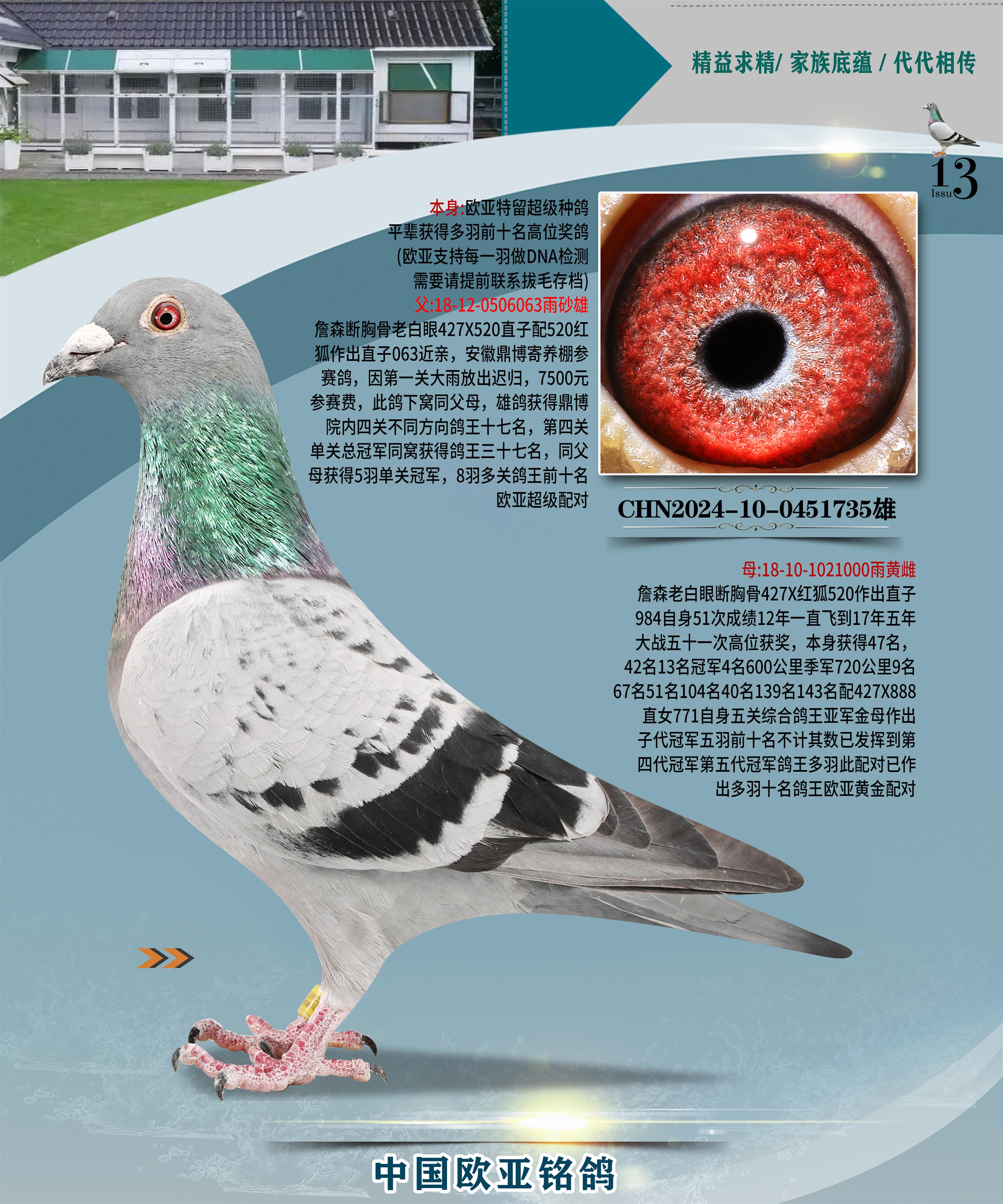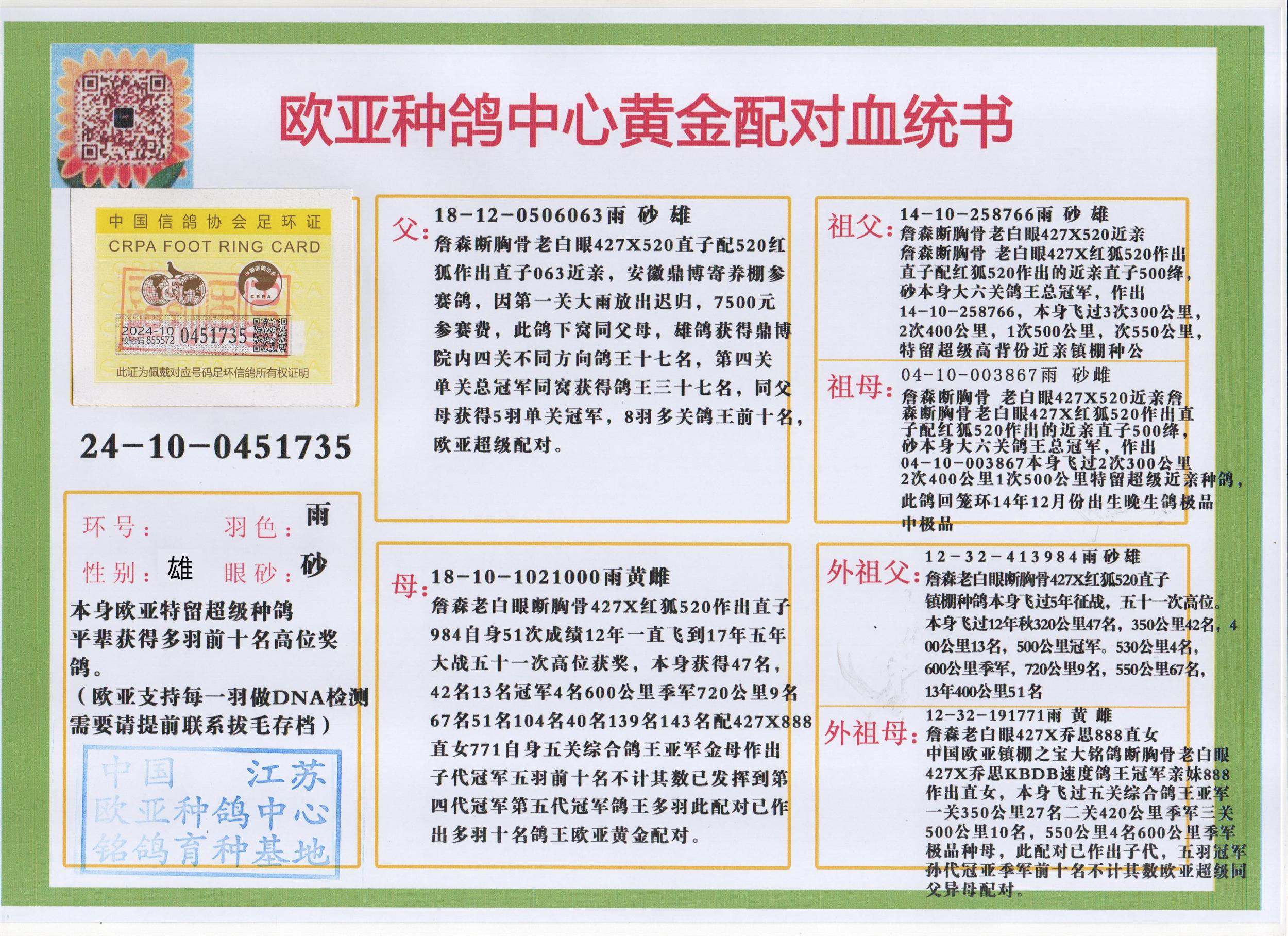 24年秋南京特比環(huán)歐亞榮獲大團(tuán)體冠軍.小團(tuán)體冠軍551公里大特比13名.14名.16名.19名.20名.21名.24名.26名.27名.28名.42名.52名.54名.57名.65名.66名.68名.70名.71名.72名.74名.76名.80名.82名.83名.84名.85名.86名.90名.92名.110名.116名.121名.122名.128名.131名.158名.161名.164名.165名.166名.172名.174名.177名.182名.195名.196名.201名.205名.208名.210名.216名.253名.269名.275名.276名.294名.296名.299名,,24年秋云南天南銅都公棚決賽415名.天南銅都小棚決賽409名.云南玉活公棚決賽102名.490名.團(tuán)體32名上籠二羽進(jìn)二羽,天南銅都大棚506公里決賽445名。熱烈祝賀河北省巨鹿縣李蘭生老師用歐亞泰山號血系連續(xù)十一年奪冠軍,河北省國家賽冠軍.全國季軍等多次前十名高位,揚(yáng)州王軍王總用歐亞利奧24年春季獲山東翔宇公棚決賽33名蓋比53名。南京劉正龍劉總用歐亞蓋比獲得24年秋山東濰坊國際公棚決賽42名.精英賽30名.三關(guān)鴿王71名.決賽86名.加站賽16名.南京市特比環(huán)A組鴿王9名.B組鴿王5名.6名.C組鴿王5名.精英賽冠軍4名.技能賽A組冠軍4名.5名.秦淮區(qū)特比環(huán)榮獲15名.46名.48名.87名。四川西昌徐亮徐總用歐亞利奧獲得涼山州聚友決賽177名.第二關(guān)亞軍雙關(guān)鴿王19名.三關(guān)鴿王105名.云南豪庭公棚決賽603名。熱烈祝賀24年四川重慶翔園鴿舍用歐亞泰山號榮獲春季400公里冠軍.秋季500公里冠軍,河北王總用詹森X利奧獲得千羽千翔公棚400公里冠軍,廣東蔡楷煥榮獲24年秋愛好者 賽鴿俱樂部三關(guān)鴿王季軍.一關(guān)420公里99名.二關(guān)450公里11名.三關(guān)520公里32名.單關(guān)季軍.7名.12名,江西李衛(wèi)興榮獲貴州紅楓公棚8名.共翔俱樂部寄養(yǎng)棚四關(guān)綜合鴿王30名.一關(guān)400公里78名.二關(guān)500公里55名.三關(guān)520公里37名.四關(guān)500公里57名.同父母獲公棚18名.雷鳴獲得武漢黃浦育翔中心冠軍,四川陳文獲得四川明鴻俱樂部300公里夢幻2名.3名.4名.9名.10名.13名.14名.15名.31名.34名.40名.41名.42名.43名.69名.71名.72名.73名.74名.94名.95名.97名.98名.99名.419公里決賽榮獲總冠軍7名.總共歸巢9羽,四川徐亮獲豪庭決賽603名,山西鄭勇獲得山西泰鑫公棚決賽255名詹森紅狐,熱烈祝賀馬總獲得開爾(飛躍隊(duì))決賽9名獲獎金1310000萬元.第一關(guān)52名,天津津福資賽180公里96名.獲獎金429543萬元,歐亞支持全國鴿友24年秋多人報(bào)喜 祝大家取得更好成績,給歐亞報(bào)喜鴿友歐亞決定給每人贈送一羽超級種鴿。歐亞俱樂部特比環(huán)多關(guān)鴿王成績:15年秋淮安特比環(huán)黑色星期一全會上籠9700多羽,當(dāng)天無鴿歸巢,第二天全會歸巢357羽,本舍歸巢158羽.前十名八羽.前一百名歸巢57羽,16年春季獲五關(guān)鴿王總冠軍,總亞軍四名.六名.七名.九名.十名.晶藝俱樂部520公里冠亞季軍5名.6名.7名.9名.11名等,火車頭冠軍.季軍6名.8名.9名.10名,16年秋晶藝俱樂部特比環(huán)520公里亞軍.季軍4名.6名.7名.9名,15年春南京白下特比環(huán)冠軍.亞軍.季軍6名.7名.8名.9名.10名.指定鴿A B組獲得冠軍.亞軍.季軍4名.5名.,17年淮安特比環(huán)亞軍.4名.5名.7名.8名.10名.六關(guān)鴿王總冠軍.4名.6名.9名.10名,寄養(yǎng)棚宿遷劉總20羽特比環(huán)獲冠軍.季軍.4名.7名.8名.9名等。18年榮獲萬羽特比環(huán)六關(guān)鴿王總冠軍.總亞軍.總季軍.6名.8名.十名.單關(guān)四羽冠軍.二羽亞軍.四羽季軍.前十名27羽。19年秋萬羽特比環(huán)六關(guān)鴿王總亞軍.總季軍.5名.8名等,單關(guān)二羽冠軍.三羽亞軍.一羽季軍前十名31羽。20年秋淮安市鴿會四關(guān)特比環(huán)大賽風(fēng)雨無阻鴿王亞軍.鴿王六名,金品俱樂部萬羽特比環(huán)六關(guān)鴿王總冠軍,總亞軍.四名.五名.六名.七名.八名.十名.前二百名鴿王35羽,單關(guān)冠亞季軍前十名四十多羽,火車頭五關(guān)鴿王季軍.六名.八名.前二百名鴿王十七羽。20年春榮獲淮安五區(qū)一市四關(guān)鴿王總冠軍.亞軍.四名.八名.九名。21年秋榮獲金品萬羽特比環(huán)大賽六關(guān)鴿王總亞軍.總季軍.四名.七名.九名.十名.單關(guān)冠亞軍季軍前十名三十多羽。火車頭協(xié)會鴿王六名.七名.十名.單關(guān)前十名十七羽。22年秋榮獲鴿王總冠軍.總亞軍.5名.7名.8名.9名.11名.單關(guān)冠亞季軍前十名三十多羽,第一關(guān)單關(guān)前二百名四十多羽,第二關(guān)前二百名三十多羽,第三關(guān)前二百名四十多羽,第四關(guān)前二百名四十多羽,第五關(guān)前一百名53羽。23年秋榮獲鴿王季軍.五名.八名.十名.13名.17名.20名.27名等多羽鴿王.單關(guān)前十名二十多羽。公棚.寄養(yǎng)棚部分成績:16年秋寧夏黃河公棚總冠軍電腦戈馬力指定通炮冠軍,17年送八羽參賽獲得鴿王八名進(jìn)獎四名,支持韓總榮獲八名。支持鴿友榮獲寧夏中衛(wèi)公棚決賽總冠軍.精英賽冠軍,支持18年寧夏黃河公棚決賽冠軍詹森X泰山。安徽鼎博寄養(yǎng)棚院內(nèi)外四關(guān)鴿王總冠軍.鴿王十七名.三十七名同窩,鴿王39名.42名.58名.67名。18年山東公棚預(yù)賽冠軍.決賽65名.送八羽進(jìn)獎五羽.指定獲奔馳汽車一輛。支持鴿友獲得云南藍(lán)云公棚冠軍.蓋比X佛卡門。支持鴿友榮獲云南銀集公棚決賽冠軍 詹森427X520血系 速度賽6700羽冠軍。17年榮獲金馬俱樂部寄養(yǎng)棚四關(guān)鴿王總冠軍.季軍.六名.八名.第一關(guān)冠軍.亞軍.季軍四名.七名.十一名.金