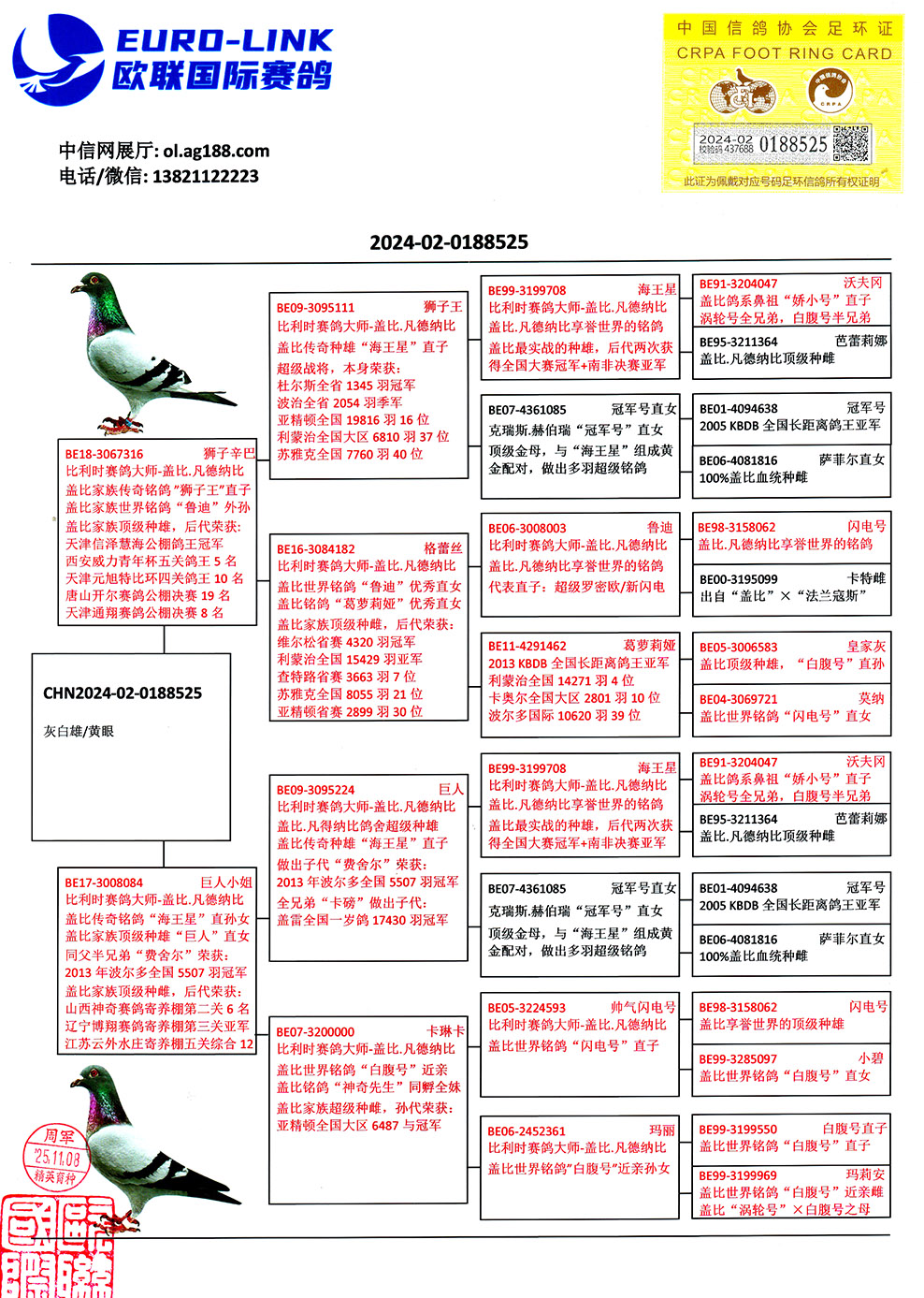 | 1607890 | 奶酪世界銘鴿“240”近親直孫 | ¥3900元 | 4次 |