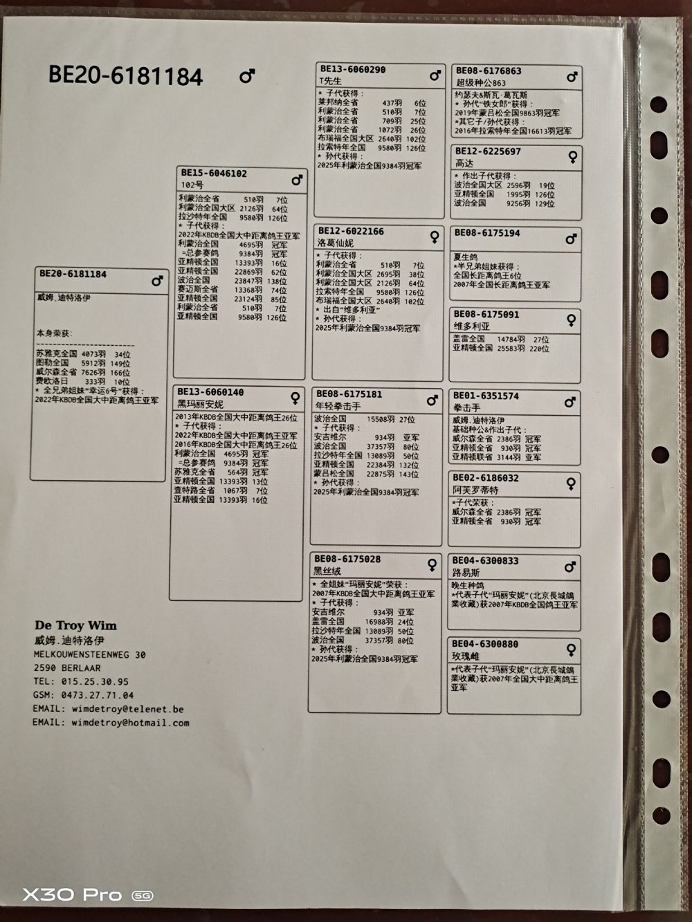 晟捷國(guó)際鴿業(yè):鴿主養(yǎng)鴿30余載,引進(jìn)世界銘鴿,公棚鴿王,地方賽鴿王,前名次鴿多羽。鴿舍主血:利奧賀爾曼斯,楊胡曼斯哈利,奶酪,胡本,克拉克,詹森紅狐,麥克斯,51次,019,桑杰士,馬克羅森斯,戈馬力,速霸龍,東方不敗,喬斯佛卡門,小迪迪,,甘納斯,芬妮卡5000 晟捷國(guó)際鴿業(yè):代表成績(jī):2009年獲得惠翔3名,團(tuán)體冠軍, 2006年大鵝島公棚預(yù)賽21名,決賽84名。 2007年盛世公棚500公里決賽182名296名425名。 2008年盛世公棚500公里決賽61名,276名。 2009年獲得千山公棚決賽9名,鴿王10名.... 2011年獲得祺陽(yáng)牧業(yè)決賽17名37名243名,團(tuán)體5名。 2014年獲得丹東祺陽(yáng)牧業(yè)決賽138名 2015年海逸國(guó)際公棚393名鴿王11名 2016年北戴河六藝國(guó)際公棚預(yù)賽26名,決賽51名。 藍(lán)湖欲鴿決賽73名,精英賽冠軍。 2017年大安信和公棚決賽233名300名414名。 北戴河六藝國(guó)際公棚預(yù)賽151名決賽145名 2018年春潮公棚決賽195名,376名 2019年綏中縱誠(chéng)公棚500公里決賽59名 大慶臻翔公棚500公里決賽43名 海逸國(guó)際公棚四關(guān)鴿王13名 。