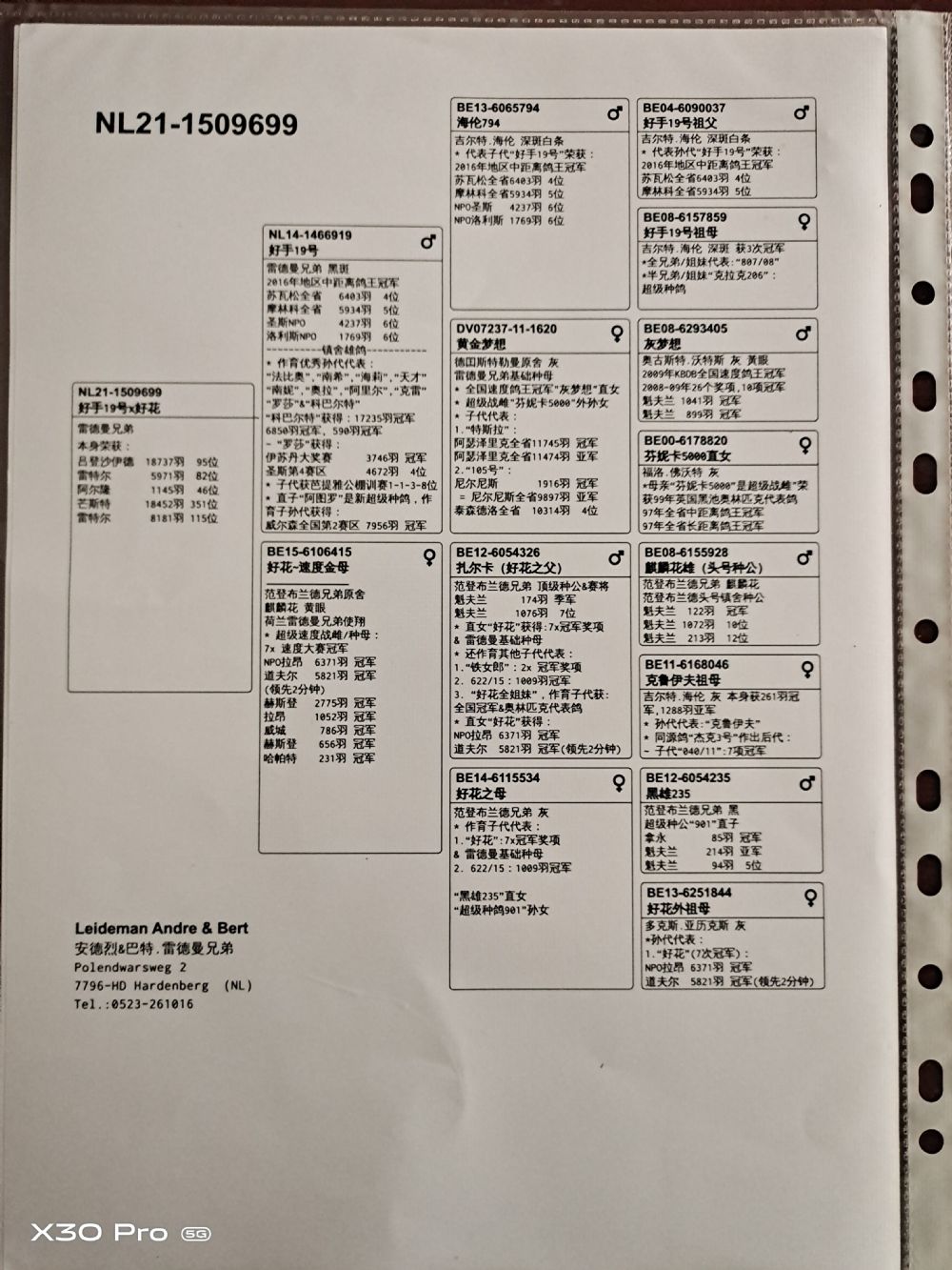 晟捷國際鴿業(yè):鴿主養(yǎng)鴿30余載,引進世界銘鴿,公棚鴿王,地方賽鴿王,前名次鴿多羽。鴿舍主血:利奧賀爾曼斯,楊胡曼斯哈利,奶酪,胡本,克拉克,詹森紅狐,麥克斯,51次,019,桑杰士,馬克羅森斯,戈馬力,速霸龍,東方不敗,喬斯佛卡門,小迪迪,,甘納斯,芬妮卡5000 晟捷國際鴿業(yè):代表成績:2009年獲得惠翔3名,團體冠軍, 2006年大鵝島公棚預賽21名,決賽84名。 2007年盛世公棚500公里決賽182名296名425名。 2008年盛世公棚500公里決賽61名,276名。 2009年獲得千山公棚決賽9名,鴿王10名.... 2011年獲得祺陽牧業(yè)決賽17名37名243名,團體5名。 2014年獲得丹東祺陽牧業(yè)決賽138名 2015年海逸國際公棚393名鴿王11名 2016年北戴河六藝國際公棚預賽26名,決賽51名。 藍湖欲鴿決賽73名,精英賽冠軍。 2017年大安信和公棚決賽233名300名414名。 北戴河六藝國際公棚預賽151名決賽145名 2018年春潮公棚決賽195名,376名 2019年綏中縱誠公棚500公里決賽59名 大慶臻翔公棚500公里決賽43名 海逸國際公棚四關鴿王13名 。