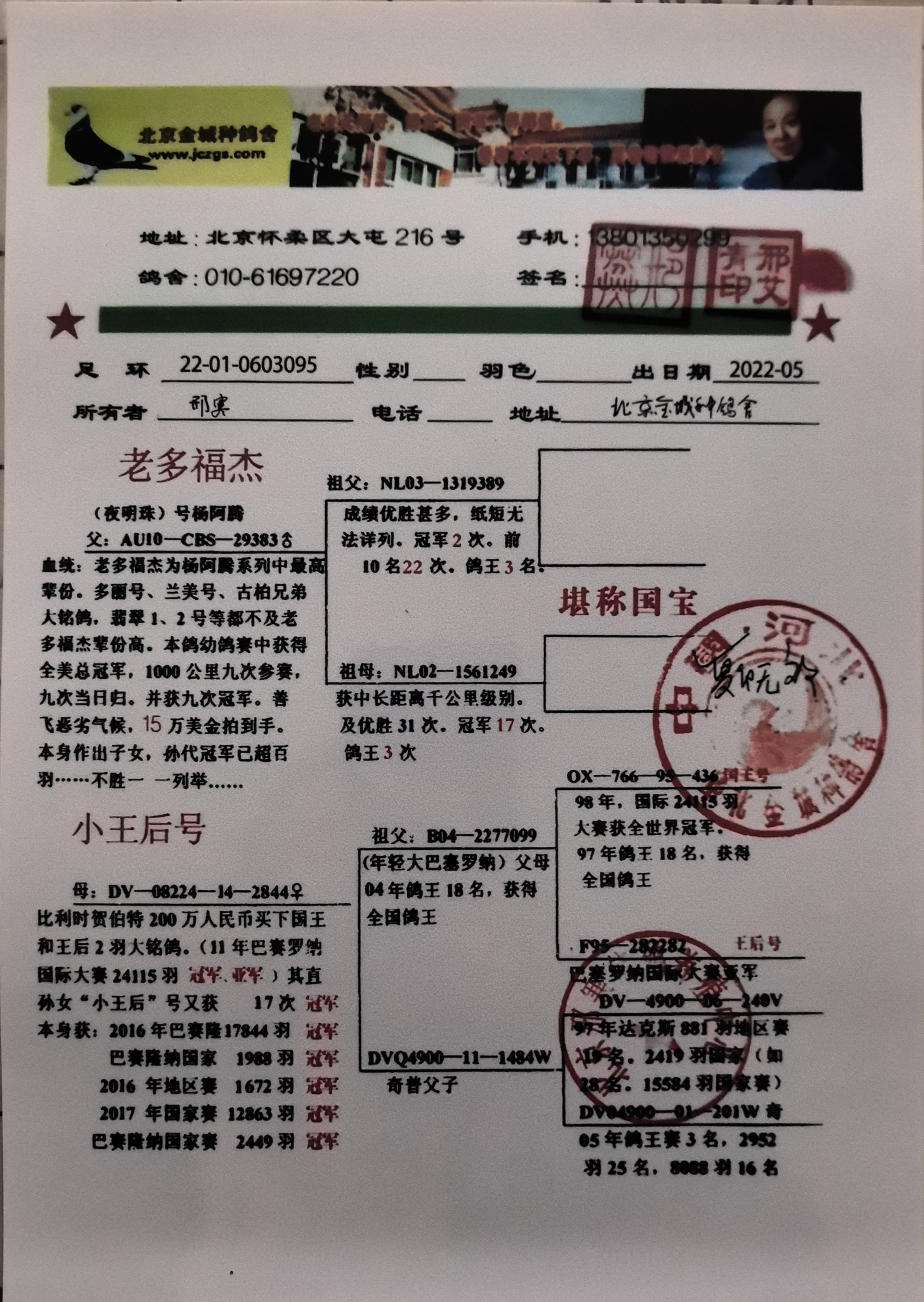 北京金城種鴿舍老多福杰(夜明珠)號楊阿騰