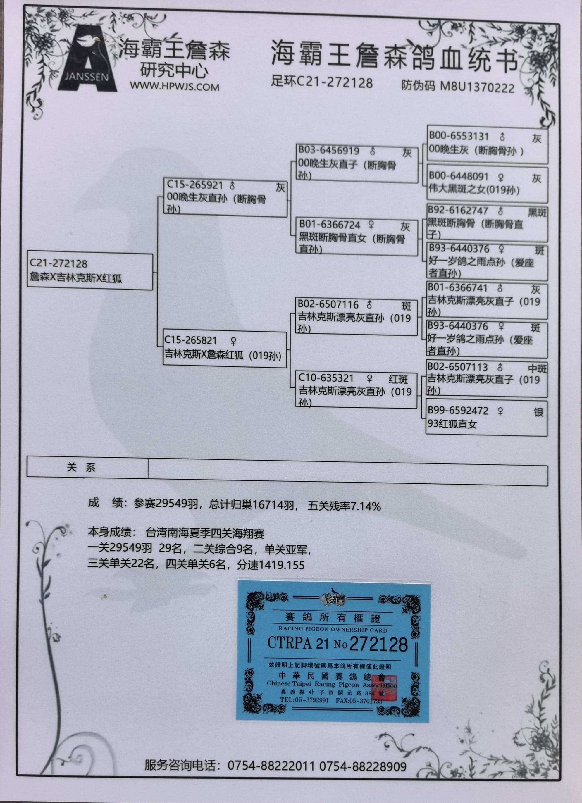 1610358 臺灣飛鴻竟翔詹森斷胸骨血系本身榮獲五關(guān)綜合5名 ¥200元 1次