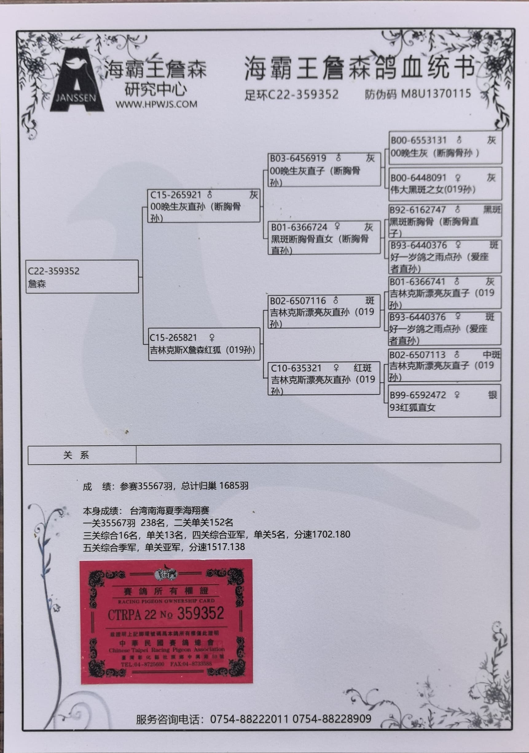 - 當(dāng)前查看拍賣鴿:臺灣海霸王詹森血系本身榮獲五関綜合季軍