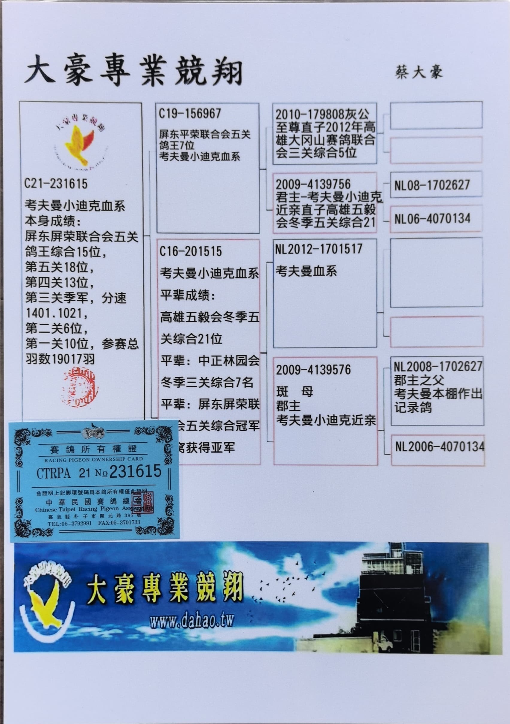 - 當(dāng)前查看拍賣鴿:臺(tái)灣大豪專業(yè)競翔考夫曼小迪克血系本身成績