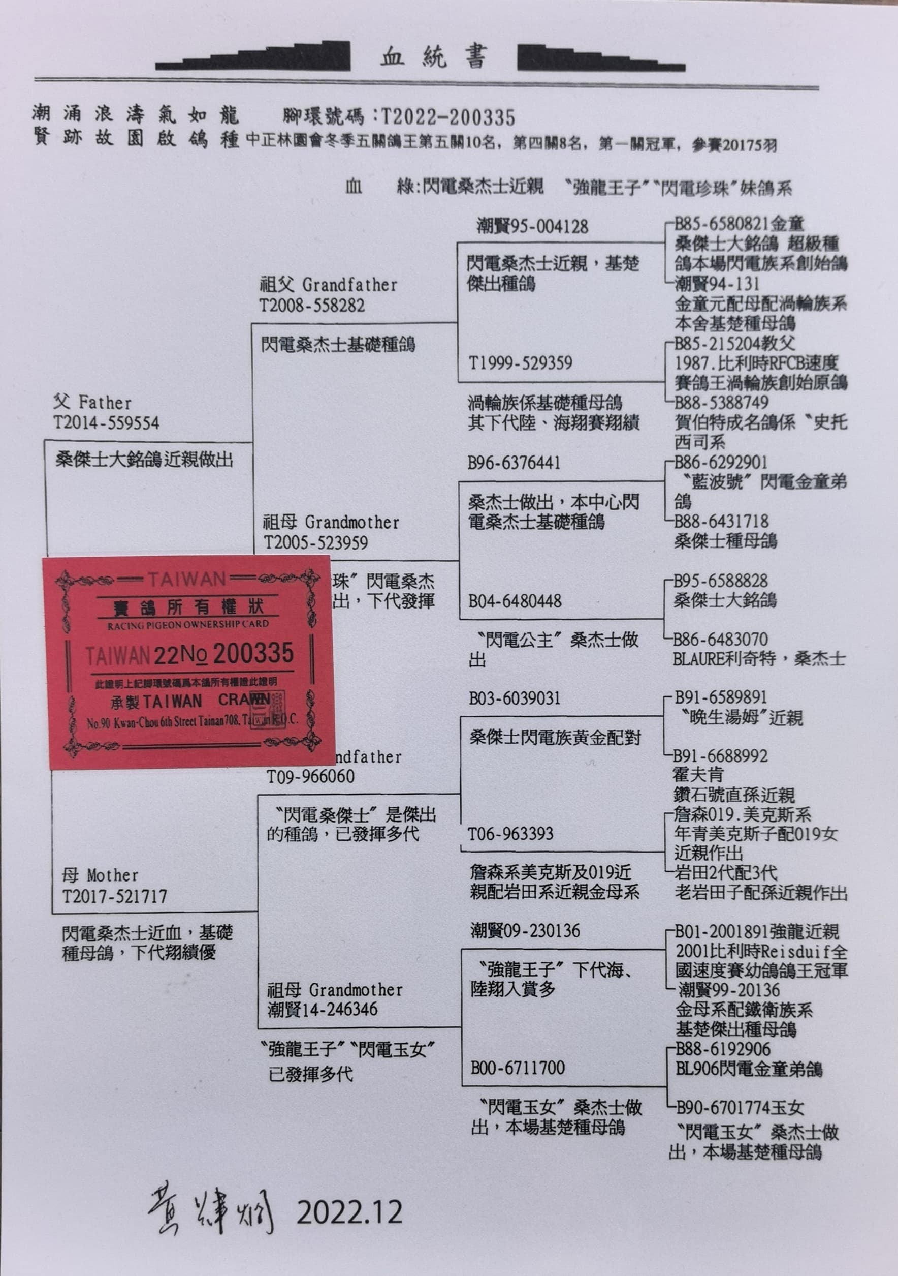 1610693 臺灣飛鴻賽鴿竟翔作育本身成績五関綜合12名 ¥200元 1次