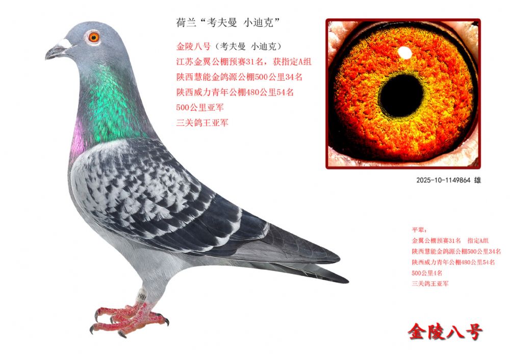 金陵八號(喬花飛奴) 2020年獲甘肅慶陽帝暉公棚:第二關300公里鴿王季軍!     第三關400公里鴿王冠軍!    第四關500公里鴿王亞軍!