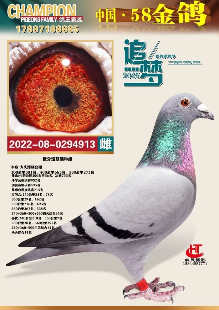 此羽種鴿是22年公棚拍進(jìn)30羽種鴿之一,23年淘汰28羽僅留下唯一一羽雌鴿,作出后代公棚試驗(yàn)決賽分速低于千米寶來的一羽低分速種雌,個(gè)體中等偏大,上手完美