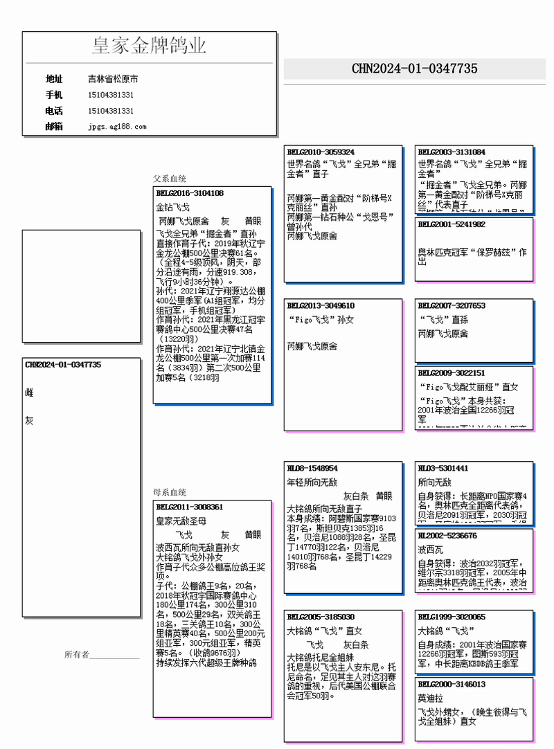 直接作育子代:2019年秋遼寧金龍公棚500公里決賽61名。(全程4-5級頂風,陰天,部分沿途有雨,分速919.308,飛行9小時36分鐘)。