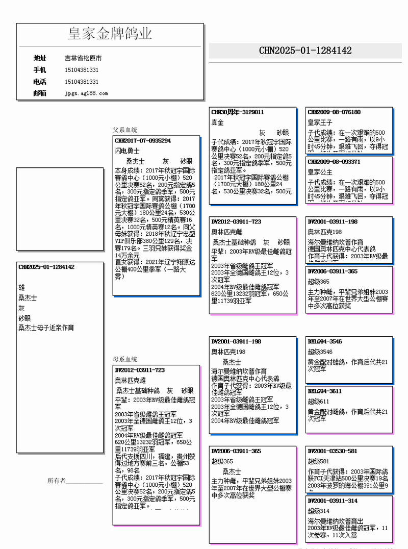 本身成績(jī):2017年秋冠宇國(guó)際賽鴿中心(1000元小棚)520公里決賽52名,200元指定鴿5名,300元指定鴿季軍,500元指定鴿亞軍。同窩獲得:2017年秋冠宇國(guó)際賽鴿公棚(1700元大棚)180公里24名,530公里決賽32名,500元精英賽16名,1000元精英賽12名。同父母妹獲得:2018年秋遼寧忠盛VIP俱樂部380公里129名,決賽179名。三羽兄妹獲得獎(jiǎng)金14萬余元