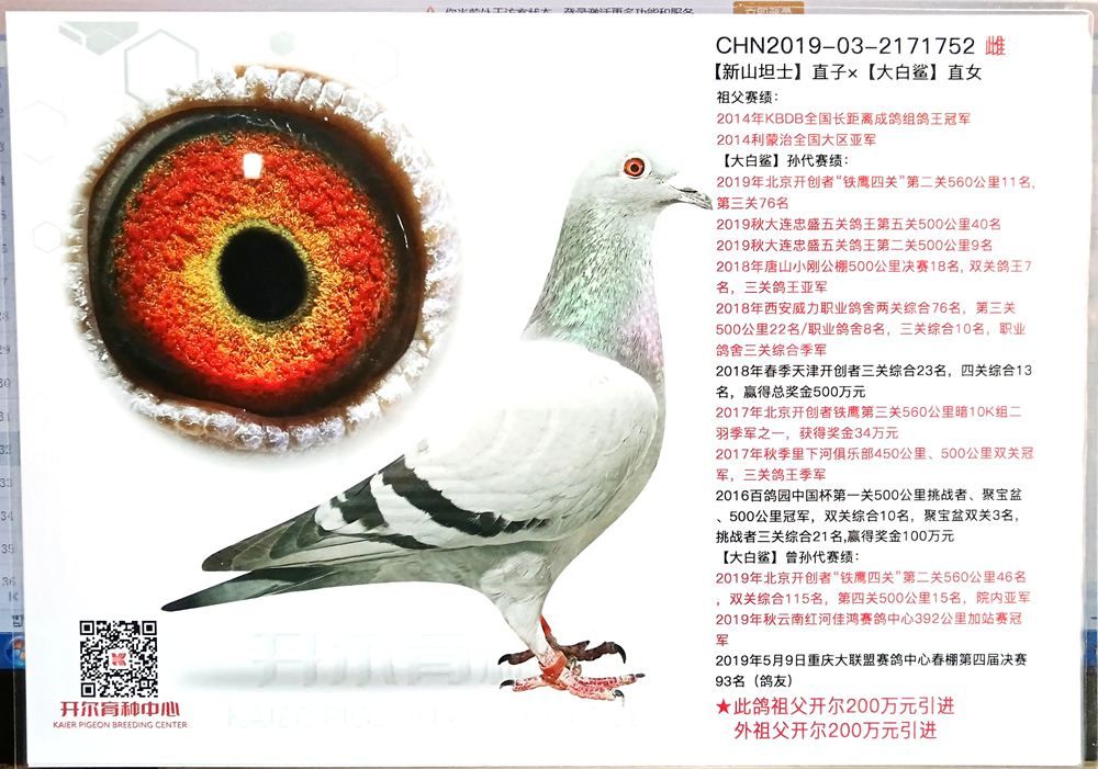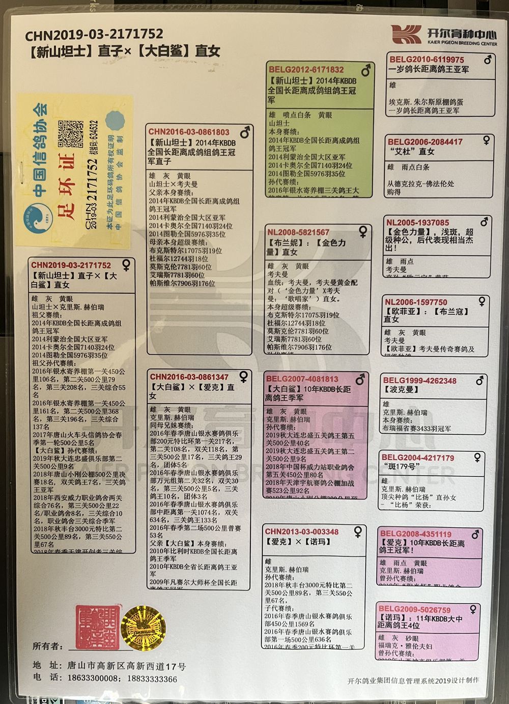父:本身:CHN2016-03-0861803 【新山坦士】2014年KBDB 全國長距離成鴿組鴿王冠軍直子 雄 灰 黃眼 山坦士×考夫曼父親本身賽績: 2014年KBDB全國長距離成鴿組鴿王冠軍;2014利蒙治全國大區(qū)亞軍2014卡奧爾全國7140羽24位;2014圖勒全國5976羽35位;母親本身超級賽績: 布克斯特爾17075羽19位杜福爾12744羽18位;莫斯克倫7781羽60位;艾瑞斯7781羽60位;帕斯維爾7906羽176位